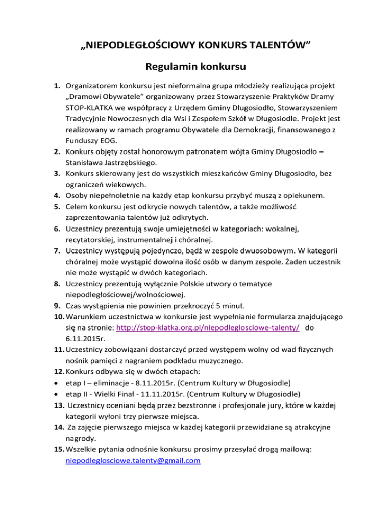 „NIEPODLEGŁOŚCIOWY KONKURS TALENTÓW” Regulamin konkursu 1. Organizatorem konkursu jest nieformalna grupa młodzieży realizująca projekt „Dramowi Obywatele” organizowany przez Stowarzyszenie Praktyków Dramy STOP-KLATKA we współpracy z Urzędem Gminy Długosiodło, Stowarzyszeniem Tradycyjnie Nowoczesnych dla Wsi i Zespołem Szkół w Długosiodle. Projekt jest realizowany w ramach programu Obywatele dla Demokracji, finansowanego z Funduszy EOG. 2. Konkurs objęty został honorowym patronatem wójta Gminy Długosiodło – Stanisława Jastrzębskiego. 3. Konkurs skierowany jest do wszystkich mieszkańców Gminy Długosiodło, bez ograniczeń wiekowych. 4. Osoby niepełnoletnie na każdy etap konkursu przybyć muszą z opiekunem. 5. Celem konkursu jest odkrycie nowych talentów, a także możliwość zaprezentowania talentów już odkrytych. 6. Uczestnicy prezentują swoje umiejętności w kategoriach: wokalnej, recytatorskiej, instrumentalnej i chóralnej. 7. Uczestnicy występują pojedynczo, bądź w zespole dwuosobowym. W kategorii chóralnej może wystąpić dowolna ilość osób w danym zespole. Żaden uczestnik nie może wystąpić w dwóch kategoriach. 8. Uczestnicy prezentują wyłącznie Polskie utwory o tematyce niepodległościowej/wolnościowej. 9. Czas wystąpienia nie powinien przekroczyć 5 minut. 10. Warunkiem uczestnictwa w konkursie jest wypełnianie formularza znajdującego się na stronie: http://stop-klatka.org.pl/niepodleglosciowe-talenty/ do 6.11.2015r. 11. Uczestnicy zobowiązani dostarczyć przed występem wolny od wad fizycznych nośnik pamięci z nagraniem podkładu muzycznego. 12. Konkurs odbywa się w dwóch etapach: etap I – eliminacje - 8.11.2015r. (Centrum Kultury w Długosiodle) etap II - Wielki Finał - 11.11.2015r. (Centrum Kultury w Długosiodle) 13. Uczestnicy oceniani będą przez bezstronne i profesjonale jury, które w każdej kategorii wyłoni trzy pierwsze miejsca. 14. Za zajęcie pierwszego miejsca w każdej kategorii przewidziane są atrakcyjne nagrody. 15. Wszelkie pytania odnośnie konkursu prosimy przesyłać drogą mailową: [email protected]