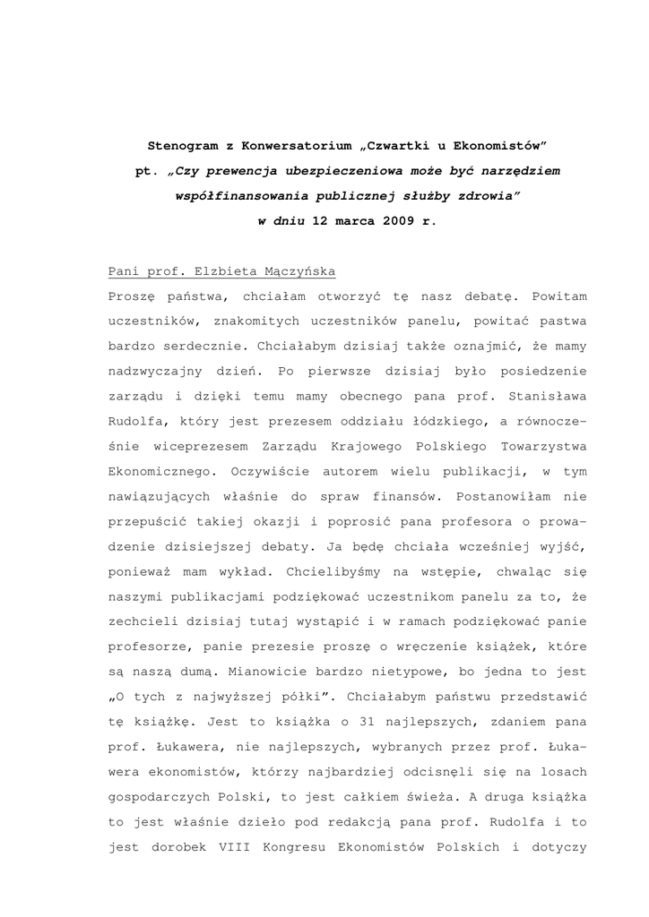 Stenogram z Konwersatorium „Czwartki u Ekonomistów” pt. „Czy prewencja ubezpieczeniowa może być narzędziem współfinansowania publicznej służby zdrowia” w dniu 12 marca 2009 r. Pani prof. Elzbieta Mączyńska Proszę państwa, chciałam otworzyć tę nasz debatę. Powitam uczestników, znakomitych uczestników panelu, powitać pastwa bardzo serdecznie. Chciałabym dzisiaj także oznajmić, że mamy nadzwyczajny dzień. Po pierwsze dzisiaj było posiedzenie zarządu i dzięki temu mamy obecnego pana prof. Stanisława Rudolfa, który jest prezesem oddziału łódzkiego, a równocześnie wiceprezesem Ekonomicznego. nawiązujących Zarządu Oczywiście właśnie do Krajowego autorem spraw Polskiego wielu Towarzystwa publikacji, finansów. w tym Postanowiłam nie przepuścić takiej okazji i poprosić pana profesora o prowadzenie dzisiejszej debaty. Ja będę chciała wcześniej wyjść, ponieważ mam wykład. Chcielibyśmy na wstępie, chwaląc się naszymi publikacjami podziękować uczestnikom panelu za to, że zechcieli dzisiaj tutaj wystąpić i w ramach podziękować panie profesorze, panie prezesie proszę o wręczenie książek, które są naszą dumą. Mianowicie bardzo nietypowe, bo jedna to jest „O tych z najwyższej półki”. Chciałabym państwu przedstawić tę książkę. Jest to książka o 31 najlepszych, zdaniem pana prof. Łukawera, nie najlepszych, wybranych przez prof. Łukawera ekonomistów, którzy najbardziej odcisnęli się na losach gospodarczych Polski, to jest całkiem świeża. A druga książka to jest właśnie dzieło pod redakcją pana prof. Rudolfa i to jest dorobek VIII Kongresu Ekonomistów Polskich i dotyczy 2 Stenogram z posiedzenia „Czwartki u Ekonomistów” - 12 marca 2009 r. sektora finansowego. Także dziękuję państwu bardzo. Panie profesorze oddaję panu salę we władanie. Pan prof. Stanisław Rudolf Bardzo proszę. Dzień dobry państwu. Ja oczywiście krótko, za chwilę państwo będziecie dyskutować na tematy, które dotyczą dzisiejszego seminarium. Chciałem dopowiedzieć, że w dniu dzisiejszym przyjmowaliśmy sprawozdanie z naszej działalności na posiedzeniu prezydium Zarządu Krajowego. Były sprawozdania i merytoryczne i finansowe. Otóż, odbyło się w tej sali 28 konferencji, więc jest to oczywiście bardzo duży dorobek. Jak sięgam pamięcią, to PTE nie przeżywało takiego boomu jeśli chodzi o działalność. Więc pani profesor, pani prezes Mączyńska tak rozkręciła tą działalność, że w tej chwili z trudem może to wszystko opanować, bo każda taka impreza na pewno wiąże się ze sporym wysiłkiem. Nie mówię o innych formach działalności, ale właśnie te tutaj obecne, działalność wydawnicza również. Proszę państwa, ta książka, którą część osób otrzymało, „Sektor finansowy, dylematy i kierunki rozwoju” pod moją redakcją, to jest pierwszy tom z serii kongresowej. Odbył się Kongres Ekonomistów Polskich w grudniu ub. roku i teraz kolejne tomy się ukazują. W tej chwili dwa się ukazały, a teraz jeszcze 6 tomów czeka w kolejce, także w najbliższym czasie będą się ukazywać kolejne prace z różnych dziedzin, oczywiście wszystkie z ekonomii, ale różne aspekty ekonomiczne będą prezentowane. Żeby nie przedłużać, w takim razie jeszcze zabranie głosu raz serdecznie pana doktora panelistów dzisiejszych. państwa witam Śliwińskiego i i poproszę o przedstawienie 3 Stenogram z posiedzenia „Czwartki u Ekonomistów” - 12 marca 2009 r. Pani prof. Elżbieta Mączyńska Proszę państwa jeszcze tylko jedna uwaga techniczna. Mianowicie, jak zwykle wszystkie nasze debaty są nagrywane i z tego potem jest stenogram. Stenogram zamieszczamy na stronach PTE i na stronach wskazanych przez uczestników panelu. Wszystkich wypowiadających się prosimy o przedstawianie się do mikrofonu, nawet jak ktoś jest bardzo znany, bo pani stenografistka nie rozróżnia nas po głosie i później będzie do państwa prośba, żeby państwo ewentualnie, jeśli ktoś uzna za stosowne, autoryzowali swoje wystąpienia. PTE nie rości sobie żadnych praw do tych tekstów, tyle tylko, że rości sobie prawo do zamieszczenia na stronie internetowej. To jest i dobrze i źle Dobrze, dlatego że dociera do całego świata ten teks, a źle to np. niektórzy dziennikarze uznają, że skoro będzie w ciągu tygodnia wisiał stenogram, to mają, że tak powiem gotową życzę miłych informację i nie wszyscy przychodzą. Także obrad i z tą uwagą, że będziemy nagrywani. Proszę bardzo. Pan dr Adam Śliwiński To ja żeby nie przedłużać, zacznę od pani profesor, dzisiaj w panelu mam nadzieję, że głos zabierze pan ... Szkoła Główna Gospodarstwa Wiejskiego, w dziedzinie ubezpieczeń, myślę, że w szczególności ryzyk katastroficznych. Pani prezes Ubezpieczeniowego Funduszu Gwarancyjnego. Następnie z drugiej strony pan prof. Szumlicz, którego nie trzeba nikomu przestawiać, ekspert z dziedziny ubezpieczeń. Pan prezes Andrzej Maciążek, prezes Polskiej Izby Ubezpieczeń i twórca, współtwórca metody, którą dzisiaj będzie chciał państwu zaprezentować pan prof. Tomasz Michalski, Szkoła Główna Handlowa. Myślę, że oddam głos pan profesorowi, czekamy na prezentację. 4 Stenogram z posiedzenia „Czwartki u Ekonomistów” - 12 marca 2009 r. Pan prof. Stanisław Rudolf Proszę państwa, proponuję, żeby dyskusja, żeby wypowiedzenie były dłuższe niż 10 minut, absolutnie nie dłuższe, mogą być krótsze. Po zakończenie zakończeniu dopiero prezentacji podsumowanie po będzie dyskusja wszystkich i głosach na z dyskusji będzie podsumowanie i każdy z panelistów będzie miał ... Pani prof. Elżbieta Mączyńska My zakładamy, że nasze posiedzenia trwają od 1,5 godz. do dwóch godzin i tym razem ... Pan prof. Stanisław Rudolf Czy państwo macie jakieś preferencje, jeśli chodzi o kolejność, bo chodzi też o to, aby jakiś porządek był zachowany. Pa