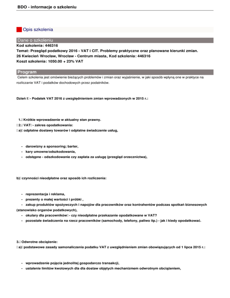 BDO - informacje o szkoleniu Opis szkolenia Dane o szkoleniu Kod szkolenia: 446316 Temat: Przegląd podatkowy 2016 - VAT i CIT. Problemy praktyczne oraz planowane kierunki zmian. 26 Kwiecień Wrocław, Wrocław - Centrum miasta, Kod szkolenia: 446316 Koszt szkolenia: 1050.00 + 23% VAT Program Celem szkolenia jest omówienie bieżących problemów i zmian oraz wyjaśnienie, w jaki sposób wpłyną one w praktyce na rozliczanie VAT i podatków dochodowych przez podatników. Dzień I - Podatek VAT 2016 z uwzględnieniem zmian wprowadzonych w 2015 r.: 1. Krótkie wprowadzenie w aktualny stan prawny. 2. VAT - zakres opodatkowania: a) odpłatne dostawy towarów i odpłatne świadczenie usług, - darowizny a sponsoring; barter, - kary umowne/odszkodowania, - odstępne - odszkodowanie czy zapłata za usługę (przegląd orzecznictwa), b) czynności nieodpłatne oraz sposób ich rozliczenia: - reprezentacja i reklama, - prezenty o małej wartości i próbki , - zakup produktów spożywczych i napojów dla pracowników oraz kontrahentów podczas spotkań biznesowych (stanowisko organów podatkowych), - okulary dla pracowników - czy nieodpłatne przekazanie opodatkowane w VAT? - pozostałe świadczenia na rzecz pracowników (samochody, telefony, paliwo itp.) - jak i kiedy opodatkować. 3. Odwrotne obciążenie: a) podstawowe zasady samonaliczenia podatku VAT z uwzględnieniem zmian obowiązujących od 1 lipca 2015 r.: - wprowadzenie pojęcia jednolitej gospodarczo transakcji, - ustalenie limitów kwotowych dla dla dostaw objętych mechanizmem odwrotnym obciążeniem, BDO - informacje o szkoleniu b) towary objęte odwrotnym obciążeniem, w tym: - dostawy złomu, - dodanie do Załącznika nr 11 złota, niektórych wyrobów ze stali, telefonów komórkowych, smartfonów, laptopów itp. c) podstawa opodatkowania oraz treść faktury w przypadku transakcji rozliczanych z odwrotnym obciążeniem, d) moment rozpoznania obowiązku podatkowego - przez sprzedawcę jak i nabywcę e) wprowadzenie obowiązku składania informacji podsumowujących w obrocie krajowym od 1 lipca 2015 r. oraz nowe wzory deklaracji podatkowych - zasady wypełniania. 4. Obowiązek podatkowy w VAT: a) moment dostawy i wykonania usługi a obowiązek podatkowy, b) pojęcie świadczenia ciągłego oraz rozliczanego w cyklach -orzecznictwo sądowe oraz restrykcyjne podejście organów podatkowych, c) opodatkowanie zaliczek w obrocie krajowym i międzynarodowym, d) kasowy obowiązek podatkowy, e) szczególne metody definiowania momentu powstania obowiązku podatkowego - najem, dzierżawa, leasing, usługi budowlane. 5. Stawki i zwolnienia z podatku VAT: a) obowiązujące stawki podatku VAT, b) zwolnienie dla dostawy towarów używanych - zasady korzystania, c) opodatkowanie dostaw nieruchomości: - ustalenie momentu pierwszego zasiedlenia w świetle najnowszego orzecznictwa NSA, - zwolnienie dla dostaw budynków i budowli, opcja opodatkowania, sprzedaż nieruchomości, która tylko w części podlegała pierwszemu zasiedleniu, - warunki zastosowania stawki 8% , w tym rozliczenie usług montażowych. 6. Zasady wystawiania faktur: a) pojęcie faktury oraz elementy obligatoryjne i fakultatywne faktury, b) kiedy nie istnieje konieczności wystawiania faktur, c) faktura uproszczona, d) terminy wystawiania faktur, e) faktury zaliczkowe (w tym: zaliczka a moment wystawienia faktury, obowiązek podatkowy w sytuacji otrzymania zaliczki, rozliczenie sprzedaży - faktura końcowa), f) faktury elektroniczne, w tym faktury w formie PDF - sposób wystawiania, przesyłania i przechowywania w świetle interpretacji organów podatkowych, BDO - informacje o szkoleniu g) refaktury, w tym odsprzedaż opłat za media w świetle wyroku TSUE. 7. Zasady korygowania rozliczeń na gruncie VAT: a) faktury korygujące: obowiązek wystawienia i dane obligatoryjne, b) sposób ujęcia skonta na fakturze korygującej (w tym rozbieżne stanowiska organów podatkowych w zakresie korekty dokonywanej przez nabywcę), c) zbiorcze faktury korygujące, d) moment ujęcia korekt in minus i in plus w rozliczeniu podatkowym, e) noty korygujące, f) anulowanie faktury. 8. Podstawa opodatkowania - najważniejsze zagadnienia: a) sposób definiowania, koszty uwzględniane w podstawie opodatkowania, b) świadczenie kompleksowe a refaktury. 9. Odliczanie podatku naliczonego, w tym: a) warunki dokonania odliczenia, b) ograniczenia w prawie do odliczenia, c) terminy odliczania podatku naliczonego, d) wątpliwości interpretacyjne i wskazówki praktyczne co do odliczania VAT w ,,dwóch kolejnych okresach rozliczeniowych", e) odliczenie dla transakcji WNT, importu usług, dostawy dla której podatnikiem jest nabywca, f) zasady i terminy korekty podatku naliczonego w przypadku otrzymania faktury korygującej, g) zakup paliwa a prawo do odliczenia po 1 lipca 2015 r. 10. Zmiany w zakresie odliczenia podatku naliczonego przy działalności gospodarczej i niegospodarzącej (prewspółczynnik) obowiązujące od 1 stycznia 2016 r.: a) sposób określania proporcji w przypadku wykorzystywania towarów i usług zarówno do działalności gospodarczej, jak i do innych celów (z wyjątkiem osobistych) - zasady obliczania tzw. prewspółczynnika, b) przykładowe wskaźniki, które podatnicy mogą zastosować przy obliczaniu wstępnej proporcji, c) zasady korekty w przypadku zmiany zakresu wykorzystywania zakupionych towarów i usług do celów działalności gospodarczej podatnika i celów działalności innej działalność gospodarcza, d) korekta w związku ze zmianą w stopniu wykorzystywania nieruchomości do celów działalności gospodarczej podatnika. 11. Przegląd najnowszego orzecznictwa organów podatkowy i sądów administracyjnych. 12. Panel dyskusyjny. BDO - informacje o szkoleniu Dzień II - Podatek dochodowy od osób prawnych: I. Zmiany w CIT od 2016 r.: 1. Likwidacja obowiązkowej korekty kosztów podatkowych w związku z nieuregulowaniem zobowiązań. 2. Korekta przychodów i kosztów