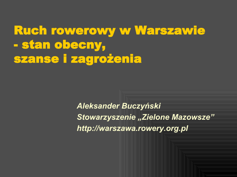 Ruch rowerowy w Warszawie - stan obecny, szanse i zagrożenia Aleksander Buczyński Stowarzyszenie „Zielone Mazowsze” http://warszawa.rowery.org.pl STAN OBECNY Jak oceniasz system warszawskich ścieżek rowerowych? 31% nie ma takiego systemu 18% beznadziejny 29% mierny 17% taki sobie 2% dobry 0% bardzo dobry 3% idealny Brak systemu rowerowego 150 km ścieżek nie tworzą spójnego systemu nie układają się w czytelne ciągi nie włączone w układ transportowy Dzielnice odcięte od centrum Bemowo Włochy Ursus Okęcie Tarchomin Białołęka Zacisze Targówek Rembertów Grochów Wawer Ścieżki raczej nie dla rowerów brak ciągłości irracjonalny przebieg nierówności nawierzchni uskoki zbyt ostre zakręty niezachowana skrajnia sygnalizacja niedostosowana do rowerów schody (!) Brak ciągłości Modlińska Banacha Bitwy Warszawskiej Starzyńskiego Marymoncka Al. Armii Ludowej Wał Miedzeszyński Al. Stanów Zjedn. Zabraniecka ... Irracjonalny przebieg zmiany strony ulicy Belwederska Górczewska Wołoska Rudnickiego Wał Miedzeszyński Wyb. Szczecińskie Jana Pawła II 17 Stycznia sprzeczne z wymogiem bezpośredniości zwiększają liczbę punktów kolizji Nawierzchnia z kostki betonowej niewygodna ul. Pileckiego Nawierzchnia z kostki betonowej nietrwała ul. Rembielińska Krawężniki i rowki odpływowe ok. 40 skrzyżowań wymuszają zachowania niezgodne z PoRD uszkadzają obręcze mogą spowodować upadek na jezdnię Warszawskie rekordy zjazd z Mostu Gdańskiego k. ZOO: 6 krawężników o wys. 10-16 cm od 5 lat problem nie do rozwiązania Wybrzeże Helskie Zakręty łuki zbyt ciasne bez poszerzeń ul. Odrowąża Zakręty bez wyłukowań (pod kątem) ul. gen. Maczka Niezachowana skrajnia wygrodzenia płoty Trasa S. Niezachowana skrajnia sygnalizatory latarnie ściany Puławska Schody Most Gdański Plac na Rozdrożu Mariensztat Czerniakowska Most Łazienkowski Rondo Zesłańców Schody dla niektórych bariera nie do pokonania dla innych duże utrudnienie Marnowane szanse modernizacje ulic zagospodarowanie terenu nad metrem remonty chodników duże inwestycje biurowce centra handlowe Bródno - centrum ciąg ulic zmodernizowany w latach 1998 - 2003 mogła powstać 8 km trasa rowerowa, łącząca Bródno ze ścisłym centrum, z odgałęzieniem na Żoliborz Bródno - centrum 7 odcinków ścieżek po kilkaset metrów rozdzielone niebezpiecznymi barierami nie włączone w układ drogowy wykorzystanie - nikłe ZAGROŻENIA nieprzemyślane, źle zaprojektowane inwestycje: duże inwestycje drogowe (np. Bubel Zesłańców Syberyjskich) ale też np. zmiany w organizacji ruchu nad stacjami metra (np. likwidacja przejazdu dla rowerów przy Dworcu Gdańskim) Chaos w pasie drogowym decyzje utrudniające późniejszą realizację sensownej drogi dla rowerów parkingi przy Al. Jana Pawła II, Bitwy Warszawskiej, Towarowej... niszczenie istniejących tras Szlak Wisły wyjazd z osiedla przy Sikorskiego Warszawiacy chcą jeździć na ścieżkach tworzących dłuższe ciągi 1000-2000 rowerów na dobę (dzień powszedni w sezonie) Przyczółkowa - 2800 Górczewska - 2800 Sobieskiego - 2650 Al. KEN - 2600 Dogodne warunki szerokie pasy drogowe płasko Inne miasta przetarły szlaki asfaltowa nawierzchnia kontrapasy ruch rowerowy w historycznym centrum audyt rowerowy obieg informacji