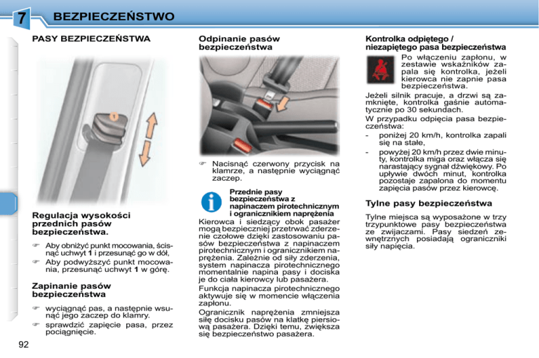 7 BEZPIECZEŃSTWO PASY BEZPIECZEŃSTWA Odpinanie pasów bezpieczeństwa Nacisnąć czerwony przycisk na klamrze, a następnie wyciągnąć zaczep. Regulacja wysokości przednich pasów bezpieczeństwa. Aby obniżyć punkt mocowania, ścisnąć uchwyt 1 i przesunąć go w dół, Aby podwyższyć punkt mocowania, przesunąć uchwyt 1 w górę. Zapinanie pasów bezpieczeństwa wyciągnąć pas, a następnie wsunąć jego zaczep do klamry. sprawdzić zapięcie pasa, przez pociągnięcie. 92 Przednie pasy bezpieczeństwa z napinaczem pirotechnicznym i ogranicznikiem naprężenia Kierowca i siedzący obok pasażer mogą bezpieczniej przetrwać zderzenie czołowe dzięki zastosowaniu pasów bezpieczeństwa z napinaczem pirotechnicznym i ogranicznikiem naprężenia. Zależnie od siły zderzenia, system napinacza pirotechnicznego momentalnie napina pasy i dociska je do ciała kierowcy lub pasażera. Funkcja napinacza pirotechnicznego aktywuje się w momencie włączenia zapłonu. Ogranicznik naprężenia zmniejsza siłę docisku pasów na klatkę piersiową pasażera. Dzięki temu, zwiększa się bezpieczeństwo pasażera. Kontrolka odpiętego / niezapiętego pasa bezpieczeństwa Po włączeniu zapłonu, w zestawie wskaźników zapala się kontrolka, jeżeli kierowca nie zapnie pasa bezpieczeństwa. Jeżeli silnik pracuje, a drzwi są zamknięte, kontrolka gaśnie automatycznie po 30 sekundach. W przypadku odpięcia pasa bezpieczeństwa: - poniżej 20 km/h, kontrolka zapali się na stałe, - powyżej 20 km/h przez dwie minuty, kontrolka miga oraz włącza się narastający sygnał dźwiękowy. Po upływie dwóch minut, kontrolka pozostaje zapalona do momentu zapięcia pasów przez kierowcę. Tylne pasy bezpieczeństwa Tylne miejsca są wyposażone w trzy trzypunktowe pasy bezpieczeństwa ze zwijaczami. Pasy siedzeń zewnętrznych posiadają ograniczniki siły napięcia. BEZPIECZEŃSTWO Bez względu na zajmowane siedzenie w samochodzie, należy bezwzględnie zapinać pasy bezpieczeństwa, nawet w przypadku krótkich przejazdów. Nie należy obracać klamry, ponieważ może to spowodować nieprawidłowe działanie pasa. Jeżeli siedzenia wyposażone są w podłokietniki*, dolna część pasa powinna przechodzić pod podłokietnikiem. Pasy bezpieczeństwa wyposażone są w zwijacz umożliwiający automatyczne dostosowanie długości pasa do budowy ciała. Chowanie pasa odbywa się automatycznie, gdy nie jest już używany. Przed i po użyciu pasa, należy upewnić się czy jest prawidłowo zwinięty. Dolna część pasa musi być położona jak najniżej na biodrach. Górna część pasa musi przebiegać w zagłębieniu ramienia. Zwijacze wyposażone są w mechanizm automatycznej blokady w momencie kolizji, nagłego hamowania lub dachowania pojazdu. Można odblokować mechanizm pociągając szybko za pas i puszczając go. Aby pas bezpieczeństwa spełniał swoje zadanie: - powinien być napięty jak najbliżej ciała, - powinien być wykorzystywany przez jedną osobę dorosłą, - nie może być przedziurawiony lub poszarpany, - należy wyciągać go przed siebie, sprawdzając czy nie jest skręcony, - nie może być przerabiany, może to pogorszyć jego właściwości. Ze względu na obowiązujące przepisy bezpieczeństwa, naprawy i kontrolę pasa należy przeprowadzać w ASO PEUGEOT, który zapewnia gwarancję i prawidłowe wykonanie. Okresowo, a w szczególności w przypadku zauważenia jakiegokolwiek uszkodzenia, należy sprawdzać pas bezpieczeństwa w ASO PEUGEOT. Pas bezpieczeństwa należy czyścić za pomocą wody z dodatkiem mydła lub środka do czyszczenia materiału, sprzedawanego w ASO PEUGEOT. Po złożeniu oparcia lub przesunięciu tylnej kanapy, należy sprawdzić czy pas jest prawidłowo ustawiony i zwinięty. 7 Zalecenia dotyczące przewożenia dzieci: - używać odpowiednich fotelików dziecięcych, w przypadku dzieci poniżej 12 roku życia, nie większego niż 150 cm. - nie należy używać prowadnicy pasa* w przypadku montowania fotelika dziecięcego. - nigdy nie używać jednego pasa bezpieczeństwa dla wielu pasażerów. - nigdy nie przewozić dziecka na kolanach. W zależności od rodzaju i siły uderzenia, mechanizm pirotechniczny może uruchomić się wcześniej i niezależnie od wyzwolenia poduszek powietrznych. Odpaleniu wkładu pirotechnicznego towarzyszy hałas eksplozji i uwolnienie niewielkiej ilości niegroźnego dymu. W każdym przypadku, zapali się kontrolka poduszki powietrznej. Po zderzeniu, należy sprawdzić, a w razie konieczności wymienić system pasów bezpieczeństwa w ASO PEUGEOT. * Zależnie od modelu. 93