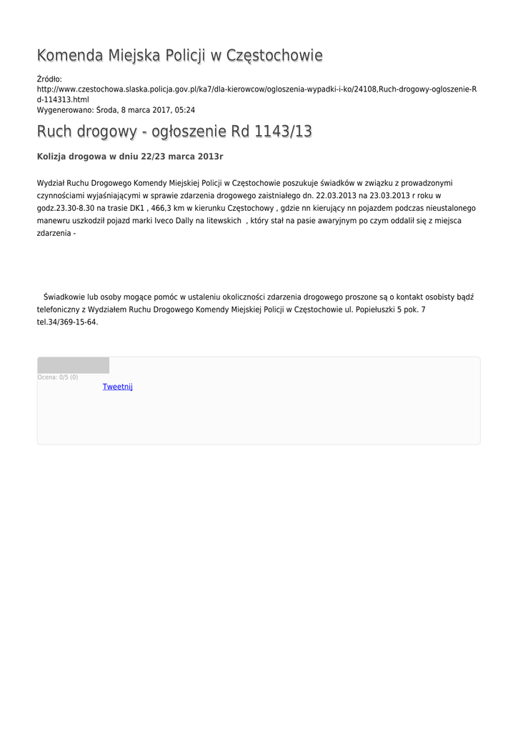Komenda Miejska Policji w Częstochowie Źródło: http://www.czestochowa.slaska.policja.gov.pl/ka7/dla-kierowcow/ogloszenia-wypadki-i-ko/24108,Ruch-drogowy-ogloszenie-R d-114313.html Wygenerowano: Środa, 8 marca 2017, 05:24 Ruch drogowy - ogłoszenie Rd 1143/13 Kolizja drogowa w dniu 22/23 marca 2013r Wydział Ruchu Drogowego Komendy Miejskiej Policji w Częstochowie poszukuje świadków w związku z prowadzonymi czynnościami wyjaśniającymi w sprawie zdarzenia drogowego zaistniałego dn. 22.03.2013 na 23.03.2013 r roku w godz.23.30-8.30 na trasie DK1 , 466,3 km w kierunku Częstochowy , gdzie nn kierujący nn pojazdem podczas nieustalonego manewru uszkodził pojazd marki Iveco Dally na litewskich , który stał na pasie awaryjnym po czym oddalił się z miejsca zdarzenia - Świadkowie lub osoby mogące pomóc w ustaleniu okoliczności zdarzenia drogowego proszone są o kontakt osobisty bądź telefoniczny z Wydziałem Ruchu Drogowego Komendy Miejskiej Policji w Częstochowie ul. Popiełuszki 5 pok. 7 tel.34/369-15-64. Ocena: 0/5 (0) Tweetnij