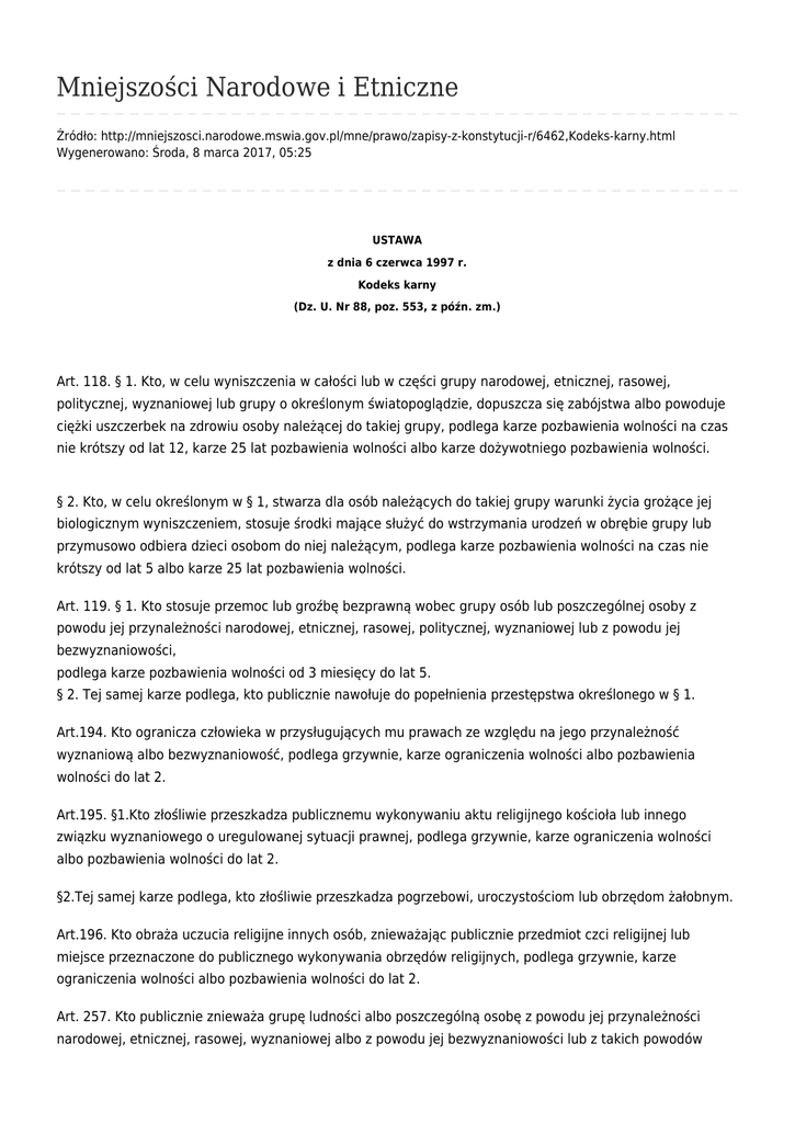 Mniejszości Narodowe i Etniczne Źródło: http://mniejszosci.narodowe.mswia.gov.pl/mne/prawo/zapisy-z-konstytucji-r/6462,Kodeks-karny.html Wygenerowano: Środa, 8 marca 2017, 05:25 USTAWA z dnia 6 czerwca 1997 r. Kodeks karny (Dz. U. Nr 88, poz. 553, z późn. zm.) Art. 118. § 1. Kto, w celu wyniszczenia w całości lub w części grupy narodowej, etnicznej, rasowej, politycznej, wyznaniowej lub grupy o określonym światopoglądzie, dopuszcza się zabójstwa albo powoduje ciężki uszczerbek na zdrowiu osoby należącej do takiej grupy, podlega karze pozbawienia wolności na czas nie krótszy od lat 12, karze 25 lat pozbawienia wolności albo karze dożywotniego pozbawienia wolności. § 2. Kto, w celu określonym w § 1, stwarza dla osób należących do takiej grupy warunki życia grożące jej biologicznym wyniszczeniem, stosuje środki mające służyć do wstrzymania urodzeń w obrębie grupy lub przymusowo odbiera dzieci osobom do niej należącym, podlega karze pozbawienia wolności na czas nie krótszy od lat 5 albo karze 25 lat pozbawienia wolności. Art. 119. § 1. Kto stosuje przemoc lub groźbę bezprawną wobec grupy osób lub poszczególnej osoby z powodu jej przynależności narodowej, etnicznej, rasowej, politycznej, wyznaniowej lub z powodu jej bezwyznaniowości, podlega karze pozbawienia wolności od 3 miesięcy do lat 5. § 2. Tej samej karze podlega, kto publicznie nawołuje do popełnienia przestępstwa określonego w § 1. Art.194. Kto ogranicza człowieka w przysługujących mu prawach ze względu na jego przynależność wyznaniową albo bezwyznaniowość, podlega grzywnie, karze ograniczenia wolności albo pozbawienia wolności do lat 2. Art.195. §1.Kto złośliwie przeszkadza publicznemu wykonywaniu aktu religijnego kościoła lub innego związku wyznaniowego o uregulowanej sytuacji prawnej, podlega grzywnie, karze ograniczenia wolności albo pozbawienia wolności do lat 2. §2.Tej samej karze podlega, kto złośliwie przeszkadza pogrzebowi, uroczystościom lub obrzędom żałobnym. Art.196. Kto obraża uczucia religijne innych osób, znieważając publicznie przedmiot czci religijnej lub miejsce przeznaczone do publicznego wykonywania obrzędów religijnych, podlega grzywnie, karze ograniczenia wolności albo pozbawienia wolności do lat 2. Art. 257. Kto publicznie znieważa grupę ludności albo poszczególną osobę z powodu jej przynależności narodowej, etnicznej, rasowej, wyznaniowej albo z powodu jej bezwyznaniowości lub z takich powodów narusza nietykalność cielesną innej osoby, podlega karze pozbawienia wolności do lat 3. ● Ustawa z dnia 6 czerwca 1997 r. Kodeks karny (tekst ujednolicony) Aktualizacja: 1 IV 2015 Wstecz Drukuj Generuj PDF Powiadom znajomego