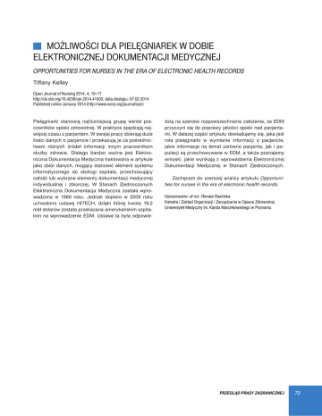 MOŻLIWOŚCI DLA PIELĘGNIAREK W DOBIE ELEKTRONICZNEJ DOKUMENTACJI MEDYCZNEJ OPPORTUNITIES FOR NURSES IN THE ERA OF ELECTRONIC HEALTH RECORDS Tiffany Kelley Open Journal of Nursing 2014, 4, 15–17 http://dx.doi.org/10.4236/ojn.2014.41003, data dostępu: 07.02.2014 Published online January 2014 (http://www.scirp.org/journal/ojn/) Pielęgniarki stanowią najliczniejszą grupę wśród pracowników opieki zdrowotnej. W praktyce spędzają najwięcej czasu z pacjentem. W swojej pracy zbierają duże ilości danych o pacjencie i przekazują je za pośrednictwem różnych źródeł informacji innym pracownikom służby zdrowia. Dlatego bardzo ważna jest Elektroniczna Dokumentacja Medyczna traktowana w artykule jako zbiór danych, mogący stanowić element systemu informatycznego do obsługi szpitala, przechowujący całość lub wybrane elementy dokumentacji medycznej indywidualnej i zbiorczej. W Stanach Zjednoczonych Elektroniczna Dokumentacja Medyczna została wprowadzona w 1960 roku. Jednak dopiero w 2009 roku uchwalono ustawę HITECH, dzięki której kwota 19,2 mld dolarów została przekazana amerykańskim szpitalom na wprowadzenie EDM. Ustawa ta była odpowie- dzią na szeroko rozpowszechnione założenie, że EDM przyczyni się do poprawy jakości opieki nad pacjentami. W dalszej części artykułu dowiadujemy się, jaka jest rola pielęgniarki w wymianie informacji o pacjencie, jakie informacje na temat zarówno pacjenta, jak i populacji są przechowywane w EDM, a także poznajemy wnioski, jakie wynikają z wprowadzenia Elektronicznej Dokumentacji Medycznej w Stanach Zjednoczonych. Zachęcam do szerszej analizy artykułu Opportunities for nurses in the era of electronic health records. Opracowanie: dr inż. Renata Rasińska Katedra i Zakład Organizacji i Zarządzania w Opiece Zdrowotnej Uniwersytet Medyczny im. Karola Marcinkowskiego w Poznaniu PRZEGLĄD PRASY ZAGRANICZNEJ 73