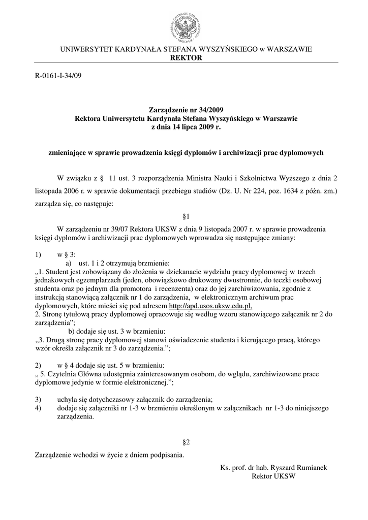 UNIWERSYTET KARDYNAŁA STEFANA WYSZYŃSKIEGO w WARSZAWIE REKTOR R-0161-I-34/09 Zarządzenie nr 34/2009 Rektora Uniwersytetu Kardynała Stefana Wyszyńskiego w Warszawie z dnia 14 lipca 2009 r. zmieniające w sprawie prowadzenia księgi dyplomów i archiwizacji prac dyplomowych W związku z § 11 ust. 3 rozporządzenia Ministra Nauki i Szkolnictwa Wyższego z dnia 2 listopada 2006 r. w sprawie dokumentacji przebiegu studiów (Dz. U. Nr 224, poz. 1634 z późn. zm.) zarządza się, co następuje: §1 W zarządzeniu nr 39/07 Rektora UKSW z dnia 9 listopada 2007 r. w sprawie prowadzenia księgi dyplomów i archiwizacji prac dyplomowych wprowadza się następujące zmiany: 1) w § 3: a) ust. 1 i 2 otrzymują brzmienie: „1. Student jest zobowiązany do złożenia w dziekanacie wydziału pracy dyplomowej w trzech jednakowych egzemplarzach (jeden, obowiązkowo drukowany dwustronnie, do teczki osobowej studenta oraz po jednym dla promotora i recenzenta) oraz do jej zarchiwizowania, zgodnie z instrukcją stanowiącą załącznik nr 1 do zarządzenia, w elektronicznym archiwum prac dyplomowych, które mieści się pod adresem http://apd.usos.uksw.edu.pl, 2. Stronę tytułową pracy dyplomowej opracowuje się według wzoru stanowiącego załącznik nr 2 do zarządzenia”; b) dodaje się ust. 3 w brzmieniu: „3. Drugą stronę pracy dyplomowej stanowi oświadczenie studenta i kierującego pracą, którego wzór określa załącznik nr 3 do zarządzenia.”; 2) w § 4 dodaje się ust. 5 w brzmieniu: „ 5. Czytelnia Główna udostępnia zainteresowanym osobom, do wglądu, zarchiwizowane prace dyplomowe jedynie w formie elektronicznej.”; 3) 4) uchyla się dotychczasowy załącznik do zarządzenia; dodaje się załączniki nr 1-3 w brzmieniu określonym w załącznikach nr 1-3 do niniejszego zarządzenia. §2 Zarządzenie wchodzi w życie z dniem podpisania. Ks. prof. dr hab. Ryszard Rumianek Rektor UKSW