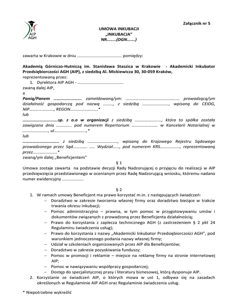 Załącznik nr 5 UMOWA INKUBACJI „INKUBACJA” NR……..(DGN…….) zawarta w Krakowie w dniu ..................................... pomiędzy: Akademią Górniczo-Hutniczą im. Stanisława Staszica w Krakowie - Akademicki Inkubator Przedsiębiorczości AGH (AIP), z siedzibą Al. Mickiewicza 30, 30-059 Kraków, reprezentowaną przez: 1. Dyrektora AIP AGH - ...................................... zwaną dalej AIP, a Panią/Panem ……………………. zameldowaną/ym: …………………………………………. prowadzącą/ym działalność gospodarczą pod nazwą ………, z siedzibą ……………………, wpisaną do CEIDG, NIP…………………., REGON…………………….* lub ………………………….sp. z o.o w organizacji z siedzibą …………………..., która to spółka została zawiązana dnia ………….. pod numerem Repertorium …………………… w Kancelarii Notarialnej w ………………….., ul………………………..,* lub ………………………….. z siedzibą ………………………, wpisaną do Krajowego Rejestru Sądowego prowadzonego przez Sąd…………. ….. Wydział……, pod numerem KRS………………, reprezentowaną przez………………….* zwaną/ym dalej „Beneficjentem” §1 Umowa zostaje zawarta na podstawie decyzji Rady Nadzorującej o przyjęciu do realizacji w AIP przedsięwzięcia przedstawionego w ocenianym przez Radę Nadzorującą wniosku, któremu nadano numer ewidencyjny .................. §2 1. W ramach umowy Beneficjent ma prawo korzystać m.in. z następujących świadczeń: Doradztwo w zakresie tworzenia własnej firmy oraz doradztwo bieżące w trakcie trwania okresu inkubacji; Pomoc administracyjno – prawna, w tym pomoc w przygotowywaniu umów i dokumentów związanych z prowadzoną przez Beneficjenta działalnością; Prawo do korzystania z zaplecza technicznego AGH (z zastrzeżeniem § 2 pkt 24 Regulaminu świadczenia usług); Prawo do korzystania z nazwy „Akademicki Inkubator Przedsiębiorczości AGH”, pod warunkiem jednoczesnego podania nazwy własnej firmy; Udział w szkoleniach organizowanych przez AIP dla Beneficjentów; Doradztwo w zakresie pozyskiwania funduszy; Pomoc w promocji i reklamie – miejsce na reklamę firmy na stronie internetowej AIP; Pomoc w nawiązywaniu współpracy gospodarczej; Dostęp do specjalistycznej prasy i literatury biznesowej, którą dysponuje AIP. 2. Korzystanie ze świadczeń AIP, o których mowa w ust 1, odbywa się na zasadach określonych w Regulaminie AIP AGH oraz Regulaminie świadczenia usług. * Niepotrzebne wykreślić 3. Beneficjent oświadcza, że zapoznał się z dokumentami wskazanymi w ust. 2 i akceptuje je. 1. 2. 3. 4. §3 Beneficjent zobowiązuje się do wykorzystywania przedmiotu najmu do prac biurowych, związanych z prowadzeniem działalności gospodarczej w zakresie określonym we wpisie do CEIDG. Beneficjent przyjmuje do wiadomości, że z pomieszczeń oraz wyposażenia AIP korzystają na podstawie podpisanych z AIP umów także inne podmioty i nie wnosi co do tego zastrzeżeń. AIP nie ma obowiązku uzyskiwania zgody ani informowania Beneficjenta o podpisywanych z innymi beneficjentami umowach. Prawa nabyte przez Beneficjenta z tytułu niniejszej umowy nie mogą być przez niego przenoszone w jakiejkolwiek formie na osobę trzecią bez uprzedniej pisemnej zgody AIP. §4 Niniejsza umowa zostaje zawarta na okres od …………… r. do dnia ……………... r. § 5* 1. Z tytułu niniejszej umowy Beneficjent będzie uiszczał AIP czynsz zgodnie z cennikiem, w wysokości …………. zł (słownie:…………………) netto miesięcznie, powiększony o należny podatek od towarów i usług w wysokości wynikającej z obowiązujących przepisów. 2. Czynsz za dany miesiąc płatny jest miesięcznie, przelewem, do ostatniego dnia tego miesiąca na rachunek bankowy AIP w Banku Pekao S.A. Kraków, nr konta: 96 1240 4722 1111 0000 4858 2922. 3. W przypadku opóźnienia w płatności czynszu AIP jest uprawniony do naliczania odsetek ustawowych. § 5* Opłata z tytułu niniejszej umowy zawarta jest w czynszu z umowy najmu powierzchni użytkowej nr…………….. §6 1. W przypadku zawieszenia działalności gospodarczej Beneficjent ma prawo ubiegać się o zawieszenie opłat z tytułu niniejszej umowy. Zawieszenie następuje na wniosek Beneficjenta zaakceptowany przez Dyrektora AIP AGH, po wyrażeniu zgody przez Radę Nadzorującą. Maksymalny okres zawieszenia wynosi 6 miesięcy. 2. Na okres zawieszenia, o którym mowa w ust. 1 Beneficjent traci prawo do korzystania ze świadczeń, o których mowa w §2 ust. 1 (nie dotyczy miejsca na reklamę firmy na stronie internetowej AIP). §7 1. Strony mają prawo wypowiedzieć niniejszą umowę z zachowaniem miesięcznego okresu wypowiedzenia. Termin wypowiedzenia liczony jest od następnego miesiąca przypadającego po dniu doręczenia wypowiedzenia. Wypowiedzenie musi zostać złożone w formie pisemnej pod rygorem nieważności. 2. Umowa może zostać rozwiązana w każdym terminie za porozumieniem Stron, pod warunkiem uregulowania przez Beneficjenta wszelkich zobowiązań wobec AIP. §8 1. W przypadku naruszania warunków umowy inkubacji Rada Nadzorująca, po zasięgnięciu opinii Dyrektora AIP AGH oraz uzyskaniu od Beneficjenta stosownych wyjaśnień, może podjąć decyzję o skróceniu okresu umowy, bez prawa do zwrotu opłaconego czynszu. * Niepotrzebne wykreślić 2. W przypadku naruszania przez Beneficjenta przepisów prawa, w tym prawa wewnętrznego AGH oraz zasad współżycia społecznego Rada Nadzorująca ma prawo podjąć decyzję o wypowiedzeniu umowy inkubacji, a w szczególnych przypadkach, o jej rozwiązaniu ze skutkiem natychmiastowym, bez prawa do zwrotu opłaconego czynszu. §9 Beneficjent prowadzi działalności gospodarczą na własny rachunek i ryzyko. AGH nie ponosi żadnej odpowiedzialności (prawnej i materialnej) za zobowiązania Benefic