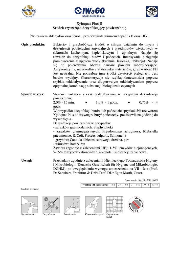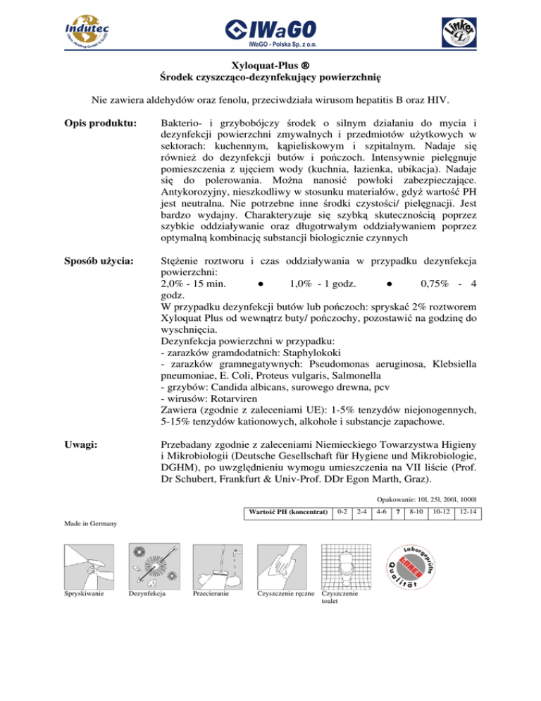Xyloquat-Plus Środek czyszcząco-dezynfekujący powierzchnię Nie zawiera aldehydów oraz fenolu, przeciwdziała wirusom hepatitis B oraz HIV. Opis produktu: Bakterio- i grzybobójczy środek o silnym działaniu do mycia i dezynfekcji powierzchni zmywalnych i przedmiotów użytkowych w sektorach: kuchennym, kąpieliskowym i szpitalnym. Nadaje się również do dezynfekcji butów i pończoch. Intensywnie pielęgnuje pomieszczenia z ujęciem wody (kuchnia, łazienka, ubikacja). Nadaje się do polerowania. Można nanosić powłoki zabezpieczające. Antykorozyjny, nieszkodliwy w stosunku materiałów, gdyż wartość PH jest neutralna. Nie potrzebne inne środki czystości/ pielęgnacji. Jest bardzo wydajny. Charakteryzuje się szybką skutecznością poprzez szybkie oddziaływanie oraz długotrwałym oddziaływaniem poprzez optymalną kombinację substancji biologicznie czynnych Sposób użycia: Stężenie roztworu i czas oddziaływania w przypadku dezynfekcja powierzchni: 2,0% - 15 min. ● 1,0% - 1 godz. ● 0,75% - 4 godz. W przypadku dezynfekcji butów lub pończoch: spryskać 2% roztworem Xyloquat Plus od wewnątrz buty/ pończochy, pozostawić na godzinę do wyschnięcia. Dezynfekcja powierzchni w przypadku: - zarazków gramdodatnich: Staphylokoki - zarazków gramnegatywnych: Pseudomonas aeruginosa, Klebsiella pneumoniae, E. Coli, Proteus vulgaris, Salmonella - grzybów: Candida albicans, surowego drewna, pcv - wirusów: Rotarviren Zawiera (zgodnie z zaleceniami UE): 1-5% tenzydów niejonogennych, 5-15% tenzydów kationowych, alkohole i substancje zapachowe. Uwagi: Przebadany zgodnie z zaleceniami Niemieckiego Towarzystwa Higieny i Mikrobiologii (Deutsche Gesellschaft für Hygiene und Mikrobiologie, DGHM), po uwzględnieniu wymogu umieszczenia na VII liście (Prof. Dr Schubert, Frankfurt & Univ-Prof. DDr Egon Marth, Graz). Opakowanie: 10l, 25l, 200l, 1000l Wartość PH (koncentrat) 0-2 2-4 Made in Germany Spryskiwanie Dezynfekcja Przecieranie Czyszczenie ręczne Czyszczenie toalet 4-6 7 8-10 10-12 12-14 Zawiera: chlorek didecylodimetyloamonium. Xi DRAŻNIĄCY Działa drażniąco na oczy i skórę. Chronić przed dziećmi. Unikać zanieczyszczenia skóry i oczu. W razie połknięcia niezwłocznie zasięgnij porady lekarza - pokaż opakowanie lub etykietę. Zawiera: kationowe środki powierzchniowo czynne (5-15%), kompozycje zapachową.