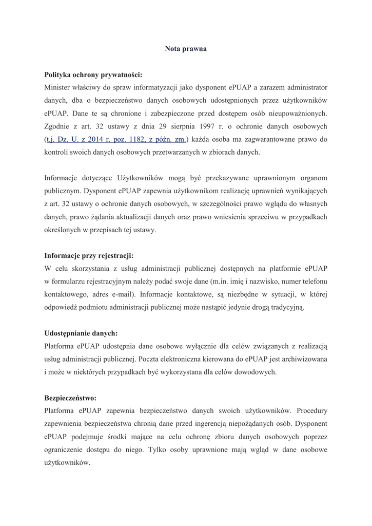 Nota prawna Polityka ochrony prywatności: Minister właściwy do spraw informatyzacji jako dysponent ePUAP a zarazem administrator danych, dba o bezpieczeństwo danych osobowych udostępnionych przez użytkowników ePUAP. Dane te są chronione i zabezpieczone przed dostępem osób nieupoważnionych. Zgodnie z art. 32 ustawy z dnia 29 sierpnia 1997 r. o ochronie danych osobowych (t.j. Dz. U. z 2014 r. poz. 1182, z późn. zm.) każda osoba ma zagwarantowane prawo do kontroli swoich danych osobowych przetwarzanych w zbiorach danych. Informacje dotyczące Użytkowników mogą być przekazywane uprawnionym organom publicznym. Dysponent ePUAP zapewnia użytkownikom realizację uprawnień wynikających z art. 32 ustawy o ochronie danych osobowych, w szczególności prawo wglądu do własnych danych, prawo żądania aktualizacji danych oraz prawo wniesienia sprzeciwu w przypadkach określonych w przepisach tej ustawy. Informacje przy rejestracji: W celu skorzystania z usług administracji publicznej dostępnych na platformie ePUAP w formularzu rejestracyjnym należy podać swoje dane (m.in. imię i nazwisko, numer telefonu kontaktowego, adres e-mail). Informacje kontaktowe, są niezbędne w sytuacji, w której odpowiedź podmiotu administracji publicznej może nastąpić jedynie drogą tradycyjną. Udostępnianie danych: Platforma ePUAP udostępnia dane osobowe wyłącznie dla celów związanych z realizacją usług administracji publicznej. Poczta elektroniczna kierowana do ePUAP jest archiwizowana i może w niektórych przypadkach być wykorzystana dla celów dowodowych. Bezpieczeństwo: Platforma ePUAP zapewnia bezpieczeństwo danych swoich użytkowników. Procedury zapewnienia bezpieczeństwa chronią dane przed ingerencją niepożądanych osób. Dysponent ePUAP podejmuje środki mające na celu ochronę zbioru danych osobowych poprzez ograniczenie dostępu do niego. Tylko osoby uprawnione mają wgląd w dane osobowe użytkowników. Usunięcie danych: Platforma ePUAP zapewnia użytkownikom możliwość usunięcia swoich danych z profilu użytkownika, usunięcie konta oraz do zaprzestania korzystania z platformy ePUAP. Informacje zawarte w profilu użytkownika są przechowywane przez Dysponenta ePUAP (tj. ministra ds. informatyzacji) przez okres 5 lat od ostatniego dnia miesiąca, w którym nastąpiła dezaktywacja. Dysponent ePUAP może odmówić usunięcia danych, aby zapobiec powtórnej rejestracji osób, które korzystały z funkcjonalności platformy ePUAP lub usług administracji publicznej w sposób niedozwolony. Pliki „cookies”: W ramach strony ePAUP stosowane są pliki cookies. Ich celem jest świadczenie usług na najwyższym poziomie, w tym również dostosowanych do indywidualnych potrzeb użytkownika. Korzystanie z witryny bez zmiany ustawień przeglądarki dotyczących cookies oznacza, że będą one umieszczane w urządzeniu użytkownika. W każdej chwili użytkownik może dokonać zmiany ustawień przeglądarki dotyczących cookies w celu ich wyłączenia. Serwis wykorzystuje pliki cookies, które można podzielić w następujący sposób: „niezbędne” - czyli umożliwiające korzystanie z usług dostępnych w ramach portalu, np. podtrzymujące sesję po zalogowaniu użytkownika „funkcjonalne” - pliki umożliwiające „zapamiętanie” wybranych ustawień i wpływające na personalizację interfejsu „zabezpieczające” – wspomagające zapewnienie bezpieczeństwa „wydajnościowe” - pliki umożliwiające zbieranie informacji o sposobie korzystania z portalu Podstawa prawna: Ustawa z dnia 29 sierpnia 1997 r. o ochronie danych osobowych (t.j. Dz. U. z 2014 r. poz. 1182, z późn. zm.) Ustawa z dnia 16 lipca 2004 r. Prawo telekomunikacyjne (t.j. Dz. U. z 2014 r. poz. 243, z późn. zm.) Ustawa z dnia 17 lutego 2005 r. o informatyzacji działalności podmiotów realizujących zadania publiczne (Dz. U. z 2014 r. poz. 1114) Źródło: https://epuap.gov.pl/wps/portal/strefa-klienta/nota-prawna
