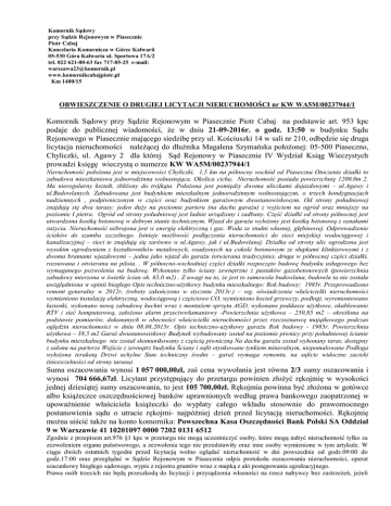 Komornik Sądowy przy Sądzie Rejonowym w Piasecznie Piotr Cabaj Kancelaria Komornicza w Górze Kalwarii 05-530 Góra Kalwaria ul. Sportowa 17A/2 tel. 022 621-00-63 fax 717-85-25 e-mail: [email protected] www.komornikcabajpiotr.pl Km 1400/15 OBWIESZCZENIE O DRUGIEJ LICYTACJI NIERUCHOMOŚCI nr KW WA5M/00237944/1 Komornik Sądowy przy Sądzie Rejonowym w Piasecznie Piotr Cabaj na podstawie art. 953 kpc podaje do publicznej wiadomości, że w dniu 21-09-2016r. o godz. 13:50 w budynku Sądu Rejonowego w Piasecznie mającego siedzibę przy ul. Kościuszki 14 w sali nr 210, odbędzie się druga licytacja nieruchomości należącej do dłużnika Magalena Szymańska położonej: 05-500 Piaseczno, Chyliczki, ul. Agawy 2 dla której Sąd Rejonowy w Piasecznie IV Wydział Ksiąg Wieczystych prowadzi księgę wieczystą o numerze KW WA5M/00237944/1 Nieruchomość położona jest w miejscowości Chyliczki, 1,5 km na północny wschód od Piaseczna Otoczenie działki to zabudowa mieszkaniowa jednorodzinna wolnostojąca. Okolica cicha. Nieruchomość posiada powierzchnię 1200,0m 2. Ma nieregularny kształt, zbliżony do trójkąta. Położona jest pomiędzy dwoma uliczkami dojazdowymi – ul.Agawy i ul.Budowlanych. Zabudowana jest budynkiem mieszkalnym jednorodzinnym wolnostojącym, o trzech kondygnacjach nadziemnych , podpiwniczonym w części oraz budynkiem garażowym dwustanowiskowym. Od strony południowej znajdują się dwa tarasy: jeden duży na poziomie parteru (na dachu garażu) z wyjściem na ogród oraz mniejszy na poziomie I pietra. Ogród od strony południowej jest ładnie urządzony i zadbany. Część działki od strony północnej jest utwardzona kostką betonową w dobrym stanie technicznym. Wjazd do garażu wyłożony jest kostką betonową z oznakami zużycia. Nieruchomość uzbrojona jest w energię elektryczną i gaz. Woda ze studni własnej, głębinowej. Odprowadzenie ścieków do szamba szczelnego. Istnieje możliwość podłączenia nieruchomości do sieci miejskiej wodociągowej i kanalizacyjnej – sieci te znajdują się zarówno w ul.Agawy, jak i ul.Budowlanej. Działka od strony ulic ogrodzona jest wysokim ogrodzeniem z kształtowników metalowych, osadzonych na cokole betonowym ze słupkami klinkierowymi i z dwoma bramami wjazdowymi – jedna jako wjazd do garażu (otwierana tradycyjnie), druga w północnej części działki, rozsuwana i otwierana na pilota. . W północno-wschodniej części działki rozpoczęto budowę budynku usługowego bez wymaganego pozwolenia na budowę. Wykonano tylko ściany zewnętrzne z pustaków gazobetonowych (powierzchnia zabudowy mierzona w świetle ścian ok. 65,0 m2) . Z uwagi na to, że jest to samowola budowlana, budowla ta nie została uwzględniona w opinii biegłego Opis techniczno-użytkowy budynku mieszkalnego: Rok budowy; 1985r. Przeprowadzono remont generalny w 2012r. (roboty zakończono w styczniu 2013r.) – wg. oświadczenia właścicielki nieruchomości wymieniono instalację elektryczną, wodociągową i częściowo CO, wymieniono kocioł grzewczy, podłogi, wyremontowano łazienki, wykonano nową zabudowę kuchni wraz z montażem sprzętu AGD, wykonano poddasze użytkowe, okablowanie RTV i sieć komputerową, założono alarm przeciwwłamaniowy -Powierzchnia użytkowa – 250,85 m2 – określona na podstawie pomiarów, dokonanych w obecności właścicielki nieruchomości przez rzeczoznawcę majątkowego podczas oględzin nieruchomości w dniu 08.08.2015r. Opis techniczno-użytkowy garażu Rok budowy - 1985r. Powierzchnia użytkowa – 38,5 m2 Garaż dwustanowiskowy Budynek wybudowany został na poziomie piwnicy przy południowej ścianie budynku mieszkalnego nie został skomunikowany z częścią piwniczną Na dachu garażu został wykonany taras, dostępny z salonu na parterze Wejście z zewnątrz budynku Ściany i sufit otynkowane tynkiem mineralnym, niepomalowane Podłoga wyłożona terakotą Drzwi uchylne Stan techniczny średni – garaż wymaga remontu, na suficie widoczne zacieki (nieszczelności od strony tarasu) Suma oszacowania wynosi 1 057 000,00zł, zaś cena wywołania jest równa 2/3 sumy oszacowania i wynosi 704 666,67zł. Licytant przystępujący do przetargu powinien złożyć rękojmię w wysokości jednej dziesiątej sumy oszacowania, to jest 105 700,00zł. Rękojmia powinna być złożona w gotówce albo książeczce oszczędnościowej banków uprawnionych według prawa bankowego zaopatrzonej w upoważnienie właściciela książeczki do wypłaty całego wkładu stosownie do prawomocnego postanowienia sądu o utracie rękojmi- najpóźniej dzień przed licytacją nieruchomości. Rękojmię można uiścić także na konto komornika: Powszechna Kasa Oszczędności Bank Polski SA Oddział 9 w Warszawie 41 10201097 0000 7202 0131 6512 Zgodnie z przepisem art.976 §1 kpc w przetargu nie mogą uczestniczyć osoby, które mogą nabyć nieruchomość tylko za zezwoleniem organu państwowego, a zezwolenia tego nie przedstawiły oraz inne osoby wymienione w tym artykule. W ciągu dwóch ostatnich tygodni przed licytacją wolno oglądać nieruchomość w dni powszednie od godz.09:00 do godz.17:00 oraz przeglądać w Sądzie Rejonowym w Piasecznie odpis protokołu oszacowania nieruchomości, operat szacunkowy biegłego sądowego, wypis z rejestru gruntów wraz z mapką z akt postępowania egzekucyjnego. Prawa osób trzecich nie będą przeszkodą do licytacji i przysądzenia własności na rzecz nabywcy bez zastrzeżeń, jeżeli osoby te przed rozpoczęciem przetargu nie złożą dowodu, że wniosły powództwo o zwolnienie nieruchomości lub przedmiotów razem z nią zajętych od egzekucji i uzyskały w tym zakresie orzeczenie wstrzymujące egzekucję. Użytkowanie, służebności i prawa dożywotnika, jeżeli nie są ujawnione w księdze wieczystej lub przez złożenie dokumentu do zbioru dokumentów i nie zostaną zgłoszone najpóźniej na trzy dni przed rozpoczęciem licytacji, nie będą uwzględnione w da
