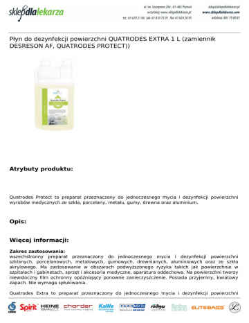 Płyn do dezynfekcji powierzchni QUATRODES EXTRA 1 L (zamiennik DESRESON AF, QUATRODES PROTECT)) Atrybuty produktu: Quatrodes Protect to preparat przeznaczony do jednoczesnego mycia i dezynfekcji powierzchni wyrobów medycznych ze szkła, porcelany, metalu, gumy, drewna oraz aluminium. Opis: Więcej informacji: Zakres zastosowania: wszechstronny preparat przeznaczony do jednoczesnego mycia i dezynfekcji powierzchni szklanych, porcelanowych, metalowych, gumowych, drewnianych, aluminiowych oraz ze szkła akrylowego. Ma zastosowanie w obszarach podwyższonego ryzyka takich jak powierzchnie w szpitalach i gabinetach, sprzęt i akcesoria medyczne, aparatura oddechowa. Na powierzchni tworzy niewidoczny film ochronny opóźniający ponowne zanieczyszczenie. Posiada przyjemny, kwiatowy zapach. Nie wymaga spłukiwania. Quatrodes Extra to preparat przeznaczony do jednoczesnego mycia i dezynfekcji powierzchni wyrobów medycznych ze szkła, porcelany, metalu, gumy, drewna oraz aluminium Szczególnie zalecany jest do dezynfekcji powierzchni ze szkła akrylowego. Ze względu na szerokie spektrum bójcze ma zastosowanie w obszarach podwyższonego ryzyka takich jak szpitale i gabinety. Może być również stosowany do powierzchni mających kontakt z żywnością. Posiada przyjemny, kwiatowy zapach. Nie wymaga spłukiwania. Sposób użycia: Przygotować roztwór roboczy środka przez rozcieńczenie z wodą. Wybór stężenia zależy od pożądanego spektrum i czasu działania. Opakowanie 1 litrowe zawiera zintegrowaną miarkę dozującą, natomiast do kanistrów dostępne są pompki dozujące: jedno naciśnięcie (20 ml) na 8 litrów roztworu daje stężenie 0,25%, dwa naciśnięcia (2 x 20 ml) na 8 litrów roztworu daje stężenie 0,5%. Powierzchnia po dezynfekcji nie wymaga zmycia wodą. Skuteczność mikrobiologiczna: bakterie wg VAH/DGHM; EN 1040; EN1276, EN 13697; drożdżaki wg VAH/DGHM, EN 1275, EN 1650, EN 13697; prątki wg VAH/DGHM, EN14348; wirusy (HBV, HIV, HCV) wg BGA(RKI)/DVV, EN 14476. Bakterie (wysoki stopień zanieczyszczeń):. 0,5 % - 5 min. 0,25 % - 60 min. Prątki gruźlicy (Tbc) oraz mykobakterii wg norm EN 14348: 2,0% - 15 min. 0,5% - 30 min. 0,25 % - 60 min. Wirusy osłonkowe (np. HBV, HIV, HCV): 0,5 % - 5 min. 0,25 % - 60 min. 100 g zawiera: 6,3 g poli(oksy-1,2-etanodilo)alfa.-[2-(didecylmetyloam)] Powered by TCPDF (www.tcpdf.org)