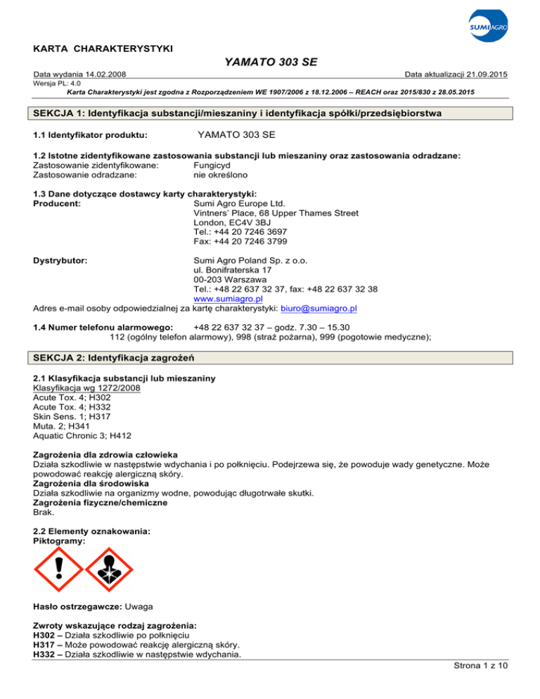 KARTA CHARAKTERYSTYKI YAMATO 303 SE Data wydania 14.02.2008 Data aktualizacji 21.09.2015 Wersja PL: 4.0 Karta Charakterystyki jest zgodna z Rozporządzeniem WE 1907/2006 z 18.12.2006 – REACH oraz 2015/830 z 28.05.2015 SEKCJA 1: Identyfikacja substancji/mieszaniny i identyfikacja spółki/przedsiębiorstwa 1.1 Identyfikator produktu: YAMATO 303 SE 1.2 Istotne zidentyfikowane zastosowania substancji lub mieszaniny oraz zastosowania odradzane: Zastosowanie zidentyfikowane: Fungicyd Zastosowanie odradzane: nie określono 1.3 Dane dotyczące dostawcy karty charakterystyki: Producent: Sumi Agro Europe Ltd. Vintners’ Place, 68 Upper Thames Street London, EC4V 3BJ Tel.: +44 20 7246 3697 Fax: +44 20 7246 3799 Dystrybutor: Sumi Agro Poland Sp. z o.o. ul. Bonifraterska 17 00-203 Warszawa Tel.: +48 22 637 32 37, fax: +48 22 637 32 38 www.sumiagro.pl Adres e-mail osoby odpowiedzialnej za kartę charakterystyki: [email protected] 1.4 Numer telefonu alarmowego: +48 22 637 32 37 – godz. 7.30 – 15.30 112 (ogólny telefon alarmowy), 998 (straż pożarna), 999 (pogotowie medyczne); SEKCJA 2: Identyfikacja zagrożeń 2.1 Klasyfikacja substancji lub mieszaniny Klasyfikacja wg 1272/2008 Acute Tox. 4; H302 Acute Tox. 4; H332 Skin Sens. 1; H317 Muta. 2; H341 Aquatic Chronic 3; H412 Zagrożenia dla zdrowia człowieka Działa szkodliwie w następstwie wdychania i po połknięciu. Podejrzewa się, że powoduje wady genetyczne. Może powodować reakcję alergiczną skóry. Zagrożenia dla środowiska Działa szkodliwie na organizmy wodne, powodując długotrwałe skutki. Zagrożenia fizyczne/chemiczne Brak. 2.2 Elementy oznakowania: Piktogramy: Hasło ostrzegawcze: Uwaga Zwroty wskazujące rodzaj zagrożenia: H302 – Działa szkodliwie po połknięciu H317 – Może powodować reakcję alergiczną skóry. H332 – Działa szkodliwie w następstwie wdychania. Strona 1 z 10 KARTA CHARAKTERYSTYKI YAMATO 303 SE Data wydania 14.02.2008 Data aktualizacji 21.09.2015 Wersja PL: 4.0 Karta Charakterystyki jest zgodna z Rozporządzeniem WE 1907/2006 z 18.12.2006 – REACH oraz 2015/830 z 28.05.2015 H341 – Podejrzewa się, że powoduje wady genetyczne H412 – Działa szkodliwie toksycznie na organizmy wodne, powodując długotrwałe skutki EUH401 – W celu uniknięcia zagrożeń dla zdrowia ludzi i środowiska, należy postępować zgodnie z instrukcją użycia Zwroty określające warunki bezpiecznego stosowania: P261 – Unikać wdychania rozpylonej cieczy. P280 – Stosować rękawice ochronne/odzież ochronną/ochronę oczu/ochronę twarzy P301+P312 – W PRZYPADKU POŁKNIĘCIA: W przypadku złego samopoczucia skontaktować się z OŚRODKIEM ZATRUĆ lub z lekarzem P302+P352 – W PRZYPADKU KONTAKTU ZE SKÓRĄ: Umyć dużą ilością wody z mydłem. P304+P340 – W PRZYPADKU DOSTANIA SIĘ DO DRÓG ODDECHOWYCH: wyprowadzić lub wynieść poszkodowanego na świeże powietrze i zapewnić mu warunki do swobodnego oddychania. P312 – W przypadku złego samopoczucia skontaktować się z OŚRODKIEM ZATRUĆ lub z lekarzem Składniki niebezpieczne: Tiofanat metylu 233g/l (20,44%) Tetrakonazol 70g/l (61,14%) 2.3 Inne zagrożenia: Brak informacji na temat spełnienia kryteriów PBT lub vPvB zgodnie z załącznikiem XIII rozporządzenia REACH. Odpowiednie badania nie były przeprowadzone. SEKCJA 3: Skład/informacja o składnikach 3.1 Substancje Nie dotyczy. 3.2 Mieszaniny: Niebezpieczne składniki: Identyfikator produktu Tiofanat metylu CAS: 23564-05-8 WE: 245-740-7 Nr indeksowy: 006-069-00-3 Nr REACH: substancja podlega przepisom okresu przejściowego Tetrakonazol CAS: 112281-77-3 WE: 407-760-6 Nr indeksowy: 613-174-00-3 Nr REACH: substancja podlega przepisom okresu przejściowego Dukozynian sodu CAS: 577-11-7 WE: 209-406-4 Nr indeksowy: Nr REACH: substancja podlega przepisom okresu przejściowego Pełna treść zwrotów H w sekcji 16 Zawartość % 20 – 30 1 – 10 1 – 10 Klasyfikacja CLP Kody zwrotów Klasa zagrożenia wskazujących i kody kategorii rodzaj zagrożenia Muta. 2 Acute Tox. 4 Skin Sens. 1 Aquatic Acute 1 Aquatic Chronic 1 H341 H332 H317 H400 H410 Acute Tox. 4 Acute Tox. 4 Aquatic Chronic 2 H332 H302 H411 Skin Irrit. 2 Eye Dam. 1 H315 H318 Strona 2 z 10 KARTA CHARAKTERYSTYKI YAMATO 303 SE Data wydania 14.02.2008 Data aktualizacji 21.09.2015 Wersja PL: 4.0 Karta Charakterystyki jest zgodna z Rozporządzeniem WE 1907/2006 z 18.12.2006 – REACH oraz 2015/830 z 28.05.2015 Pozostałe składniki: Propan-1,2-diol stężenie: 1 – 10% CAS: 57-55-6 WE: 200-338-0 Nr REACH: 01-2119456809-23-XXXX SEKCJA 4: Środki pierwszej pomocy 4.1 Opis środków pierwszej pomocy W przypadku kontaktu ze skórą Zdjąć zanieczyszczoną odzież, umyć zabrudzoną skórę wodą z mydłem, spłukać dokładnie wodą, w przypadku pojawienia się podrażnienia, rumieni skontaktować się z lekarzem. W przypadku kontaktu z oczami Przepłukać oczy przez kilkanaście minut (ok. 15) dużą ilością wody, trzymając powieki szeroko rozwarte. Unikać silnego strumienia, ze względu na niebezpieczeństwo uszkodzenia rogówki - natychmiast skontaktować się z lekarzem. Narażenie inhalacyjne W razie zawrotów głowy lub nudności wyprowadzić poszkodowanego na świeże powietrze, w razie braku szybkiej poprawy zasięgnąć porady lekarza. W przypadku połknięcia Przepłukać usta i podać do wypicia dużą ilość wody, natychmiast skontaktować się z lekarzem. Nie podawać niczego doustnie osobie nieprzytomnej. 4.2 Najważniejsze ostre i opóźnione objawy oraz skutki narażenia: Układ oddechowy. W warunkach ekstremalnego narażenia wdychanie par może powodować podrażnienia błon śluzowych układu oddechowego. Może wywierać negatywny wpływ centralny układ nerwowy. Mogą pojawić się zawroty głowy i nudności. Przewód pokarmowy. Podrażnienia chemiczne układu pokarmowego, objawy zatrucia pokarmowego, po wchłonięciu – nudności, wymioty, bóle i zawroty głowy. Może prowadzić do uszkodzenia narządów wewnętrznych, 