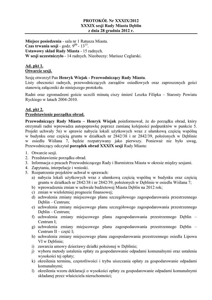 PROTOKÓŁ Nr XXXIX/2012 XXXIX sesji Rady Miasta Dęblin z dnia 28 grudnia 2012 r. Miejsce posiedzenia - sala nr 1 Ratusza Miasta. Czas trwania sesji - godz. 900 - 1315. Ustawowy skład Rady Miasta - 15 radnych. W sesji uczestniczyło - 14 radnych. Nieobecny: Mariusz Ceglarski. Ad. pkt 1. Otwarcie sesji. Sesję otworzył Pan Henryk Wiejak - Przewodniczący Rady Miasta. Listy obecności radnych, przewodniczących zarządów osiedlowych oraz zaproszonych gości stanowią załączniki do niniejszego protokołu. Radni oraz zgromadzeni goście uczcili minutą ciszy śmierć Leszka Filipka – Starosty Powiatu Ryckiego w latach 2004-2010. Ad. pkt 2. Przedstawienie porządku obrad. Przewodniczący Rady Miasta – Henryk Wiejak poinformował, że do porządku obrad, który otrzymali radni wprowadza autopoprawkę poprzez zamianę kolejności podpunktów w punkcie 5. Projekt uchwały 5n) w sprawie nabycia lokali użytkowych wraz z ułamkową częścią wspólną w budynku oraz częścią gruntu w działkach nr 2842/38 i nr 2842/39, położonych w Dęblinie w osiedlu Wiślana 7, będzie rozpatrywany jako pierwszy. Ponieważ nie było uwag, Przewodniczący odczytał porządek obrad XXXIX sesji Rady Miasta: 1. 2. 3. 4. 5. Otwarcie sesji. Przedstawienie porządku obrad. Informacja o pracach Przewodniczącego Rady i Burmistrza Miasta w okresie między sesjami. Zapytania, interpelacje i wnioski. Rozpatrzenie projektów uchwał w sprawach: a) nabycia lokali użytkowych wraz z ułamkową częścią wspólną w budynku oraz częścią gruntu w działkach nr 2842/38 i nr 2842/39, położonych w Dęblinie w osiedlu Wiślana 7; b) wprowadzenia zmian w uchwale budżetowej Miasta Dęblin na 2012 rok; c) zmian w wieloletniej prognozie finansowej; d) uchwalenia zmiany miejscowego planu szczegółowego zagospodarowania przestrzennego Dęblin – Centrum; e) uchwalenia zmiany miejscowego planu szczegółowego zagospodarowania przestrzennego Dęblin – Centrum; f) uchwalenia zmiany miejscowego planu zagospodarowania przestrzennego Dęblin – Centrum I; g) uchwalenia zmiany miejscowego planu zagospodarowania przestrzennego Dęblin – Centrum II – część I; h) uchwalenia zmiany miejscowego planu zagospodarowania przestrzennego osiedla Lipowa VI w Dęblinie; i) zawarcia umowy dzierżawy działki położonej w Dęblinie; j) wyboru metody ustalenia opłaty za gospodarowanie odpadami komunalnymi oraz ustalenia wysokości tej opłaty; k) określenia terminu, częstotliwości i trybu uiszczania opłaty za gospodarowanie odpadami komunalnymi; l) określenia wzoru deklaracji o wysokości opłaty za gospodarowanie odpadami komunalnymi składanej przez właściciela nieruchomości; 2 6. 7. 8. 9. m) szczegółowego sposobu i zakresu świadczenia usług w zakresie odbierania odpadów komunalnych od właścicieli nieruchomości zamieszkałych i zagospodarowania tych odpadów w zamian za uiszczoną przez właściciela nieruchomości opłatę za gospodarowanie odpadami komunalnymi; n) Regulaminu utrzymania czystości i porządku na terenie Miasta Dęblin; o) oddania w użytkowanie wieczyste działek nr 556/2 i nr 556/4 przy ulicy Stawskiej w Dęblinie oraz przekazania nieodpłatnie części budynków zamrażalni; p) zawarcia umów użyczenia pomieszczeń znajdujących się w budynku Urzędu Miasta Dęblin; q) przyjęcia ramowego planu pracy Rady Miasta Dęblin na 2013 r.; r) przyjęcia planów pracy stałych komisji Rady Miasta Dęblin na 2013 r. Opinia w sprawie pomnika. Odpowiedzi na zapytania, interpelacje i wnioski. Zatwierdzenie protokołu z XXXVIII sesji Rady Miasta. Zamknięcie sesji. Ad. pkt 3. Informacja o pracach Przewodniczącego Rady i Burmistrza Miasta w okresie między sesjami. Przewodniczący Rady Miasta - Henryk Wiejak – poinformował o swojej pracy między sesjami: • 29 listopada – uczestniczyłem w podpisaniu listu intencyjnego w sprawie budowy Parku Technologicznego w naszym mieście; • 29 listopada – brałem udział w uroczystości z okazji „Dnia Seniora” oraz w Wieczorze Andrzejkowym zorganizowanym przez Klub Seniora „Bliżej Siebie”. Serdecznie dziękuję organizatorom i Przewodniczącej Klubu - Kazimierze Zamojskiej; • 30 listopada – uczestniczyłem w uroczystej promocji oficerskiej, która odbyła się przy pomniku „Bohaterskim Lotnikom Dęblińskiej Szkoły Orląt”. Promocji dokonał Szef Sztabu Generalnego – gen. Mieczysław Cieniuch, w uroczystości brał udział także gen. broni pil. Lech Majewski oraz gen. Mirosław Hermaszewski; • 30 listopada – brałem udział w uroczystości pożegnania sztandaru 1 Ośrodka Szkolenia Lotniczego. Uroczystość odbyła się na placu przed pomnikiem „Bohaterskim Lotnikom Dęblińskiej Szkoły Orląt”; • 4 grudnia – miał miejsce Dzień Otwartych Drzwi w Warsztatach Terapii Zajęciowej, w których uczestniczył Wiceprzewodniczący Rady Miasta - Waldemar Chochowski; • 6 grudnia – uczestniczyłem w zorganizowanym przez Zarząd Osiedla Wiślana Wieczorze Mikołajkowym. W zabawie uczestniczyła bardzo duża liczba dzieci wraz z rodzicami, były rozdawane paczki ze słodyczami, odbywały się różne gry i konkursy. Dziękuję Przewodniczącemu Zarządu Osiedla - Sławomirowi Wojewodzie i członkom Zarządu Osiedla jako organizatorom; • 6 grudnia – brałem udział w spotkaniu z Zarządem Klubu Sportowego „Czarni”, jak również z piłkarzami z sekcji piłki nożnej, zorganizowanym na zakończenie rundy jesiennej. Serdecznie dziękuję Prezesowi Klubu – Dariuszowi Wojdatowi i całemu Zarządowi. Takie spotkania są potrzebne i mobilizujące do dalszej pracy; • 12 grudnia – wspólnie z Burmistrzem uczestniczyłem w mszy odpustowej w parafii p.w. Matki Boskiej Loretańskiej na Lotnisku. Podczas tej uroczystości odbył się ważny akt wprowadzenia na urząd proboszcza Parafii Wojskowej o. ppłka Mirosława Biernackiego; • 16 grudnia – brałem udział w walnym zebraniu sprawozdawczo-wyborczym w Kole PZW „Start