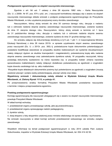 Postępowanie egzaminacyjne na stopień nauczyciela mianowanego. Zgodnie z art. 9d ust. 7 ustawy z dnia 26 stycznia 1982 roku – Karta Nauczyciela (Dz. U. z 2006r. Nr 97, poz. 674 z póź. zm. ) nauczyciel kontraktowy starający się o awans na stopień nauczyciela mianowanego składa wniosek o podjęcie postępowania egzaminacyjnego do Prezydenta Miasta Włocławek, w roku uzyskania pozytywnej oceny dorobku zawodowego. Nauczycielom, którzy złożą wnioski do dnia 30 czerwca danego roku, decyzja o nadaniu lub o odmowie nadania stopnia awansu zawodowego nauczyciela mianowanego, zostanie wydana do dnia 31 sierpnia danego roku. Nauczycielom, którzy złożą wnioski w terminie od 1 lipca do 31 października danego roku, decyzja o nadaniu lub o odmowie nadania stopnia awansu zawodowego nauczyciela mianowanego, zostanie wydana do dnia 31 grudnia danego roku. Do wniosku załącza się dokumentację określoną w § 9 ust. 1 pkt 1 i 2 rozporządzenia Ministra Edukacji Narodowej z dnia 26 marca 2013r. w sprawie uzyskiwania stopni awansu zawodowego przez nauczycieli (Dz. U. z 2013r. poz. 393) tj. poświadczone kopie dokumentów potwierdzających posiadane kwalifikacje zawodowe (w przypadku studiów realizowanych aw systemie dwustopniowym należy dołączyć dyplom ze studiów licencjackich i magisterskich), poświadczoną kopię aktu nadania stopnia awansu zawodowego oraz zaświadczenie dyrektora szkoły. W przypadku nauczycieli, którzy posiadają dokumenty wystawione na różne nazwiska (np. w przypadku kobiet- zmiana nazwiska spowodowana małżeństwem) należy dołączyć dodatkowo poświadczoną za zgodność z oryginałem kopie dowodu osobistego lub np. aktu małżeństwa. Wszystkie kopie składanych dokumentów powinny być potwierdzone za zgodność z oryginałem (muszą zawierać pieczęć i podpis osoby potwierdzającej, pieczęć szkoły oraz datę). Wypełniony wniosek i dokumentację należy składać w Wydziale Edukacji Urzędu Miasta Włocławek, ul. Zielony Rynek 11/13, w pokoju 41. Po przeprowadzeniu analizy formalnej Prezydent Miasta Włocławek powiadamia nauczyciela o terminie i miejscu przeprowadzenia egzaminu. Przebieg postępowania egzaminacyjnego Komisję egzaminacyjną dla nauczycieli ubiegających się o awans na stopień nauczyciela mianowanego powołuje Prezydent Miasta Włocławek W skład komisji wchodzą: 1. przedstawiciel organu prowadzącego szkołę, jako jej przewodniczący, 2. przedstawiciel organu sprawującego nadzór pedagogiczny, 3. dyrektor szkoły, 4. dwaj eksperci z listy ekspertów ustalonej przez ministra właściwego do spraw oświaty i wychowania. Na wniosek nauczyciela w skład komisji wchodzi przedstawiciel wskazanego we wniosku związku zawodowego. Wszelkich informacji na temat postępowań egzaminacyjnych w roku 2014 udziela Pani Justyna Gołuchowska, inspektor w Wydziale Edukacji Urzędu Miasta Włocławek, tel. 054 414 42 50.
