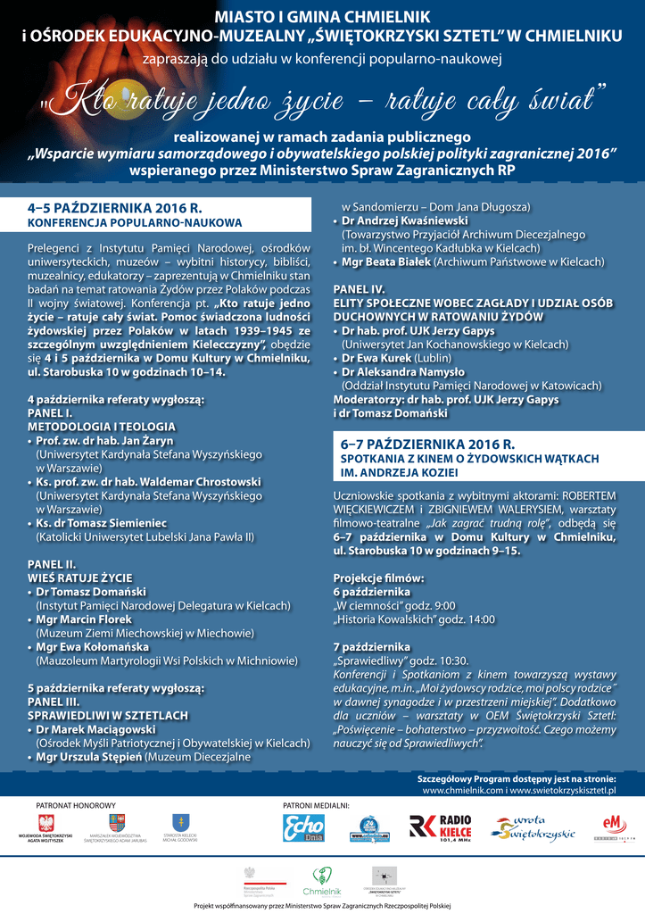 MIASTO I GMINA CHMIELNIK i OŚRODEK EDUKACYJNO-MUZEALNY „ŚWIĘTOKRZYSKI SZTETL” W CHMIELNIKU zapraszają do udziału w konferencji popularno-naukowej „Kto ratuje jedno życie – ratuje cały świat” realizowanej w ramach zadania publicznego „Wsparcie wymiaru samorządowego i obywatelskiego polskiej polityki zagranicznej 2016” wspieranego przez Ministerstwo Spraw Zagranicznych RP 4–5 października 2016 r. Konferencja popularno-naukowa Prelegenci z Instytutu Pamięci Narodowej, ośrodków uniwersyteckich, muzeów – wybitni historycy, bibliści, muzealnicy, edukatorzy – zaprezentują w Chmielniku stan badań na temat ratowania Żydów przez Polaków podczas II wojny światowej. Konferencja pt. „Kto ratuje jedno życie – ratuje cały świat. Pomoc świadczona ludności żydowskiej przez Polaków w latach 1939–1945 ze szczególnym uwzględnieniem Kielecczyzny”, obędzie się 4 i 5 października w Domu Kultury w Chmielniku, ul. Starobuska 10 w godzinach 10–14. 4 października referaty wygłoszą: Panel I. Metodologia i teologia • Prof. zw. dr hab. Jan Żaryn (Uniwersytet Kardynała Stefana Wyszyńskiego w Warszawie) • Ks. prof. zw. dr hab. Waldemar Chrostowski (Uniwersytet Kardynała Stefana Wyszyńskiego w Warszawie) • Ks. dr Tomasz Siemieniec (Katolicki Uniwersytet Lubelski Jana Pawła II) w Sandomierzu – Dom Jana Długosza) • Dr Andrzej Kwaśniewski (Towarzystwo Przyjaciół Archiwum Diecezjalnego im. bł. Wincentego Kadłubka w Kielcach) • Mgr Beata Białek (Archiwum Państwowe w Kielcach) Panel IV. Elity społeczne wobec Zagłady i udział osób duchownych w ratowaniu Żydów • Dr hab. prof. UJK Jerzy Gapys (Uniwersytet Jan Kochanowskiego w Kielcach) • Dr Ewa Kurek (Lublin) • Dr Aleksandra Namysło (Oddział Instytutu Pamięci Narodowej w Katowicach) Moderatorzy: dr hab. prof. UJK Jerzy Gapys i dr Tomasz Domański 6–7 października 2016 r. spotkania z kinem o żydowskich wątkach im. Andrzeja kozieI Panel II. Wieś ratuje życie • Dr Tomasz Domański (Instytut Pamięci Narodowej Delegatura w Kielcach) • Mgr Marcin Florek (Muzeum Ziemi Miechowskiej w Miechowie) • Mgr Ewa Kołomańska (Mauzoleum Martyrologii Wsi Polskich w Michniowie) 5 października referaty wygłoszą: Panel III. Sprawiedliwi w Sztetlach • Dr Marek Maciągowski (Ośrodek Myśli Patriotycznej i Obywatelskiej w Kielcach) • Mgr Urszula Stępień (Muzeum Diecezjalne Uczniowskie spotkania z wybitnymi aktorami: ROBERTEM WIĘCKIEWICZEM i ZBIGNIEWEM WALERYSIEM, warsztaty filmowo-teatralne „Jak zagrać trudną rolę”, odbędą się 6–7 października w Domu Kultury w Chmielniku, ul. Starobuska 10 w godzinach 9–15. Projekcje filmów: 6 października „W ciemności” godz. 9:00 „Historia Kowalskich” godz. 14:00 7 października „Sprawiedliwy” godz. 10:30. Konferencji i Spotkaniom z kinem towarzyszą wystawy edukacyjne, m.in. „Moi żydowscy rodzice, moi polscy rodzice˝ w dawnej synagodze i w przestrzeni miejskiej”. Dodatkowo dla uczniów – warsztaty w OEM Świętokrzyski Sztetl: „Poświęcenie – bohaterstwo – przyzwoitość. Czego możemy nauczyć się od Sprawiedliwych”. Szczegółowy Program dostępny jest na stronie: www.chmielnik.com i www.swietokrzyskisztetl.pl patroni medialni: pATRONAT HONOROWY WOJEWODA ŚWIĘTOKRZYSKI AGATA WOJTYSZEK MARSZAŁEK WOJEWÓDZTWA ŚWIĘTOKRZYSKIEGO ADAM JARUBAS STAROSTA KIELECKI MICHAŁ GODOWSKI OŚRODEK EDUKACYJNO-MUZEALNY „ŚWIĘTOKRZYSKI SZTETL” W CHMIELNIKU Projekt współfinansowany przez Ministerstwo Spraw Zagranicznych Rzeczpospolitej Polskiej