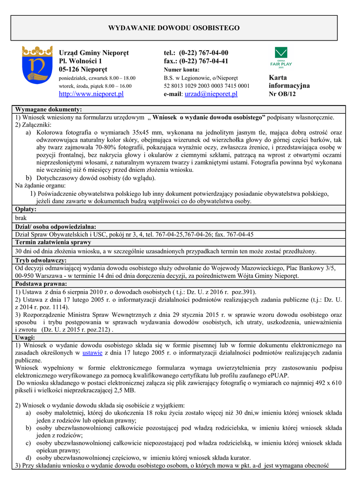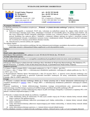 WYDAWANIE DOWODU OSOBISTEGO Urząd Gminy Nieporęt Pl. Wolności 1 05-126 Nieporęt tel.: (0-22) 767-04-00 fax.: (0-22) 767-04-41 wtorek, środa, piątek 8.00 – 16.00 Numer konta: B.S. w Legionowie, o/Nieporęt 52 8013 1029 2003 0003 7415 0001 Karta informacyjna http://www.nieporet.pl e-mail: [email protected] Nr OB/12 poniedziałek, czwartek 8.00 – 18.00 Wymagane dokumenty: 1) Wniosek wniesiony na formularzu urzędowym „ Wniosek o wydanie dowodu osobistego” podpisany własnoręcznie. 2) Załączniki: a) Kolorowa fotografia o wymiarach 35x45 mm, wykonana na jednolitym jasnym tle, mająca dobrą ostrość oraz odwzorowująca naturalny kolor skóry, obejmująca wizerunek od wierzchołka głowy do górnej części barków, tak aby twarz zajmowała 70-80% fotografii, pokazująca wyraźnie oczy, zwłaszcza źrenice, i przedstawiająca osobę w pozycji frontalnej, bez nakrycia głowy i okularów z ciemnymi szkłami, patrzącą na wprost z otwartymi oczami nieprzesłoniętymi włosami, z naturalnym wyrazem twarzy i zamkniętymi ustami. Fotografia powinna być wykonana nie wcześniej niż 6 miesięcy przed dniem złożenia wniosku. b) Dotychczasowy dowód osobisty (do wglądu). Na żądanie organu: 1) Poświadczenie obywatelstwa polskiego lub inny dokument potwierdzający posiadanie obywatelstwa polskiego, jeżeli dane zawarte w dokumentach budzą wątpliwości co do obywatelstwa osoby. Opłaty: brak Dział/ osoba odpowiedzialna: Dział Spraw Obywatelskich i USC, pokój nr 3, 4, tel. 767-04-25,767-04-26; fax. 767-04-45 Termin załatwienia sprawy 30 dni od dnia złożenia wniosku, a w szczególnie uzasadnionych przypadkach termin ten może zostać przedłużony. Tryb odwoławczy: Od decyzji odmawiającej wydania dowodu osobistego służy odwołanie do Wojewody Mazowieckiego, Plac Bankowy 3/5, 00-950 Warszawa - w terminie 14 dni od dnia doręczenia decyzji, za pośrednictwem Wójta Gminy Nieporęt. Podstawa prawna: 1) Ustawa z dnia 6 sierpnia 2010 r. o dowodach osobistych ( t.j.: Dz. U. z 2016 r. poz.391). 2) Ustawa z dnia 17 lutego 2005 r. o informatyzacji działalności podmiotów realizujących zadania publiczne (t.j.: Dz. U. z 2014 r. poz. 1114). 3) Rozporządzenie Ministra Spraw Wewnętrznych z dnia 29 stycznia 2015 r. w sprawie wzoru dowodu osobistego oraz sposobu i trybu postępowania w sprawach wydawania dowodów osobistych, ich utraty, uszkodzenia, unieważnienia i zwrotu (Dz. U. z 2015 r. poz.212) . Uwagi: 1) Wniosek o wydanie dowodu osobistego składa się w formie pisemnej lub w formie dokumentu elektronicznego na zasadach określonych w ustawie z dnia 17 lutego 2005 r. o informatyzacji działalności podmiotów realizujących zadania publiczne. Wniosek wypełniony w formie elektronicznego formularza wymaga uwierzytelnienia przy zastosowaniu podpisu elektronicznego weryfikowanego za pomocą kwalifikowanego certyfikatu lub profilu zaufanego ePUAP. Do wniosku składanego w postaci elektronicznej załącza się plik zawierający fotografię o wymiarach co najmniej 492 x 610 pikseli i wielkości nieprzekraczającej 2,5 MB. 2) Wniosek o wydanie dowodu składa się osobiście z wyjątkiem: a) osoby małoletniej, której do ukończenia 18 roku życia zostało więcej niż 30 dni,w imieniu której wniosek składa jeden z rodziców lub opiekun prawny; b) osoby ubezwłasnowolnionej całkowicie pozostającej pod władzą rodzicielska, w imieniu której wniosek składa jeden z rodziców; c) osoby ubezwłasnowolnionej całkowicie niepozostającej pod władza rodzicielską, w imieniu której wniosek składa opiekun prawny; d) osoby ubezwłasnowolnionej częściowo, w imieniu której wniosek składa kurator. 3) Przy składaniu wniosku o wydanie dowodu osobistego osobom, o których mowa w pkt. a-d jest wymagana obecność osoby małoletniej, jeżeli ukończyła 5 lat, osoby ubezwłasnowolnionej całkowicie oraz osoby ubezwłasnowolnionej częściowo. Załączniki: Urzędowy formularz „Wniosek o wydanie dowodu osobistego”. Opracował: Sebastian Remisz Sprawdziła: Elżbieta Staniszewska Zatwierdził: Sławomir Maciej Mazur