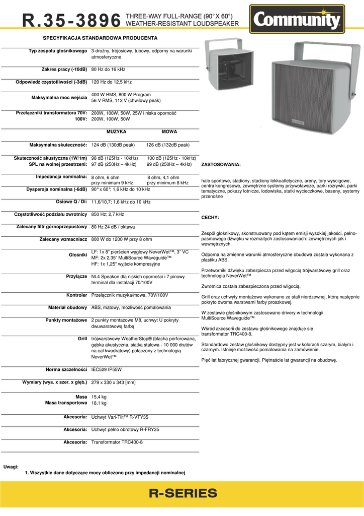 SPECYFIKACJA STANDARDOWA PRODUCENTA Typ zespołu głośnikowego 3-drożny, trójosiowy, tubowy, odporny na warunki atmosferyczne Zakres pracy (-10dB) 80 Hz do 16 kHz Odpowiedź częstotliwości (-3dB) 120 Hz do 12,5 kHz Maksymalna moc wejścia 400 W RMS, 800 W Program 56 V RMS, 113 V (chwilowy peak) Przełączniki transformatora 70V: 200W, 100W, 50W, 25W i niska oporność 100V: 200W, 100W, 50W MUZYKA Maksymalna skuteczność: 124 dB (130dB peak) Skuteczność akustyczna (1W/1m) 98 dB (125Hz - 10kHz) SPL na wolnej przestrzeni: 97 dB (250Hz – 4kHz) MOWA 126 dB (132dB peak) 100 dB (125Hz - 10kHz) 99 dB (250Hz – 4kHz) Impedancja nominalna: 8 ohm, 6 ohm 8 ohm, 4,1 ohm przy minimum 9 kHz przy minimum 8 kHz Dyspersja nominalna (-6dB) 90° x 60°, 1,6 kHz do 10 kHz ZASTOSOWANIA: hale sportowe, stadiony, stadiony lekkoatletyczne, areny, tory wyścigowe, centra kongresowe, zewnętrzne systemy przywoławcze, parki rozrywki, parki tematyczne, pokazy lotnicze, lodowiska, statki wycieczkowe, baseny, systemy przenośne Osiowe Q / Di: 11,6/10,7; 1,6 kHz do 10 kHz Częstotliwość podziału zwrotnicy 850 Hz; 2,7 kHz CECHY: Zalecany filtr górnoprzepustowy 80 Hz 24 dB / oktawa Zalecany wzmacniacz 800 W do 1200 W przy 8 ohm Głośniki LF: 1x 8” pierścień węglowy NeverWet™, 3” VC MF: 2x 2,35” MultiSource Waveguide™ HF: 1x 1,25" wyjście kompresyjne Przyłącze NL4 Speakon dla niskich oporności i 7 pinowy terminal dla instalacji 70/100V Kontroler Przełącznik muzyka/mowa, 70V/100V Zespół głośnikowy, skonstruowany pod kątem emisji wysokiej jakości, pełnopasmowego dźwięku w rozmaitych zastosowaniach: zewnętrznych jak i wewnętrznych. Odporna na zmienne warunki atmosferyczne obudowa została wykonana z plastiku ABS. Przetworniki dźwięku zabezpiecza przed wilgocią trójwarstwowy grill oraz technologia NeverWet™ Zwrotnica została zabezpieczona przed wilgocią. Grill oraz uchwyty montażowe wykonano ze stali nierdzewnej, którą następnie pokryto dwoma warstwami farby proszkowej. Materiał obudowy ABS, matowy, możliwość pomalowania Punkty montażowe 2 punkty montażowe M8, uchwyt U pokryty dwuwarstwową farbą Grill trójwarstwowy WeatherStop® (blacha perforowana, gąbka akustyczna, siatka stalowa - 10 000 drutów na cal kwadratowy) połączony z technologią NeverWet™ Norma szczelności IEC529 IP55W Wymiary (wys. x szer. x głęb.) 279 x 330 x 343 [mm] Masa 15,4 kg Masa transportowa 18,1 kg Akcesoria: Uchwyt Vari-Tilt™ R-VTY35 Akcesoria: Uchwyt pełno obrotowy R-FRY35 Akcesoria: Transformator TRC400-8 Uwagi: 1. Wszystkie dane dotyczące mocy obliczono przy impedancji nominalnej W zestawie głośnikowym zastosowano drivery w technologii MultiSource Waveguide™ Wśród akcesorii do zestawu głośnikowego znajduje się transformator TRC400-8. Standardowo zestaw głośnikowy dostępny jest w kolorach szarym, białym i czarnym. Istnieje możliwość pomalowania na zamówienie. Pięć lat fabrycznej gwarancji. Piętnaście lat gwarancji na obudowę. CHARAKTERYSTYKA CZĘSTOTLIWOŚCIOWA IMPEDANCJA DYSPERSJA Q OSIOWE - Muzyczne WYMIARY