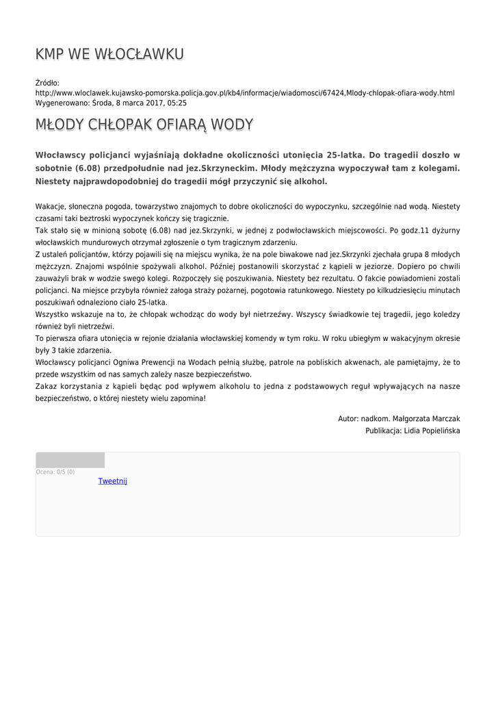 KMP WE WŁOCŁAWKU Źródło: http://www.wloclawek.kujawsko-pomorska.policja.gov.pl/kb4/informacje/wiadomosci/67424,Mlody-chlopak-ofiara-wody.html Wygenerowano: Środa, 8 marca 2017, 05:25 MŁODY CHŁOPAK OFIARĄ WODY Włocławscy policjanci wyjaśniają dokładne okoliczności utonięcia 25-latka. Do tragedii doszło w sobotnie (6.08) przedpołudnie nad jez.Skrzyneckim. Młody mężczyzna wypoczywał tam z kolegami. Niestety najprawdopodobniej do tragedii mógł przyczynić się alkohol. Wakacje, słoneczna pogoda, towarzystwo znajomych to dobre okoliczności do wypoczynku, szczególnie nad wodą. Niestety czasami taki beztroski wypoczynek kończy się tragicznie. Tak stało się w minioną sobotę (6.08) nad jez.Skrzynki, w jednej z podwłocławskich miejscowości. Po godz.11 dyżurny włocławskich mundurowych otrzymał zgłoszenie o tym tragicznym zdarzeniu. Z ustaleń policjantów, którzy pojawili się na miejscu wynika, że na pole biwakowe nad jez.Skrzynki zjechała grupa 8 młodych mężczyzn. Znajomi wspólnie spożywali alkohol. Później postanowili skorzystać z kąpieli w jeziorze. Dopiero po chwili zauważyli brak w wodzie swego kolegi. Rozpoczęły się poszukiwania. Niestety bez rezultatu. O fakcie powiadomieni zostali policjanci. Na miejsce przybyła również załoga straży pożarnej, pogotowia ratunkowego. Niestety po kilkudziesięciu minutach poszukiwań odnaleziono ciało 25-latka. Wszystko wskazuje na to, że chłopak wchodząc do wody był nietrzeźwy. Wszyscy świadkowie tej tragedii, jego koledzy również byli nietrzeźwi. To pierwsza ofiara utonięcia w rejonie działania włocławskiej komendy w tym roku. W roku ubiegłym w wakacyjnym okresie były 3 takie zdarzenia. Włocławscy policjanci Ogniwa Prewencji na Wodach pełnią służbę, patrole na pobliskich akwenach, ale pamiętajmy, że to przede wszystkim od nas samych zależy nasze bezpieczeństwo. Zakaz korzystania z kąpieli będąc pod wpływem alkoholu to jedna z podstawowych reguł wpływających na nasze bezpieczeństwo, o której niestety wielu zapomina! Autor: nadkom. Małgorzata Marczak Publikacja: Lidia Popielińska Ocena: 0/5 (0) Tweetnij