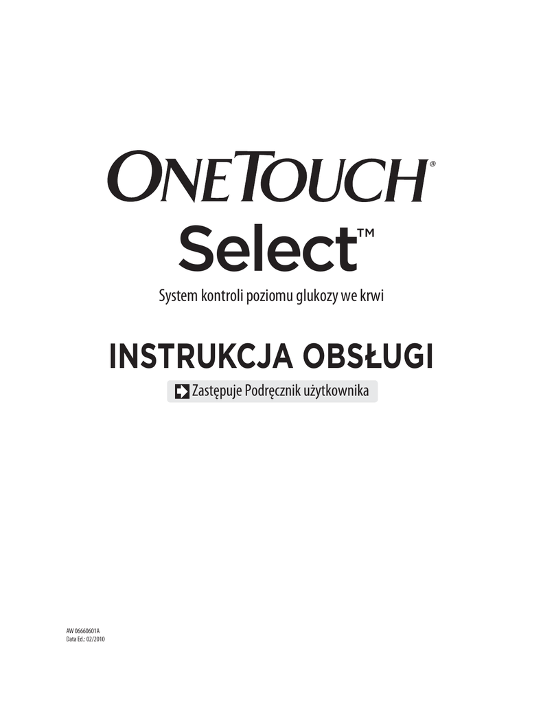 Select ™ System kontroli poziomu glukozy we krwi Instrukcja obsługi Zastępuje Podręcznik użytkownika AW 06660601A Data Ed.: 02/2010 Spis treści: Zapoznanie z glukometrem 1 Ustawianie glukometru 4 Oznaczanie poziomu glukozy 8 Dołączanie znaczników stanu posiłków do wyników pomiarów 16 Przeglądanie poprzednich wyników i obliczanie wartości średnich 18 Testowanie przy użyciu roztworu kontrolnego 20 Dbałość o glukometr 22 8 Wykrywanie i rozwiązywanie usterek oraz szczegółowe informacje o glukometrze 24 Niniejszy glukometr wykorzystuje jeden lub więcej spośród następujących patentów USA: 5,708,247, 5,951,836, 6,241,862, 6,284,125 i 7,112,265. Korzystanie z dołączonego urządzenia monitorującego jest chronione przez jeden lub więcej niż jeden spośród następujących patentów USA: 6,413,410, 6,733,655, 7,250,105, 7,468,125. Zakup urządzenia nie oznacza jednoczesnego udzielenia licencji na użytkowanie rozwiązań chronionych tymi patentami. Licencja taka jest udzielana tylko wówczas, gdy urządzenie jest użytkowane z paskami testowymi OneTouch® Select™. Żaden producent pasków testowych, inny niż LifeScan, nie jest upoważniony do udzielania takiej licencji. Dokładność wyników podawanych przez glukometry LifeScan przy użyciu pasków testowych produkcji innej niż LifeScan, nie była przez firmę LifeScan oceniana. Urządzenia do samodzielnego monitorowania poziomu glukozy we krwi firmy LifeScan są zgodne z następującymi Dyrektywami UE: IVDD (98/79/EC): Glukometr, paski testowe i roztwór kontrolny. Skontaktuj się telefonicznie z działem obsługi klienta LifeScan pod numerem 0 801 23 23 23 lub odwiedź witrynę www.LifeScan.pl Jeżeli nie udaje Ci się skontaktować z działem obsługi klienta LifeScan, w celu uzyskania porady skontaktuj się ze swoim lekarzem. MDD (93/42/EEC): 0120 Ostrza Nakłuwacz Johnson & Johnson Poland Sp. z o.o. ul.Iłżecka 24 Warszawa 02-135 0120 LifeScan, Inc. Milpitas, CA 95035 USA © 2010 LifeScan, Inc. LifeScan Regulatory Affairs Europe Division of Ortho-Clinical Diagnostics France 1, rue Camille Desmoulins – TSA 40007 92787 Issy-les-Moulineaux, Cedex 09 France Zanim zaczniesz Przed wykonaniem pierwszego pomiaru stężenia glukozy we krwi, należy dokładnie przeczytać niniejszą instrukcję obsługi i informacje dołączone do pasków testowych OneTouch® Select™ oraz roztworu kontrolnego OneTouch® Select™. Należy zwrócić uwagę na ostrzeżenia i uwagi zawarte w tej instrukcji obsługi, oznaczone symbolem . Wiele osób uważa za pomocne przed pierwszym pomiarem przy użyciu próbki krwi, przećwiczenie pomiaru przy pomocy roztworu kontrolnego. Patrz sekcja 6, Testowanie przy użyciu roztworu kontrolnego. Przeznaczenie Glukometr OneTouch® Select™ jest przeznaczony do ilościowych pomiarów poziomu glukozy (cukru) w świeżo pobranej próbce krwi z naczyń włosowatych. Glukometr OneTouch® Select™ jest przeznaczony do przeprowadzania testów pozaustrojowych (in vitro) przez osoby chore na cukrzycę w domu, a także w profesjonalnych klinikach oraz jako pomoc przy monitorowaniu efektywności kontroli poziomu glukozy we krwi. Nie stosuje się ich do określenia poziomu glukozy we krwi u noworodków. Metoda pomiaru Glukoza zawarta w próbce krwi miesza się ze specjalnymi odczynnikami zawartymi na pasku testowym, wytwarzając prąd elektryczny. Wielkość prądu zmienia się w zależności od ilości glukozy w próbce krwi. Glukometr mierzy ten prąd, oblicza poziom glukozy we krwi, wyświetla wynik i przechowuje go w pamięci. UWAGA: W przypadku pytań dotyczących glukometru OneTouch® Select™, należy skontaktować się telefonicznie z działem obsługi klienta LifeScan pod numerem 0 801 23 23 23. Zapoznanie z glukometrem Glukometr OneTouch® Select™ ZESTAW ZAWIERA: a.Glukometr OneTouch® Select™ (z dołączoną baterią) b.Nakłuwacz Jeżeli dołączony jest inny typ nakłuwacza, zapoznaj się z oddzielną instrukcją, do niego dołączoną. c. Jałowe ostrze d.Etui e.Paski testowe OneTouch® Select™ c b Jeśli w zestawie brakuje jakiegokolwiek elementu, należy skontaktować się telefonicznie z działem obsługi klienta LifeScan pod numerem infolinii 0 801 23 23 23. SPRZEDAWANE OSOBNO: f. Przeźroczysta nakrętka g.Roztwór kontrolny OneTouch® Select™ d a g f W celu uzyskania informacji o dostępności roztworu kontrolnego, prosimy skontaktować się telefonicznie z działem obsługi klienta LifeScan pod numerem 0 801 23 23 23, poprzez stronę internetową www.LifeScan.pl lub zapytać o roztwór kontrolny w miejscu zakupu pasków testowych. UWAGA: Glukometr wraz z paskami testowymi należy przechowywać poza zasięgiem dzieci. Małe elementy takie jak pokrywka baterii, bateria, paski testowe, ostrza, nakładki zabezpieczające ostrze oraz nakrętka fiolki z roztworem kontrolnym stwarzają ryzyko zadławienia. Nie należy też połykać żadnych innych elementów. ZAPOZNANIE Z GLUKOMETREM 1 e Zapoznanie z glukometrem GLUKOMETR Wyświetlacz PASEK TESTOWY Szczelina glukometru Wsuń tutaj pasek testowy, aby włączyć glukometr celem wykonania pomiaru Krawędź do nanoszenia próbki Okienko kontrolne mg/dL jest jednostką pomiarową, wstępnie ustawioną ▲▼ Wskazuje dostępny wybór przy użyciu przycisku „góra” lub „dół” Przyciski „góra” i „dół” Wybór lub zmiana informacji Przycisk OK Włącza/wyłącza glukometr Potwierdza wybór menu ZAPOZNANIE Z GLUKOMETREM 2 Styki kontaktowe Wsuń w szczelinę glukometru Włączanie glukometru Są dwa sposoby włączania glukometru: Aby wykonać pomiar, należy wsunąć pasek testowy tak głęboko, jak to jest możliwe. Glukometr wykona szybkie sprawdzenie systemu, a następnie włączy się wyświetlacz. Albo Przy wyłączonym glukometrze naciśnij i przytrzymaj przez dwie sekundy przycisk , aby uzyskać dostęp do ekranu MENU GŁÓWNE. OSTRZEŻENIE: Jeśli widoczne są jakiekolwiek jasne obszary wewnątrz czarnego ekr