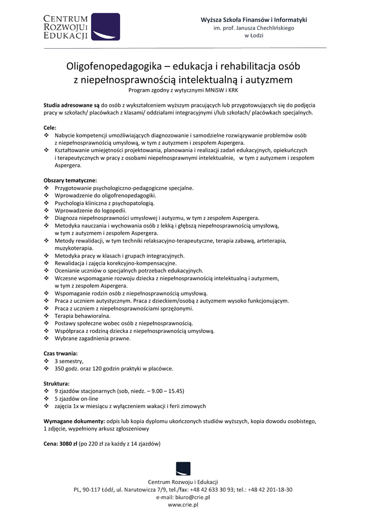 Wyższa Szkoła Finansów i Informatyki im. prof. Janusza Chechlińskiego w Łodzi Oligofenopedagogika – edukacja i rehabilitacja osób z niepełnosprawnością intelektualną i autyzmem Program zgodny z wytycznymi MNiSW i KRK Studia adresowane są do osób z wykształceniem wyższym pracujących lub przygotowujących się do podjęcia pracy w szkołach/ placówkach z klasami/ oddziałami integracyjnymi i/lub szkołach/ placówkach specjalnych. Cele: Nabycie kompetencji umożliwiających diagnozowanie i samodzielne rozwiązywanie problemów osób z niepełnosprawnością umysłową, w tym z autyzmem i zespołem Aspergera. Kształtowanie umiejętności projektowania, planowania i realizacji zadań edukacyjnych, opiekuńczych i terapeutycznych w pracy z osobami niepełnosprawnymi intelektualnie, w tym z autyzmem i zespołem Aspergera. Obszary tematyczne: Przygotowanie psychologiczno-pedagogiczne specjalne. Wprowadzenie do oligofrenopedagogiki. Psychologia kliniczna z psychopatologią. Wprowadzenie do logopedii. Diagnoza niepełnosprawności umysłowej i autyzmu, w tym z zespołem Aspergera. Metodyka nauczania i wychowania osób z lekką i głębszą niepełnosprawnością umysłową, w tym z autyzmem i zespołem Aspergera. Metody rewalidacji, w tym techniki relaksacyjno-terapeutyczne, terapia zabawą, arteterapia, muzykoterapia. Metodyka pracy w klasach i grupach integracyjnych. Rewalidacja i zajęcia korekcyjno-kompensacyjne. Ocenianie uczniów o specjalnych potrzebach edukacyjnych. Wczesne wspomaganie rozwoju dziecka z niepełnosprawnością intelektualną i autyzmem, w tym z zespołem Aspergera. Wspomaganie rodzin osób z niepełnosprawnością umysłową. Praca z uczniem autystycznym. Praca z dzieckiem/osobą z autyzmem wysoko funkcjonującym. Praca z uczniem z niepełnosprawnościami sprzężonymi. Terapia behawioralna. Postawy społeczne wobec osób z niepełnosprawnością. Współpraca z rodziną dziecka z niepełnosprawnością umysłową. Wybrane zagadnienia prawne. Czas trwania: 3 semestry, 350 godz. oraz 120 godzin praktyki w placówce. Struktura: 9 zjazdów stacjonarnych (sob, niedz. – 9.00 – 15.45) 5 zjazdów on-line zajęcia 1x w miesiącu z wyłączeniem wakacji i ferii zimowych Wymagane dokumenty: odpis lub kopia dyplomu ukończonych studiów wyższych, kopia dowodu osobistego, 1 zdjęcie, wypełniony arkusz zgłoszeniowy Cena: 3080 zł (po 220 zł za każdy z 14 zjazdów)