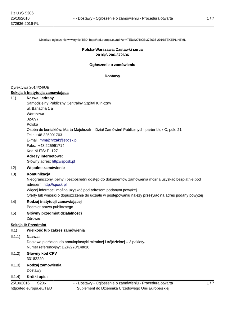 Dz.U./S S206 25/10/2016 372636-2016-PL - - Dostawy - Ogłoszenie o zamówieniu - Procedura otwarta 1/7 Niniejsze ogłoszenie w witrynie TED: http://ted.europa.eu/udl?uri=TED:NOTICE:372636-2016:TEXT:PL:HTML Polska-Warszawa: Zastawki serca 2016/S 206-372636 Ogłoszenie o zamówieniu Dostawy Dyrektywa 2014/24/UE Sekcja I: Instytucja zamawiająca I.1) Nazwa i adresy Samodzielny Publiczny Centralny Szpital Kliniczny ul. Banacha 1 a Warszawa 02-097 Polska Osoba do kontaktów: Marta Majchrzak – Dział Zamówień Publicznych, parter blok C, pok. 21 Tel.: +48 225991703 E-mail: [email protected] Faks: +48 225991714 Kod NUTS: PL127 Adresy internetowe: Główny adres: http://spcsk.pl I.2) Wspólne zamówienie I.3) Komunikacja Nieograniczony, pełny i bezpośredni dostęp do dokumentów zamówienia można uzyskać bezpłatnie pod adresem: http://spcsk.pl Więcej informacji można uzyskać pod adresem podanym powyżej Oferty lub wnioski o dopuszczenie do udziału w postępowaniu należy przesyłać na adres podany powyżej I.4) Rodzaj instytucji zamawiającej Podmiot prawa publicznego I.5) Główny przedmiot działalności Zdrowie Sekcja II: Przedmiot II.1) Wielkość lub zakres zamówienia II.1.1) Nazwa: Dostawa pierścieni do annuloplastyki mitralnej i trójdzielnej – 2 pakiety. Numer referencyjny: DZP/270/148/16 II.1.2) Główny kod CPV 33182220 II.1.3) Rodzaj zamówienia Dostawy II.1.4) Krótki opis: 25/10/2016 S206 http://ted.europa.eu/TED - - Dostawy - Ogłoszenie o zamówieniu - Procedura otwarta Suplement do Dziennika Urzędowego Unii Europejskiej 1/7 Dz.U./S S206 25/10/2016 372636-2016-PL - - Dostawy - Ogłoszenie o zamówieniu - Procedura otwarta 2/7 Dostawa pierścieni do annuloplastyki mitralnej i trójdzielnej – 2 pakiety. II.1.5) Szacunkowa całkowita wartość Wartość bez VAT: 65 250.00 PLN II.1.6) Informacje o częściach To zamówienie podzielone jest na części: tak Oferty można składać w odniesieniu do wszystkich części II.2) Opis II.2.1) Nazwa: Pakiet 1 Część nr: 1 II.2.2) Dodatkowy kod lub kody CPV 33182200 II.2.3) Miejsce świadczenia usług Kod NUTS: PL127 Główne miejsce lub lokalizacja realizacji: Samodzielny Publiczny Centralny Szpital Kliniczny w Warszawie, ul. Banacha 1a. II.2.4) Opis zamówienia: Pierścienie do annuloplastyki mitralnej półsztywne (szczegółowy opis asortymentowo-ilościowy zawiera Specyfikacja Istotnych Warunków Zamówienia). II.2.5) Kryteria udzielenia zamówienia Kryteria określone poniżej Cena II.2.6) Szacunkowa wartość Wartość bez VAT: 57 750.00 PLN II.2.7) Okres obowiązywania zamówienia, umowy ramowej lub dynamicznego systemu zakupów Okres w miesiącach: 24 Niniejsze zamówienie podlega wznowieniu: nie II.2.10) Informacje o ofertach wariantowych Dopuszcza się składanie ofert wariantowych: nie II.2.11) Informacje o opcjach Opcje: nie II.2.12) Informacje na temat katalogów elektronicznych II.2.13) Informacje o funduszach Unii Europejskiej Zamówienie dotyczy projektu/programu finansowanego ze środków Unii Europejskiej: nie II.2.14) Informacje dodatkowe II.2) Opis II.2.1) Nazwa: Pakiet 2 Część nr: 2 II.2.2) Dodatkowy kod lub kody CPV 33182200 II.2.3) Miejsce świadczenia usług 25/10/2016 S206 http://ted.europa.eu/TED - - Dostawy - Ogłoszenie o zamówieniu - Procedura otwarta Suplement do Dziennika Urzędowego Unii Europejskiej 2/7 Dz.U./S S206 25/10/2016 372636-2016-PL - - Dostawy - Ogłoszenie o zamówieniu - Procedura otwarta 3/7 Kod NUTS: PL127 Główne miejsce lub lokalizacja realizacji: Samodzielny Publiczny Centralny Szpital Kliniczny w Warszawie, ul. Banacha 1a. II.2.4) Opis zamówienia: Pierścienie do annuloplastyki trójdzielnej półsztywne (szczegółowy opis asortymentowo-ilościowy zawiera Specyfikacja Istotnych Warunków Zamówienia). II.2.5) Kryteria udzielenia zamówienia Kryteria określone poniżej Cena II.2.6) Szacunkowa wartość Wartość bez VAT: 7 500.00 PLN II.2.7) Okres obowiązywania zamówienia, umowy ramowej lub dynamicznego systemu zakupów Okres w miesiącach: 24 Niniejsze zamówienie podlega wznowieniu: nie II.2.10) Informacje o ofertach wariantowych Dopuszcza się składanie ofert wariantowych: nie II.2.11) Informacje o opcjach Opcje: nie II.2.12) Informacje na temat katalogów elektronicznych II.2.13) Informacje o funduszach Unii Europejskiej Zamówienie dotyczy projektu/programu finansowanego ze środków Unii Europejskiej: nie II.2.14) Informacje dodatkowe Sekcja III: Informacje o charakterze prawnym, ekonomicznym, finansowym i technicznym III.1) Warunki udziału III.1.1) Zdolność do prowadzenia działalności zawodowej, w tym wymogi związane z wpisem do rejestru zawodowego lub handlowego Wykaz i krótki opis warunków: 1. O udzielenie zamówienia mogą ubiegać się Wykonawcy, którzy: 1.1. nie podlegają wykluczeniu na podst. art. 24 ust.1 oraz art.24 ust. 5 pkt. 1 i 8 ustawy z 29.1.2004 Prawo zamówień publicznych (Dz.U. 2015 poz.2164 z późn. zm.) zwanej dalej ustawą Pzp. 1.2. spełniają warunki udziału w postępowaniu: 1.2.1. dotyczące kompetencji lub uprawnień do prowadzenia określonej działalności zawodowej, o ile wynika to z odrębnych przepisów. Zamawiający nie precyzuje żadnych szczególnych wymagań w tym zakresie. 1.2.2. określone w cz. III 1.2) oraz III 1.3) ogłoszenia 1.3. W przypadku Wykonawców wspólnie ubiegających się o udzielenie zamówienia, warunki określ. w pkt.1.2.1. i 1.2.2., o ile zostały one określone przez Zamawiającego, mogą oni spełniać łącznie, natomiast wykazanie braku podstaw wykluczenia, o których mowa w pkt.1.1. musi wykazać każdy z Wykonawców. 2. Zamawiający wykluczy z postępowania 2.1. Wykonawcę wobec którego zachodzą przesłanki określ.w art.24 ust.1 z uwzględnieniem art.24 ust.7 oraz art.24 ust.5 pkt 1 i 8 ustawy Pzp. 2.2. Wykonawcę, który nie złoży wymaganych oświadczeń lub dokumentów lub nie spełni innych wymagań określonych w ustawie Pzp i SIWZ. 25/10/2016 S206 http://ted.europa.eu/TED -