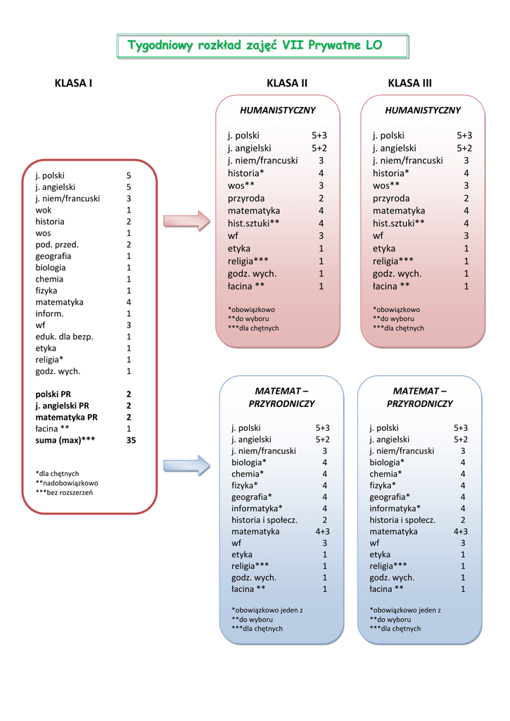 Tygodniowy rozkład zajęć VII Prywatne LO KLASA I KLASA II KLASA III HUMANISTYCZNY j. polski j. angielski j. niem/francuski wok historia wos pod. przed. geografia biologia chemia fizyka matematyka inform. wf eduk. dla bezp. etyka religia* godz. wych. 5 5 3 1 2 1 2 1 1 1 1 4 1 3 1 1 1 1 polski PR j. angielski PR matematyka PR łacina ** suma (max)*** 2 2 2 1 35 *dla chętnych **nadobowiązkowo ***bez rozszerzeń j. polski j. angielski j. niem/francuski historia* wos** przyroda matematyka hist.sztuki** wf etyka religia*** godz. wych. łacina ** HUMANISTYCZNY 5+3 5+2 3 4 3 2 4 4 3 1 1 1 1 *obowiązkowo **do wyboru ***dla chętnych *obowiązkowo jeden z **do wyboru ***dla chętnych 5+3 5+2 3 4 3 2 4 4 3 1 1 1 1 *obowiązkowo **do wyboru ***dla chętnych MATEMAT – PRZYRODNICZY j. polski j. angielski j. niem/francuski biologia* chemia* fizyka* geografia* informatyka* historia i społecz. matematyka wf etyka religia*** godz. wych. łacina ** j. polski j. angielski j. niem/francuski historia* wos** przyroda matematyka hist.sztuki** wf etyka religia*** godz. wych. łacina ** MATEMAT – PRZYRODNICZY 5+3 5+2 3 4 4 4 4 4 2 4+3 3 1 1 1 1 j. polski j. angielski j. niem/francuski biologia* chemia* fizyka* geografia* informatyka* historia i społecz. matematyka wf etyka religia*** godz. wych. łacina ** *obowiązkowo jeden z **do wyboru ***dla chętnych 5+3 5+2 3 4 4 4 4 4 2 4+3 3 1 1 1 1