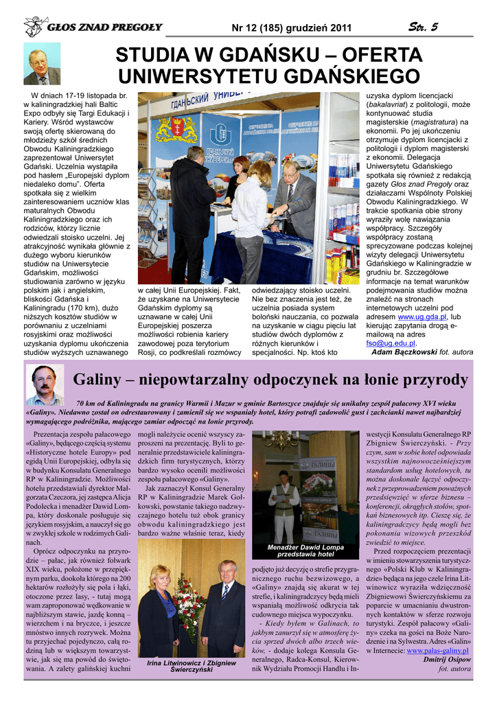 Nr 12 (185) grudzień 2011 Str. 5 STUDIA W GDAŃSKU – OFERTA UNIWERSYTETU GDAŃSKIEGO W dniach 17-19 listopada br. w kaliningradzkiej hali Baltic Expo odbyły się Targi Edukacji i Kariery. Wśród wystawców swoją ofertę skierowaną do młodzieży szkół średnich Obwodu Kaliningradzkiego zaprezentował Uniwersytet Gdański. Uczelnia wystąpiła pod hasłem „Europejski dyplom niedaleko domu”. Oferta spotkała się z wielkim zainteresowaniem uczniów klas maturalnych Obwodu Kaliningradzkiego oraz ich rodziców, którzy licznie odwiedzali stoisko uczelni. Jej atrakcyjność wynikała głównie z dużego wyboru kierunków studiów na Uniwersytecie Gdańskim, możliwości studiowania zarówno w języku polskim jak i angielskim, bliskości Gdańska i Kaliningradu (170 km), dużo niższych kosztów studiów w porównaniu z uczelniami rosyjskimi oraz możliwości uzyskania dyplomu ukończenia studiów wyższych uznawanego w całej Unii Europejskiej. Fakt, że uzyskane na Uniwersytecie Gdańskim dyplomy są uznawane w całej Unii Europejskiej poszerza możliwości robienia kariery zawodowej poza terytorium Rosji, co podkreślali rozmówcy odwiedzający stoisko uczelni. Nie bez znaczenia jest też, że uczelnia posiada system boloński nauczania, co pozwala na uzyskanie w ciągu pięciu lat studiów dwóch dyplomów z różnych kierunków i specjalności. Np. ktoś kto uzyska dyplom licencjacki (bakalavriat) z politologii, może kontynuować studia magisterskie (magistratura) na ekonomii. Po jej ukończeniu otrzymuje dyplom licencjacki z politologii i dyplom magisterski z ekonomii. Delegacja Uniwersytetu Gdańskiego spotkała się również z redakcją gazety Głos znad Pregoły oraz działaczami Wspólnoty Polskiej Obwodu Kaliningradzkiego. W trakcie spotkania obie strony wyraziły wolę nawiązania współpracy. Szczegóły współpracy zostaną sprecyzowane podczas kolejnej wizyty delegacji Uniwersytetu Gdańskiego w Kaliningradzie w grudniu br. Szczegółowe informacje na temat warunków podejmowania studiów można znaleźć na stronach internetowych uczelni pod adresem www.ug.gda.pl, lub kierując zapytania drogą emailową na adres [email protected]. Adam Bączkowski fot. autora Galiny – niepowtarzalny odpoczynek na łonie przyrody 70 km od Kaliningradu na granicy Warmii i Mazur w gminie Bartoszyce znajduje się unikalny zespół pałacowy XVI wieku «Galiny». Niedawno został on odrestaurowany i zamienił się we wspaniały hotel, który potrafi zadowolić gust i zachcianki nawet najbardziej wymagającego podróżnika, mającego zamiar odpocząć na łonie przyrody. Prezentacja zespołu pałacowego «Galiny», będącego częścią systemu «Historyczne hotele Europy» pod egidą Unii Europejskiej, odbyła się w budynku Konsulatu Generalnego RP w Kaliningradzie. Możliwości hotelu przedstawiali dyrektor Małgorzata Czeczora, jej zastępca Alicja Podolecka i menadżer Dawid Lompa, który doskonale posługuje się językiem rosyjskim, a nauczył się go w zwykłej szkole w rodzimych Galinach. Oprócz odpoczynku na przyrodzie – pałac, jak również folwark XIX wieku, położone w przepięknym parku, dookoła którego na 200 hektarów rozłożyły się pola i łąki, otoczone przez lasy, - tutaj mogą wam zaproponować wędkowanie w najbliższym stawie, jazdę konną – wierzchem i na bryczce, i jeszcze mnóstwo innych rozrywek. Można tu przyjechać pojedynczo, całą rodziną lub w większym towarzystwie, jak się ma powód do świętowania. A zalety galińskiej kuchni mogli należycie ocenić wszyscy zaproszeni na prezentację. Byli to generalnie przedstawiciele kaliningradzkich firm turystycznych, którzy bardzo wysoko ocenili możliwości zespołu pałacowego «Galiny». Jak zaznaczył Konsul Generalny RP w Kaliningradzie Marek Gołkowski, powstanie takiego nadzwyczajnego hotelu tuż obok granicy obwodu kaliningradzkiego jest bardzo ważne właśnie teraz, kiedy Menadżer Dawid Lompa przedstawia hotel Irina Litwinowicz i Zbigniew Świerczyński podjęto już decyzję o strefie przygranicznego ruchu bezwizowego, a «Galiny» znajdą się akurat w tej strefie, i kaliningradczycy będą mieli wspaniałą możliwość odkrycia tak cudownego miejsca wypoczynku. - Kiedy byłem w Galinach, to jakbym zanurzył się w atmosferę życia sprzed dwóch albo trzech wieków, - dodaje kolega Konsula Generalnego, Radca-Konsul, Kierownik Wydziału Promocji Handlu i In- westycji Konsulatu Generalnego RP Zbigniew Świerczyński. - Przy czym, sam w sobie hotel odpowiada wszystkim najnowocześniejszym standardom usług hotelowych, tu można doskonale łączyć odpoczynek z przeprowadzeniem poważnych przedsięwzięć w sferze biznesu – konferencji, okrągłych stołów, spotkań biznesowych itp. Cieszę się, że kaliningradczycy będą mogli bez pokonania wizowych przeszkód zwiedzić to miejsce. Przed rozpoczęciem prezentacji w imieniu stowarzyszenia turystycznego «Polski Klub w Kaliningradzie» będąca na jego czele Irina Litwinowicz wyraziła wdzięczność Zbigniewowi Świerczyńskiemu za poparcie w umacnianiu dwustronnych kontaktów w sferze rozwoju turystyki. Zespół pałacowy «Galiny» czeka na gości na Boże Narodzenie i na Sylwestra. Adres «Galin» w Internecie: www.palas-galiny.pl Dmitrij Osipow fot. autora