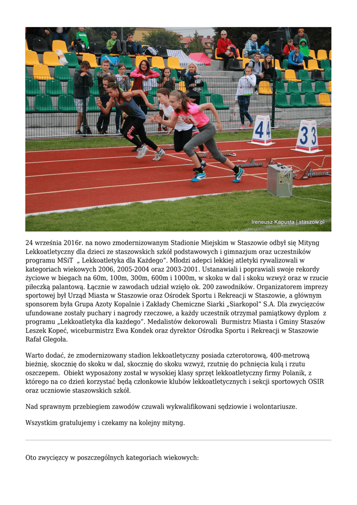 24 września 2016r. na nowo zmodernizowanym Stadionie Miejskim w Staszowie odbył się Mityng Lekkoatletyczny dla dzieci ze staszowskich szkół podstawowych i gimnazjum oraz uczestników programu MSiT „ Lekkoatletyka dla Każdego”. Młodzi adepci lekkiej atletyki rywalizowali w kategoriach wiekowych 2006, 2005-2004 oraz 2003-2001. Ustanawiali i poprawiali swoje rekordy życiowe w biegach na 60m, 100m, 300m, 600m i 1000m, w skoku w dal i skoku wzwyż oraz w rzucie piłeczką palantową. Łącznie w zawodach udział wzięło ok. 200 zawodników. Organizatorem imprezy sportowej był Urząd Miasta w Staszowie oraz Ośrodek Sportu i Rekreacji w Staszowie, a głównym sponsorem była Grupa Azoty Kopalnie i Zakłady Chemiczne Siarki „Siarkopol” S.A. Dla zwycięzców ufundowane zostały puchary i nagrody rzeczowe, a każdy uczestnik otrzymał pamiątkowy dyplom z programu „Lekkoatletyka dla każdego”. Medalistów dekorowali Burmistrz Miasta i Gminy Staszów Leszek Kopeć, wiceburmistrz Ewa Kondek oraz dyrektor Ośrodka Sportu i Rekreacji w Staszowie Rafał Glegoła. Warto dodać, że zmodernizowany stadion lekkoatletyczny posiada czterotorową, 400-metrową bieżnię, skocznię do skoku w dal, skocznię do skoku wzwyż, rzutnię do pchnięcia kulą i rzutu oszczepem. Obiekt wyposażony został w wysokiej klasy sprzęt lekkoatletyczny firmy Polanik, z którego na co dzień korzystać będą członkowie klubów lekkoatletycznych i sekcji sportowych OSIR oraz uczniowie staszowskich szkół. Nad sprawnym przebiegiem zawodów czuwali wykwalifikowani sędziowie i wolontariusze. Wszystkim gratulujemy i czekamy na kolejny mityng. Oto zwycięzcy w poszczególnych kategoriach wiekowych: Dziewczęta 60m rocznik 2006 1 Arendarska Alicja 2 Mazgaj Kornelia 3 Cuber Alicja PSP nr 2 Staszów PSP Mostki PSP nr 2 Staszów 9.31 10.57 10.95 60m rocznik 2005-2004 1 2 3 Szydłowska Julia Obara Alicja Masternak Oliwia Żaczek Połaniec KKL KKL 8.91 9.04 9.11 100m rocznik 2003-2001 1 Wójtowicz Olga 2 Żywczyk Natalia 3 Płocharczyk Weronika Żaczek Połaniec UKS „Czwórka” Ostrowiec Żaczek Połaniec 13.73 14.23 14.34 600m rocznik 2005-2004 1 Rzepa Alicja 2 Jacak Magdalena 3 Mocak Oliwia PSP Czajków PSP Kurozwęki PSP Mostki 2:13,44 2:15,64 2:17,87 600m rocznik 2003-2001 1 Legiecka Kamila 2 Chmiel Natalia 3 Lewmowska Iga PG nr 2 Staszów KKL KKL 1:46,44 1:47,50 1:56,58 300m rocznik 2006 1 Arendarska Alicja 2 Błasiak Angelika 3 Strzyż Aleksandra PSP nr 2 Staszów PSP Czajków PSP Mostki 59.23 60.91 62.19 300m rocznik 2005-2004 1 Łukaszek Martyna 2 Fortuna Julia 3 Kosakowska Aleksandra PSP nr 2 Staszów PSP nr 2 Staszów PSP nr 2 Staszów 54.41 55.76 59.89 Żaczek Połaniec PG nr 2 Staszów PG Czajków 50.30 51.97 53.41 300m rocznik 2003-2001 1 Płocharczyk Weronika 2 Bednarska Weronika 3 Gozdek Kamila Skok w dal rocznik 2006 1 Jońca Patrycja 2 Błasiak Angelika 3 Miska Natalia PSP nr 2 Staszów PSP Czajków PSP nr 2 Staszów 3,10 3,09 3,08 Skok w dal rocznik 2005-2004 1 2 3 Szydłowska Julia Masternak Oliwia Obara Alicja Żaczek Pałaniec KKL KKL 4,30 4,18 3,88 Skok w dal rocznik 2003-2001 1 Kubik Julia 2 Żywczyk Patrycja 3 Kot Patrycja PG Czajków UKS „ Czwórka” Ostrowiec PG nr 2 Staszów 4,29 4,22 4,06 Skok wzwyż 2003-2001 1 Kuzdak Magdalena 2 Uss Wąsowicz Klaudia 3 Staneta Wiktoria UKS „ Czwórka” Ostrowiec PG nr 2 Staszów PG nr 2 Staszów 125 115 115 Rzut piłeczką palantową rocznik 2006 1 Mazgaj Kornelia 2 Miska Natalia 3 Brzyszcz Julia PSP Mostki PSP nr 2 Staszów PSP nr 2 Staszów 22,50 16,50 14,00 Rzut piłeczką palantową rocznik 2005-2004 1 Pentek Julia 2 Pała Wiktoria 3 Wójcicka Julia PSP nr 1 Staszów PSP nr 2 Staszów PSP nr 1 Staszów 34,00 33,00 32,50 Żaczek Połaniec PSP Kurozwęki Żaczek Połaniec 9.96 10.18 10.20 Chłopcy 60m rocznik 2006 1 Przybyło Oskar 2 Fit Emil 3 Godzwon Jakub 60m rocznik 2005-2004 1 Godzwon Kacper 2 Sadłocha Fryderyk 3 Płużek Oliwier Żaczek Połaniec PSP nr 2 Staszów Żaczek Połaniec 8.40 9.21 9.34 Żaczek Połaniec PSP nr 2 Staszów 8.40 9.21 60m rocznik 2005-2004 1 Godzwon Kacper 2 Sadłocha Fryderyk 3 Płużek Oliwier Żaczek Połaniec 9.34 1000m rocznik 2005-2004 1 Fudalewski Michał 2 Koryciński Marcel 3 Małek Patryk PSP Kurozwęki PSP nr 1 Staszów PSP Czajków 3:27,52 3:31,64 4:08,19 1000m rocznik 2003-2001 1 Podsiedlik Mateusz 2 Kędziora Adam 3 Jakubczyk Wiktor PG nr 2 Staszów KKL KKL 3:01,21 3:04,44 3:05,29 300m rocznik 2006 1 Kwasek Patryk 2 Tokarski Bartosz 3 Przybyło Oskar PSP Czajków PSP nr 1 Staszów Żaczek Połaniec 54.20 54.61 56.18 Żaczek Połaniec PSP Koniemłoty PSP Kurozwęki 49.90 51.69 52.54 300m rocznik 2005-2004 1 Płużek Oliwier 2 Jońca Wojciech 3 Oliverio Salvatore 300m rocznik 2003-2001 1 Sobura-Durma Jakub 2 Bąk Kacper 3 Lech Łukasz KKL Żaczek Połaniec PG nr 2 Staszów 39.28 41.74 41.86 Skok w dal rocznik 2006 1 Wawrzkiewicz Bartosz 2 Szydłowski Igor 3 Kosik Bartłomiej PSP nr 1 Staszów Żaczek Połaniec PSP nr 2 Staszów 3,52 3,48 3,36 Skok w dal rocznik 2005-2004 1 Sadłocha Fryderk 2 Falasa Bartosz 3 Bednarski Konrad PSP nr 2 Staszów PSP nr 2 Staszów PSP Czajków 3,75 3,62 3,58 Skok w dal rocznik 2003-2001 1 Kubik Krystian 2 Skuza Kacper 3 Klank Aleksander PG Czajków PG nr 2 Staszów KKL Rzut piłeczką palantową rocznik 2006 5.27 4,95 4,63 1 Kosik Bartek 2 Kwasek Patryk 3 Pluciński Krystian PSP nr 2 Staszów PSP Czajków PSP nr 2 Staszów 40,00 35,00 33,00 Rzut piłeczką palantową rocznik 2005-2004 1 Godzwon Kacper 2 Markowski Michał 3 Jońca Wojciech Żaczek Połaniec PSP Mostki PSP nr Koniemłoty 53,50 39,00 36,00 Skok wzwyż rocznik 2003-2001 1 Bąk Kacper Żaczek Połaniec 155