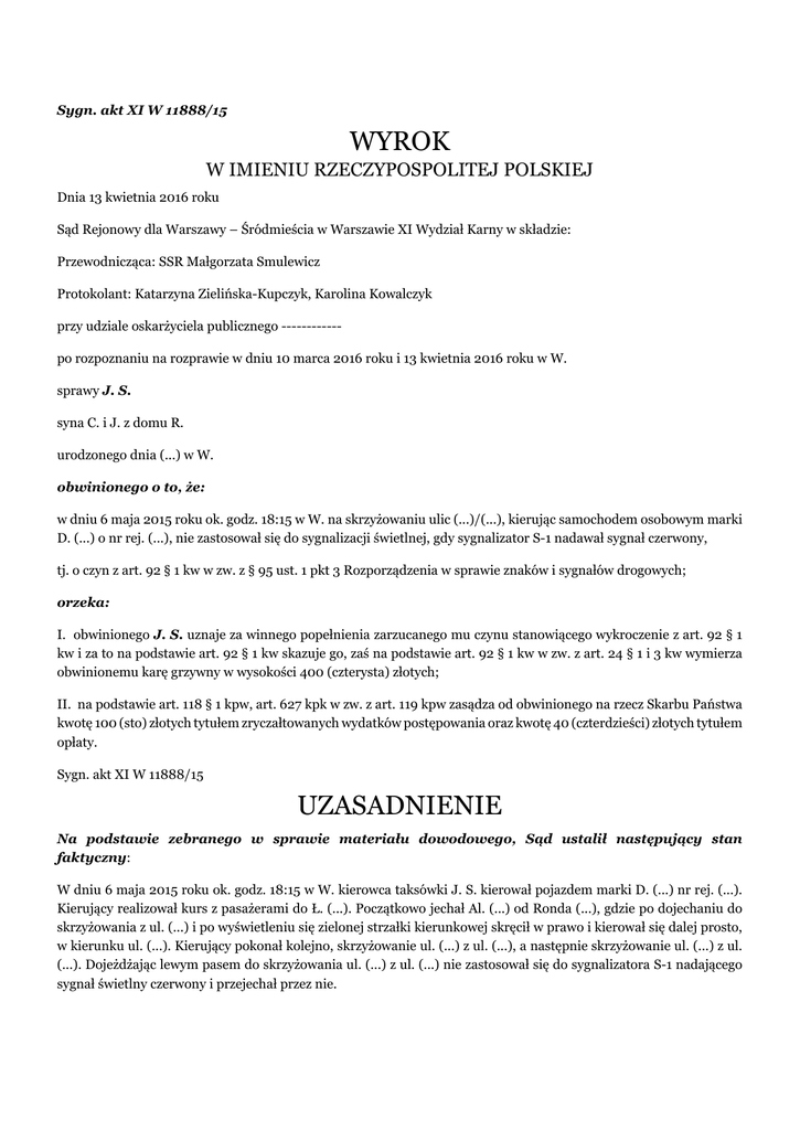 Sygn. akt XI W 11888/15 WYROK W IMIENIU RZECZYPOSPOLITEJ POLSKIEJ Dnia 13 kwietnia 2016 roku Sąd Rejonowy dla Warszawy – Śródmieścia w Warszawie XI Wydział Karny w składzie: Przewodnicząca: SSR Małgorzata Smulewicz Protokolant: Katarzyna Zielińska-Kupczyk, Karolina Kowalczyk przy udziale oskarżyciela publicznego -----------po rozpoznaniu na rozprawie w dniu 10 marca 2016 roku i 13 kwietnia 2016 roku w W. sprawy J. S. syna C. i J. z domu R. urodzonego dnia (...) w W. obwinionego o to, że: w dniu 6 maja 2015 roku ok. godz. 18:15 w W. na skrzyżowaniu ulic (...)/(...), kierując samochodem osobowym marki D. (...) o nr rej. (...), nie zastosował się do sygnalizacji świetlnej, gdy sygnalizator S-1 nadawał sygnał czerwony, tj. o czyn z art. 92 § 1 kw w zw. z § 95 ust. 1 pkt 3 Rozporządzenia w sprawie znaków i sygnałów drogowych; orzeka: I. obwinionego J. S. uznaje za winnego popełnienia zarzucanego mu czynu stanowiącego wykroczenie z art. 92 § 1 kw i za to na podstawie art. 92 § 1 kw skazuje go, zaś na podstawie art. 92 § 1 kw w zw. z art. 24 § 1 i 3 kw wymierza obwinionemu karę grzywny w wysokości 400 (czterysta) złotych; II. na podstawie art. 118 § 1 kpw, art. 627 kpk w zw. z art. 119 kpw zasądza od obwinionego na rzecz Skarbu Państwa kwotę 100 (sto) złotych tytułem zryczałtowanych wydatków postępowania oraz kwotę 40 (czterdzieści) złotych tytułem opłaty. Sygn. akt XI W 11888/15 UZASADNIENIE Na podstawie zebranego w sprawie materiału dowodowego, Sąd ustalił następujący stan faktyczny: W dniu 6 maja 2015 roku ok. godz. 18:15 w W. kierowca taksówki J. S. kierował pojazdem marki D. (...) nr rej. (...). Kierujący realizował kurs z pasażerami do Ł. (...). Początkowo jechał Al. (...) od Ronda (...), gdzie po dojechaniu do skrzyżowania z ul. (...) i po wyświetleniu się zielonej strzałki kierunkowej skręcił w prawo i kierował się dalej prosto, w kierunku ul. (...). Kierujący pokonał kolejno, skrzyżowanie ul. (...) z ul. (...), a następnie skrzyżowanie ul. (...) z ul. (...). Dojeżdżając lewym pasem do skrzyżowania ul. (...) z ul. (...) nie zastosował się do sygnalizatora S-1 nadającego sygnał świetlny czerwony i przejechał przez nie. W tym czasie, w tym rejonie znajdował się radiowóz policyjny z patrolem, w osobach funkcjonariuszy Ł. K. oraz P. J.. Gdy kierujący pojazdem D. pokonywał na czerwonym świetle skrzyżowanie ul. (...) z ul. (...), znajdowali się na prawym pasie przed tym skrzyżowaniem oczekując na zmianę sygnalizacji świetlnej na kolor zielony. Natychmiast po zaistnieniu przedmiotowego wykroczenia podjęli interwencje wobec kierowcy taksówki. Pomimo używania sygnałów świetlnych i dźwiękowych, kierujący w/w pojazdem zatrzymał się dopiero na ulicy (...) na wysokości numer (...) za skrzyżowaniem z ulicą (...). Kierujący po zatrzymaniu kwestionował przyczynę interwencji funkcjonariuszy. Podczas czynności kierujący D. próbował wysiąść z pojazdu, wówczas jeden z policjantów przytrzymał drzwi, uniemożliwiając mu opuszczenie pojazdu. Po informacji od kierowcy, iż jego dokumenty znajdują się w bagażniku, policjant zezwolił na wyjście z samochodu i wyjęcie ich z bagażnika. Klienci taksówki opuścili pojazd i udali się w dalszą drogę inną taksówką. Ostatecznie, J. S. odmówił przyjęcia mandatu karnego kredytowanego w wysokości 400 złotych oraz 6 punktów karnych. Powyższy stan faktyczny Sąd ustalił w oparciu o częściowo wyjaśnienia obwinionego J. S. (zapis audiowizualny rozprawy z dnia 10 marca 2016 roku, minuty od: 00:06:47 do 00:16:35, k. 27v, k. 6), zeznania świadka Ł. K. (zapis audiowizualny rozprawy z dnia 10 marca 2016 roku, minuty od: 00:16:35 do 00:28:30, k. 27v), zeznania świadka P. J. (zapis audiowizualny rozprawy z dnia 13 kwietnia 2016 roku, minuty od: 00:02:14 do 00:11:40, k. 40) oraz dokumentację w postaci: notatki urzędowej (k.1), informację z KRK (k. 7), sprzeciw obwinionego (k. 18)oraz kserokopie notatników służbowych (k. 33-37). Obwiniony przesłuchiwany w toku czynności wyjaśniających, jak i w trakcie postępowania sądowego, nie przyznał się do popełnienia zarzucanego mu czynu. Na rozprawie w dniu 10 marca 2016 roku obwiniony wyjaśnił, iż będąc kierowcą taksówki realizował kurs z cudzoziemcami do Ł. (...). Po dojechaniu do skrzyżowania Al. (...) z ul. (...) i zapaleniu się zielonej strzałki kierunkowej, obwiniony skręcił w prawo i dalej poruszał się prosto w kierunku ul. (...). Zdaniem obwinionego, dalej przez całą trasę jadąc ul. (...) i mijając kolejne skrzyżowania z ul. (...), ul. (...) oraz ul. (...) miał zieloną sekwencję świateł. Twierdził, że taka sytuacja ma miejsce zawsze na wskazanym powyżej odcinku trasy. Obwiniony twierdził, iż nie zatrzymał się natychmiast na żądanie funkcjonariuszy, gdyż nie używali sygnałów świetlnych ani dźwiękowych, a on zatrzymał się za ulicą (...), gdyż intuicyjnie pomyślał, że jadący za nim radiowóz może chcieć podjąć interwencję wobec niego. Dalej wskazał, iż w momencie gdy funkcjonariusz Policji poprosił o dokumenty, to chciał wysiąść z pojazdu, gdyż dokumenty znajdowały się w bagażniku i w momencie gdy zaczął otwierać drzwi, funkcjonariusz zamknął je energicznie, uderzając obwinionego w nogę. Obwiniony twierdził, że w trakcie przedmiotowego zdarzenia czuł się dobrze i był trzeźwy Sąd zważył, co następuje: Wyjaśnienia obwinionego Sąd uznał za wiarygodne w części, w której nie kwestionował on faktu jazdy samochodem w dniu 6 maja 2015 roku oraz faktu zatrzymania go do kontroli przez funkcjonariuszy Policji ok. godz. 18.15. W pozostałym zakresie wyjaśnienia obwinionego są, w ocenie Sądu jedynie przyjętą przez niego linią obrony, nie znajdująca potwierdzenia w pozostałym zgromadzonym w sprawie materiale dowodowym. W szczególności nie korespondują z zeznaniami funkcjonariuszy Policji P