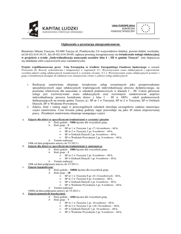 Ogłoszenie o przetargu nieograniczonym Burmistrz Miasta Tuszyna, 95-080 080 Tuszyn ul. Piotrkowska 2/4 województwo łódzkie, powiat łódzki wschodni, tel (0-42) 614-34-51, fax (0-42) 42) 614-30-69, 614 ogłasza przetarg nieograniczony na świadczenie wiadczenie usługi edukacyjnej w projekcie o tytule „Indywidualizacja nauczania uczniów klas I – III w gminie Tuszyn” Tuszyn (nie dopuszcza się składania ofert częściowych oraz wariantowych). wariantowych Projekt współfinansowany przez Unię Uni Europejską ze środków Europejskiego Funduszu Społecznego w ramach Priorytetu IX. Rozwój wykształcenia nia i kompetencji w regionach, 9.1. Wyrównywanie szans edukacyjnych i zapewnienie wysokiej jakości usług edukacyjnych świadczonych w systemie oświaty, o wiaty, 9.1.2. Wyrównywanie szans edukacyjnych uczniów uczn z grup o utrudnionym dostępie pie do edukacji oraz zmniejszenie róŜnic ró w jakości usług edukacyjnych. 1. 2. a. b. c. d. Realizacja zamówienia obejmuje świadczenie wiadczenie usług rozumianych jako przeprowadzanie specjalistycznych zajęć ęć edukacyjnych wspierających wspieraj indywidualizację procesu cesu dydaktycznego, na poziomie właściwym ciwym dla nauczania w szkołach podstawowych w klasach I – III. Celem głównym usługi jest wyrównywanie szans edukacyjnych oraz rozwinięcie rozwini cie zainteresowań zainteresowa poprzez indywidualizację procesu kształcenia dzieci z klas I – III w 100% szkół podstawowych funkcjonujących cych na terenie gminy Tuszyn, tj.: SP nr 1 w Tuszynie, SP nr 2 w Tuszynie, SP w Górkach DuŜych, ych, SP w Wodzinie Prywatnym. Zakres, ilość i rodzaj zajęć w poszczególnych szkołach określają szczegółowe zadania stanowiące stanowi części ci zamówienia. Czas trwania jednej godziny zajęć zaj przewiduje się jako 45 minut nieprzerwanej pracy. Przedmiot zamówienia obejmuje następujące nast części: Zajęcia cia dla dzieci ze specyficznymi trudno trudnościami w czytaniu i pisaniu: Ilość godzin – 540h łącznie dla wszystkich grup, Ilość grup – 9 • SP nr 1 w Tuszynie 3 gr. (7 i 6)-osobowe 6) – 60 h, • SP nr 2 w Tuszynie 2 gr. 8-osobowe 8 – 60 h, • SP w Górkach DuŜych Du 2 gr. 8-osobowe – 60 h, • SP w Wodzinie Prywatnym 2 gr. 8-osobowe 8 – 60 h, Termin realizacji 540h od dnia podpisania umowy do VI 2013 r. Zajęcia cia dla dzieci ze specyficznymi trudno trudnościami w matematyce: Ilość godzin – 180h łącznie dla wszystkich grup, Ilość grup – 3 • SP nr 2 w Tuszynie 2 gr. 8-osobowe 8 – 60 h, • SP w Górkach DuŜych Du 1 gr. 8-osobowa – 60 h, Termin realizacji 180h od dnia podpisania umowy do VI 2013 r. Zajęcia logopedyczne: Ilość godzin – 1080h łącznie dla wszystkich grup, Ilość grup – 18 • SP nr 1 w Tuszynie 8 gr. (4 i 3)-osobowych 3) – 60 h, • SP nr 2 w Tuszynie 4 gr. 4-osobowe 4 – 60 h, • SP w Górkach DuŜych 3 gr. 4-osobowe – 60 h, • SP w Wodzinie Prywatnym 3 gr. 4-osobowe 4 – 60 h, Termin realizacji 1080h od dnia podpisania umowy do VI 2013 r. Zajęcia cia gimnastyki korekcyjnej : Ilość godzin – 420h łącznie dla wszystkich grup, Ilość grup – 7 • SP nr 1 w Tuszynie Tuszyn 2 gr. 10-osobowe – 60 h, • SP nr 2 w Tuszynie 2 gr. (10 i 9)-osobowe 9) – 60 h, • SP w Górkach DuŜych Du 1 gr. 10-osobowa – 60 h, • SP w Wodzinie Prywatnym 2 gr. 9-osobowe 9 – 60 h, Termin realizacji 420h od dnia podpisania umowy do VI 2013 r. e. Zajęcia rozwijające zainteresowania w zakresie nauk matematyczno-przyrodniczych: Ilość godzin – 240h łącznie dla wszystkich grup, Ilość grup – 4 • SP nr 1 w Tuszynie 4 gr. 8-osobowe – 60 h, Termin realizacji 240h od dnia podpisania umowy do VI 2013 r. 3. Wykonawca dostarczy następujące pomoce dydaktyczne przewidziane do zakupu w budŜecie projektu, na rzecz prawidłowej realizacji przedmiotu zamówienia: 1) DoposaŜenie bazy dydaktycznej SP nr 1 w Tuszynie: dostawa pomocy dydaktycznych: Dostawa laptopa (waga do 3 kg, przekątna ekranu min. 15.6”, rozdzielczość ekranu min. 1366 x 768, procesor o właściwościach jak Intel Celeron 220 lub równowaŜny, pamięć RAM min. 2 GB, dysk twardy 250 GB, nagrywarka DVD, złącza USB i AV, system operacyjny Windows 7) – 1 sztuka. 2) DoposaŜenie bazy dydaktycznej SP nr 2 w Tuszynie: dostawa pomocy dydaktycznych: Dostawa laptopa (waga do 3 kg, przekątna ekranu min. 15.6”, rozdzielczość ekranu min. 1366 x 768, procesor o właściwościach jak Intel Celeron 220 lub równowaŜny, pamięć RAM min. 2 GB, dysk twardy 250 GB, nagrywarka DVD, złącza USB i AV, system operacyjny Windows 7) – 1 sztuka. 3) DoposaŜenie bazy dydaktycznej SP w Górkach DuŜych: dostawa pomocy dydaktycznych: a. Dostawa laptopa (waga do 3 kg, przekątna ekranu min. 15.6”, rozdzielczość ekranu min. 1366 x 768, procesor o właściwościach jak Intel Celeron 220 lub równowaŜny, pamięć RAM min. 2 GB, dysk twardy 250 GB, nagrywarka DVD, złącza USB i AV, system operacyjny Windows 7) – 1 sztuka, b. Pomoc dydaktyczna „Kropki matematyczne” gra ruchowa, zawartość: mata z wytrzymałego winylu o wymiarze 122 x 152 cm, 2 duŜe kostki sześcienne z nadrukowanymi liczbami od 1 do 6, 1 duŜa kostka sześcienna z nadrukowanymi znakami "+" i "-", kostki mają bok długości 12,7 cm i wykonane są z estetycznej pianki, 28 kartonowych Ŝetonów, całość umieszczona w trwałym kartonowym pudełku – 1 sztuka, c. Pomoc dydaktyczna „Domino na mnoŜenie” zawartość: 4 komplety domina, kaŜdy komplet zawiera 24 kostki domina (8 x 4 cm), wykonane z grubego tworzywa (0,3 cm), umieszczone w pudełkach – 2 sztuki, d. Pomoc dydaktyczna „Waga metalowa” z płaskimi szalkami do waŜenia róŜnych przedmiotów, wym.: 14 x 17 x 40 cm – 1 sztuka, e. Pomoc dydaktyczna „OdwaŜniki Ŝeliwne i mosięŜne” zawartość: całkowity cięŜar 5 kg – odwaŜniki Ŝeliwne: 1x 2000g, 2x 1000g, 1x 500g, 1x 200g, 2x 100g – odwaŜniki mosięŜne: 1x 50g, 1x 