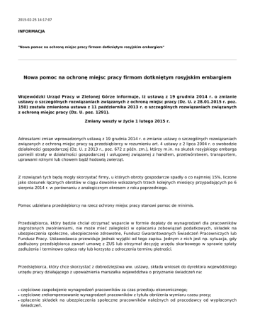 2015-02-25 14:17:07 INFORMACJA "Nowa pomoc na ochronę miejsc pracy firmom dotkniętym rosyjskim embargiem" Nowa pomoc na ochronę miejsc pracy firmom dotkniętym rosyjskim embargiem Wojewódzki Urząd Pracy w Zielonej Górze informuje, iż ustawą z 19 grudnia 2014 r. o zmianie ustawy o szczególnych rozwiązaniach związanych z ochroną miejsc pracy (Dz. U. z 28.01.2015 r. poz. 150) została zmieniona ustawa z 11 października 2013 r. o szczególnych rozwiązaniach związanych z ochroną miejsc pracy (Dz. U. poz. 1291). Zmiany weszły w życie 1 lutego 2015 r. Adresatami zmian wprowadzonych ustawą z 19 grudnia 2014 r. o zmianie ustawy o szczególnych rozwiązaniach związanych z ochroną miejsc pracy są przedsiębiorcy w rozumieniu art. 4 ustawy z 2 lipca 2004 r. o swobodzie działalności gospodarczej (Dz. U. z 2013 r., poz. 672 z późn. zm.), którzy m.in. na skutek rosyjskiego embarga ponieśli straty w działalności gospodarczej i usługowej związanej z handlem, przetwórstwem, transportem, uprawami rolnymi lub chowem bądź hodowlą zwierząt. Z rozwiązań tych będą mogły skorzystać firmy, u których obroty gospodarcze spadły o co najmniej 15%, liczone jako stosunek łącznych obrotów w ciągu dowolnie wskazanych trzech kolejnych miesięcy przypadających po 6 sierpnia 2014 r. w porównaniu z analogicznym okresem z roku poprzedniego. Pomoc udzielana przedsiębiorcy na rzecz ochrony miejsc pracy stanowi pomoc de minimis. Przedsiębiorca, który będzie chciał otrzymać wsparcie w formie dopłaty do wynagrodzeń dla pracowników zagrożonych zwolnieniami, nie może mieć zaległości w opłacaniu zobowiązań podatkowych, składek na ubezpieczenia społeczne, ubezpieczenie zdrowotne, Fundusz Gwarantowanych Świadczeń Pracowniczych lub Fundusz Pracy. Ustawodawca przewiduje jednak wyjątki od tego zapisu. Jednym z nich jest np. sytuacja, gdy zadłużony przedsiębiorca zawarł umowę z ZUS lub otrzymał decyzję urzędu skarbowego w sprawie spłaty zadłużenia i terminowo opłaca raty lub korzysta z odroczenia terminu płatności. Przedsiębiorca, który chce skorzystać z dobrodziejstwa ww. ustawy, składa wniosek do dyrektora wojewódzkiego urzędu pracy działającego z upoważnienia marszałka województwa o przyznanie świadczeń na: ● ● ● częściowe zaspokojenie wynagrodzeń pracowników za czas przestoju ekonomicznego; częściowe zrekompensowanie wynagrodzeń pracowników z tytułu obniżenia wymiaru czasu pracy; opłacenie składek na ubezpieczenia społeczne pracowników należnych od pracodawcy od wypłaconych świadczeń. Przedsiębiorca może również ubiegać się o dofinansowanie kosztów szkolenia pracowników objętych szczególnymi rozwiązaniami na rzecz ochrony miejsc pracy. Wniosek ten winien złożyć do właściwego ze względu na siedzibę firmy starosty (prezydenta miasta na prawach powiatu). Jeżeli przedsiębiorca spełnia warunki ustawowe, marszałek województwa zawiera z nim umowę o wypłatę świadczeń. Przedsiębiorca ten może uzyskać nawet sześciomiesięczne wsparcie mające na celu ochronę miejsc pracy. Za jeden miesiąc maksymalna wysokość bezzwrotnej pomocy przedsiębiorcy na jednego pracownika stanowi sumę kwoty zasiłku dla bezrobotnych (od 1 czerwca 2014 r. jest to kwota 831,10 zł), składek na ubezpieczenia społeczne należnych od świadczeń, co daje na jednego pracownika maksymalną comiesięczną kwotę wsparcia w wysokości 945,04 zł. Przedsiębiorcy przysługują również z FGŚP środki na opłacenie składek na ubezpieczenia społeczne pracowników należnych od pracodawcy na podstawie przepisów o systemie ubezpieczeń społecznych od przyznanych świadczeń. Celem ustawy jest ochrona miejsc pracy, dlatego też przedsiębiorca w czasie pobierania świadczeń na rzecz pracownika nie może mu wypowiedzieć umowy o pracę z przyczyn niedotyczących pracownika. Dotyczy to trzech miesięcy przypadających po okresach pobierania świadczeń. Wszystkie świadczenia wynikające z ustawy, w tym także dotyczące kosztów szkolenia pracowników, będą finansowane ze środków Funduszu Gwarantowanych Świadczeń Pracowniczych. Minister właściwy ds. pracy – dysponent funduszu na pomoc przedsiębiorcom przeznaczył środki finansowe w wysokości 500 mln zł - z tego 250 mln zł w 2015 r. i 250 mln. zł w 2016 r. Rząd ocenia, że dzięki nowym rozwiązaniom zostaną obniżone koszty pracy w przedsiębiorstwach dotkniętych embargiem rosyjskim, a w efekcie poprawi się ich sytuacja finansowa. Firmy będą też mogły utrzymać poziom zatrudnienia, co zapewni im gotowość do powrotu do stuprocentowej działalności w przypadku poprawy koniunktury. Wnioski przedsiębiorców z województwa lubuskiego o przyznanie świadczeń rozpoznaje wydział ds. Funduszu Gwarantowanych Świadczeń Pracowniczych Wojewódzkiego Urzędu Pracy w Zielonej Górze. Tam też można zasięgnąć informacji na temat udzielanej pomocy mającej na celu ochronę miejsc pracy. 65-036 Zielona Góra ul. Wyspiańskiego 15 tel. 68 456 77 08 Informacje o artykule Autor: Zredagował(a): Rafał Ossowski Data powstania: 25.02.2015 14:17 Data ostatniej modyfikacji: Liczba wyświetleń: Wydrukowano z serwisu: Wydrukowano dnia: 867 www.pupslubice.pl 2017-03-08 05:25:51