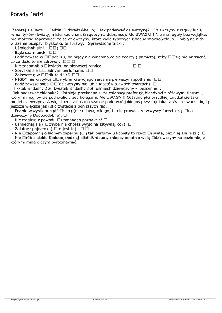 Gimnazjum nr 24 w Toruniu Porady Jadzi Zapytaj się Jadzi , Jadzia Ci doradzi… Jak poderwać dziewczynę? Dziewczyny z reguły lubią romantyków (kwiaty, misie, czułe sms’y na dobranoc). Ale UWAGA!!! Nie ma reguły bez wyjątku. Nie możecie zapomnieć, że są dziewczyny, które wolą typowych „macho”. Robią na nich wrażenie bicepsy, błyskotki, te sprawy. Sprawdzone tricki : - Uśmiechnij się ! : ) - Bądź szarmancki. - Bądź zawsze w pobliżu, bo nigdy nie wiadomo co się zdarzy ( pamiętaj, żeby się nie narzucać, co za dużo to nie zdrowo). - Nie zapomnij o kwiatku na pierwszej randce. - Spryskaj się ładnymi perfumami. - Zainwestuj w tik-taki ! :D - NIGDY nie krytykuj wybranki swojego serca na pierwszym spotkaniu. - Bądź zawsze sobą (dziewczyny nie lubią facetów o dwóch twarzach). Tik-tak – 2 zł, kwiatek – 3 zł, uśmiech dziewczyny - bezcenne. : ) Jak poderwać chłopaka? Istnieje przekonanie, że chłopacy preferują blondynki z różowymi tipsami , którymi mogliby się pochwalić przed kolegami. Ale UWAGA!!! Ostatnio płci brzydkiej znudził się taki model dziewczyny. A więc każda z nas ma szanse poderwać jakiegoś przystojniaka, a Wasze szanse będą jeszcze większe jeśli skorzystacie z poniższych rad. ;) - Przede wszystkim bądź sobą (nie udawaj nikogo, to nie prawda, że wszyscy faceci lecą na dziewczyny Dodopodobne). - Nie tragizuj z powodu złamanego paznokcia! - Uśmiechaj się ( chyba nie chcesz wyjść na sztywną, co?). - Zalotne spojrzenie ( to jest to). - Nie zapomnij o ładnym zapachu (Ojj tak perfumy u kobiety to rzecz święta, bez niej ani rusz!). - Nie rób z siebie „słodkiej idiotki”, chłopcy ostatnio wolą dziewczyny na poziomie, z którymi mają o czym porozmawiać. http://gim24torun.cba.pl Kreator PDF Utworzono 8 March, 2017, 04:25