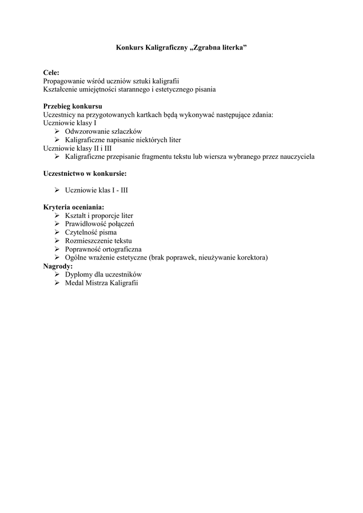 Konkurs Kaligraficzny „Zgrabna literka” Cele: Propagowanie wśród uczniów sztuki kaligrafii Kształcenie umiejętności starannego i estetycznego pisania Przebieg konkursu Uczestnicy na przygotowanych kartkach będą wykonywać następujące zdania: Uczniowie klasy I Odwzorowanie szlaczków Kaligraficzne napisanie niektórych liter Uczniowie klasy II i III Kaligraficzne przepisanie fragmentu tekstu lub wiersza wybranego przez nauczyciela Uczestnictwo w konkursie: Uczniowie klas I - III Kryteria oceniania: Kształt i proporcje liter Prawidłowość połączeń Czytelność pisma Rozmieszczenie tekstu Poprawność ortograficzna Ogólne wrażenie estetyczne (brak poprawek, nieużywanie korektora) Nagrody: Dyplomy dla uczestników Medal Mistrza Kaligrafii