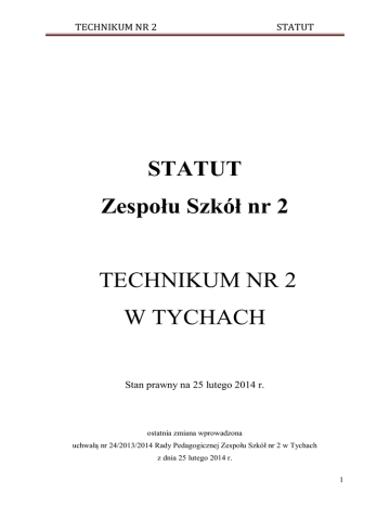 TECHNIKUM NR 2 STATUT STATUT Zespołu Szkół nr 2 TECHNIKUM NR 2 W TYCHACH Stan prawny na 25 lutego 2014 r. ostatnia zmiana wprowadzona uchwałą nr 24/2013/2014 Rady Pedagogicznej Zespołu Szkół nr 2 w Tychach z dnia 25 lutego 2014 r. 1 TECHNIKUM NR 2 STATUT SPIS TREŚCI: Rozdział I Postanowienia ogólne 3 Rozdział II Cele i zadania szkoły 4 Rozdział III Sposoby realizacji zadań szkoły 5 Rozdział IV Organy szkoły 8 Rozdział V Organizacja pracy szkoły 16 Rozdział IV Nauczyciele i inni pracownicy szkoły 21 Rozdział VII Uczniowie szkoły 29 Rozdział VIII Zasady przyjmowania uczniów do szkoły 37 Rozdział IX Postanowienia końcowe 42 2 TECHNIKUM NR 2 STATUT Rozdział I Postanowienia ogólne §1 1. Szkoła nosi nazwę: Technikum nr 2. 2. Siedzibą Technikum jest miasto Tychy, ul. Elfów 9. 3. Organ prowadzący szkołę na wspólny wniosek rady pedagogicznej, rady rodziców i samorządu uczniowskiego nadaje szkole imię; sztandar. 4. Szkoła jest jednostką budżetową III stopnia z kontem dochodów własnych w Zespole Szkół nr 2. §2 1. Organem prowadzącym szkołę jest Powiat Miasto Tychy. 2. Nadzór pedagogiczny nad placówką sprawuje Śląski Kurator Oświaty w Katowicach. §3 1. Technikum nr 2 na podbudowie gimnazjum kształci w zawodach: 1) technik ekonomista, 2) technik handlowiec, 3) technik obsługi turystycznej, 4) technik organizacji reklamy zgodnych z przepisami w sprawie klasyfikacji zawodów szkolnictwa zawodowego. 2. Cykl kształcenia trwa 4 lata. 3. Technikum umożliwia uzyskanie: 1) świadectwa ukończenia szkoły, 2) świadectwa maturalnego, 3) świadectw potwierdzających kwalifikacje we wszystkich wyodrębnionych w zawodach kwalifikacjach, 4) dyplomu potwierdzającego kwalifikacje w zawodzie: technik ekonomista, technik handlowiec, technik obsługi turystycznej, technik organizacji reklamy. 3 TECHNIKUM NR 2 STATUT §4 1. Szkoła organizuje praktyki uczniowskie. 2. Praktyki dla uczniów Technikum nr 2 - zgodnie z planem nauczania – odbywają się w przedsiębiorstwach, zakładach, instytucjach i urzędach na terenie miasta Tychy oraz okolicznych miejscowości. 3. Praktyki odbywają się na podstawie umów spisanych pomiędzy szkołą, a podmiotami o których mowa powyżej. 4. Praktyki odbywają się zgodnie z regulaminem praktyk. Rozdział II Cele i zadania szkoły §5 Szkoła realizuje następuje cele i zadania: 1. Przekazuje uczniom dyscyplinarnie ujmowaną wiedzę naukową, która umożliwi im wyrażanie własnych myśli i przeżyć oraz zdobycie wiedzy i umiejętności niezbędnych do uzyskania świadectwa maturalnego uprawniającego do ubiegania się o przyjęcie do szkoły policealnej lub na wyższe uczelnie. 2. Umożliwia absolwentom dokonanie świadomego wyboru dalszego kierunku kształcenia. 3. Kształtuje środowisko wychowawcze sprzyjające realizowaniu celów i zasad określonych w ustawie, stosownie do warunków szkoły i wieku uczniów. 4. Sprawuje opiekę nad uczniami odpowiednio do ich potrzeb oraz możliwości szkoły. 5. Kształtuje postawy uczniów, przygotowując ich do aktywnego udziału w życiu społecznym. 6. Przygotowuje uczniów do świadomego i dojrzałego odbioru kultury ze szczególnym uwzględnieniem problematyki regionalnej. 4 TECHNIKUM NR 2 STATUT Rozdział III Sposoby realizacji zadań szkoły §6 Zadania wymienione w § 5, szkoła realizuje poprzez: 1. Tworzenie warunków umożliwiających uczniom opanowanie wiedzy przewidzianej programem nauczania oraz zdobycie podstawowych umiejętności samokształcenia, zastosowania wiedzy teoretycznej w praktyce, korzystania z różnych źródeł informacji, zbierania i analizowania danych, rozwiązywania problemów oraz przyjęcia odpowiedzialności za własne kształcenie. 2. Organizowanie zajęć edukacyjnych i nadobowiązkowych zajęć pozalekcyjnych wynikających z potrzeby utrzymania poczucia tożsamości narodowej, etnicznej, językowej i religijnej, cechujących się przestrzeganiem zasad tolerancji i zrozumienia. 3. Udzielanie uczniom pomocy psychologicznej i pedagogicznej, w razie potrzeby – na wniosek ucznia, rodziców lub opiekunów prawnych, wychowawcy, dyrektora szkoły – pomocy materialnej, zależnej od możliwości finansowych szkoły; w tym zakresie szkoła współpracuje z jednostkami i instytucjami specjalistycznymi. 4. Organizowanie szczególnej opieki nad uczniami z zaburzeniami rozwojowymi, uszkodzeniami narządów ruchu, słuchu i wzroku uczęszczającymi do szkoły, mającej na celu umożliwienie im zdobycia zawodu i ukończenia szkoły. 5. Prowadzenie zajęć pozalekcyjnych, umożliwiających zdobywanie wiedzy zgodnie z zainteresowaniami uczniów oraz ich dalszym kształceniem, 6. w zakresie wykraczającym poza program obowiązkowych przedmiotów nauczania, realizując indywidualne programy nauczania. 7. Stwarzanie warunków do działania na jej terenie stowarzyszeń i organizacji, w szczególności organizacji harcerskich, których celem statutowym jest działalność wychowawcza lub rozszerzanie i wzbogacanie form działalności dydaktycznej, wychowawczej i opiekuńczej szkoły. 8. Przygotowanie młodzieży do aktywnego życia w demokratycznym społeczeństwie w Polsce i w Europie, poprzez umiejętność współpracy w zespole oraz uświadamianie obywatelskich praw i obowiązków. 9. Umożliwianie uczniom szczególnie zdolnym realizowania indywidualnych programów nauczania. 5 TECHNIKUM NR 2 10. STATUT Możliwość ukończenia szkoły w skróconym czasie lub przez indywidualną organizację kształcenia. 11. Zagwarantowanie uczestniczenia w zajęciach nadobowiązkowych na zasadach pełnej dobrowolności. 12. Prowadzenie działalności innowacyjnej i eksperymentalnej zgodnie z odrębnymi przepisami. §7 1. W czasie organizowanych przez nauczycieli na terenie szkoły oraz poza jej terenem zajęć obowiązkowych i nadobowiązkowych oraz wycieczek szkoła zapewnia uczniom opiekę pedagogiczną oraz pełne bezpieczeństwo według obowiązujących przep