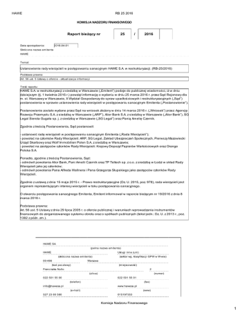 HAWE RB 25 2016 KOMISJA NADZORU FINANSOWEGO Raport bieżący nr 25 / 2016 2016-04-01 Data sporządzenia: Skróc ona nazwa emitenta HAWE Temat Ustanowienie rady wierzycieli w postępowaniu sanacyjnym HAWE S.A. w restrukturyzacji. (RB-25/2016) Podstawa prawna Art. 56 ust. 5 Ustawy o ofercie - aktualizac ja informacji Treść raportu: HAWE S.A. w restrukturyzacji z siedzibą w Warszawie („Emitent”) podaje do publicznej wiadomości, iż w dniu dzisiejszym (tj. 1 kwietnia 2016 r.) powziął informację o wydaniu w dniu 25 marca 2016 r. przez Sąd Rejonowy dla m. st. Warszawy w Warszawie, X Wydział Gospodarczy do spraw upadłościowych i restrukturyzacyjnych („Sąd”) postanowienia w sprawie ustanowienia rady wierzycieli w postępowaniu sanacyjnym Emitenta („Postanowienie”). Postanowienie zostało wydane przez Sąd na wniosek złożony w dniu 14 marca 2016 r. („Wniosek”) przez: Agencję Rozwoju Przemysłu S.A. z siedzibą w Warszawie („ARP”), Alior Bank S.A. z siedzibą w Warszawie („Alior Bank”), SG Legal Sierota Gugała sp. j. z siedzibą w Warszawie („SG Legal”) oraz Panią Amelię Czernik. Zgodnie z treścią Postanowienia, Sąd postanowił: - ustanowić radę wierzycieli w postępowaniu sanacyjnym Emitenta („Rada Wierzycieli”); - powołać na członków Rady Wierzycieli: ARP, SG Legal, Zakład Ubezpieczeń Społecznych, Pierwszy Mazowiecki Urząd Skarbowy oraz Wolf Immobilien Polen S.A. z siedzibą w Warszawie; - powołać na zastępców członków Rady Wierzycieli: Krajowy Depozyt Papierów Wartościowych oraz Orange Polska S.A. Ponadto, zgodnie z treścią Postanowienia, Sąd: - odmówił powołania Alior Bank, Pani Amelii Czernik oraz TP Teltech sp. z o.o. z siedzibą w Łodzi w skład Rady Wierzycieli jako jej członków; - odmówił powołania Pana Alfreda Wallnera i Pana Grzegorza Słupskiego jako zastępców członków Rady Wierzycieli. Zgodnie z ustawą z dnia 15 maja 2015 r. - Prawo restrukturyzacyjne (Dz. U. 2015, poz. 978), rada wierzycieli jest organem reprezentującym interesy wierzycieli w toku postępowania sanacyjnego. O otwarciu postępowania sanacyjnego Emitenta, Emitent informował w raporcie bieżącym nr 19/2016 z dnia 8 marca 2016 r. Podstawa prawna: Art. 56 ust. 5 Ustawy z dnia 29 lipca 2005 r. o ofercie publicznej i warunkach wprowadzania instrumentów finansowych do zorganizowanego systemu obrotu oraz o spółkach publicznych (tekst jedn.: Dz. U. z 2013 r., poz. 1382 z późn. zm.). HAWE SA (pełna nazwa emitenta) Usługi inne (uin) HAWE (skróc ona nazwa emitenta) 00-486 (sektor wg. klasyfikac ji GPW w W-wie) Warszwa (kod poc ztowy) (miejscowość) Franciszka Nullo 2 (ulica) 022 501 55 00 (numer) 022 501 55 01 (telefon) [email protected] (fax) www.hawesa.pl (e-mail) 527 23 80 580 (www) 015197353 Komisja Nadzoru Finansowego 1 HAWE RB 25 2016 (NIP) (REGON) PODPISY OSÓB REPREZENTUJĄCYCH SPÓŁKĘ Data Imię i Nazwisko Stanowisko/Funkc ja 2016-04-01 Wojciech Makuć Zarządc a Podpis Komisja Nadzoru Finansowego 2