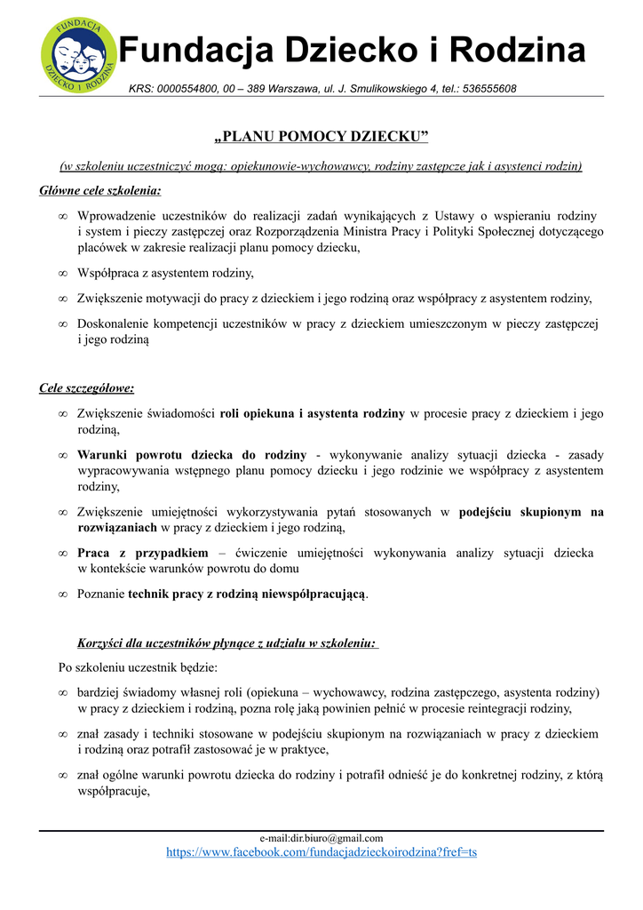 Fundacja Dziecko i Rodzina KRS: 0000554800, 00 – 389 Warszawa, ul. J. Smulikowskiego 4, tel.: 536555608 „PLANU POMOCY DZIECKU” (w szkoleniu uczestniczyć mogą: opiekunowie-wychowawcy, rodziny zastępcze jak i asystenci rodzin) Główne cele szkolenia: • Wprowadzenie uczestników do realizacji zadań wynikających z Ustawy o wspieraniu rodziny i system i pieczy zastępczej oraz Rozporządzenia Ministra Pracy i Polityki Społecznej dotyczącego placówek w zakresie realizacji planu pomocy dziecku, • Współpraca z asystentem rodziny, • Zwiększenie motywacji do pracy z dzieckiem i jego rodziną oraz współpracy z asystentem rodziny, • Doskonalenie kompetencji uczestników w pracy z dzieckiem umieszczonym w pieczy zastępczej i jego rodziną Cele szczegółowe: • Zwiększenie świadomości roli opiekuna i asystenta rodziny w procesie pracy z dzieckiem i jego rodziną, • Warunki powrotu dziecka do rodziny - wykonywanie analizy sytuacji dziecka - zasady wypracowywania wstępnego planu pomocy dziecku i jego rodzinie we współpracy z asystentem rodziny, • Zwiększenie umiejętności wykorzystywania pytań stosowanych w podejściu skupionym na rozwiązaniach w pracy z dzieckiem i jego rodziną, • Praca z przypadkiem – ćwiczenie umiejętności wykonywania analizy sytuacji dziecka w kontekście warunków powrotu do domu • Poznanie technik pracy z rodziną niewspółpracującą. Korzyści dla uczestników płynące z udziału w szkoleniu: Po szkoleniu uczestnik będzie: • bardziej świadomy własnej roli (opiekuna – wychowawcy, rodzina zastępczego, asystenta rodziny) w pracy z dzieckiem i rodziną, pozna rolę jaką powinien pełnić w procesie reintegracji rodziny, • znał zasady i techniki stosowane w podejściu skupionym na rozwiązaniach w pracy z dzieckiem i rodziną oraz potrafił zastosować je w praktyce, • znał ogólne warunki powrotu dziecka do rodziny i potrafił odnieść je do konkretnej rodziny, z którą współpracuje, e-mail:[email protected] https://www.facebook.com/fundacjadzieckoirodzina?fref=ts Fundacja Dziecko i Rodzina KRS: 0000554800, 00 – 389 Warszawa, ul. J. Smulikowskiego 4, tel.: 536555608 • znał ogólne zasady przeprowadzenia analizy sytuacji dziecka i jego rodziny oraz potrafił zastosować je w praktyce, • potrafił wykorzystać analizę sytuacji dziecka i rodziny w przygotowaniu adekwatnego do sytuacji planu pomocy • znał techniki pracy z rodziną niewspółpracującą i potrafił zastosować je w praktyce, RAMOWY PLAN SZKOLENIA DZIEŃ I 1. 2. 3. 4. Powitanie i przedstawienie uczestników, przedstawienie celów szkolenia, ustalenie zasad współpracy Przerwa kawowa Podejście skupione na rozwiązaniach Podejście skupione na rozwiązaniach – ćwiczenia praktyczne odnoszące się do zwiększenia umiejętności angażowania rodziny w sprawy dziecka, nawiązania pozytywnych relacji, zachęcenia do współpracy, zwiększenia entuzjazmu i motywacji do tworzenia i realizacji planu pomocy dziecku i jego rodzinie. DZIEŃ II 1. Warunki powrotu dziecka do domu – narzędzia pracy opiekuna – wychowawcy wynikające z Ustawy i Rozporządzenia Ministra – wprowadzenie 2. Analiza przyczyn kryzysu w rodzinie dziecka i plan pomocy dziecku – wskazówki metodyczne, określenie celu długo i krótko terminowego planu pracy – współpraca z asystentem rodziny 3. CDN – ćwiczenia praktyczne – wykonywanie analizy sytuacji dziecka i planu pomocy dziecku i jego rodzinie, przygotowanie do spotkania z rodziną 4. Ćwiczenia praktyczne - zastosowanie podejścia skupionego na rozwiązaniach w pracy z dzieckiem i jego rodziną 5. Podsumowanie dnia DZIEŃ III 1. Moja rola w realizacji planu pomocy dziecku – wypracowanie i określenie głównych zadań wobec dziecka i jego rodziny, 2. Praca z rodziną niewspółpracującą – narzędzia pracy. 3. Ćwiczenia praktyczne 4. Podsumowanie dnia, ankieta ewaluacyjna Metody pracy wykorzystane w szkoleniu: • mini wykład • burza mózgów e-mail:[email protected] https://www.facebook.com/fundacjadzieckoirodzina?fref=ts Fundacja Dziecko i Rodzina KRS: 0000554800, 00 – 389 Warszawa, ul. J. Smulikowskiego 4, tel.: 536555608 • studium przypadku • odgrywanie ról • ćwiczenie indywidualne i grupowe Informacje na temat ceny szkolenia udzielane będą indywidualnie. Zapraszamy do kontaktu mailowego lub telefonicznego: e-mail: [email protected] tel. 536 555 608 lub 783 477 763 e-mail:[email protected] https://www.facebook.com/fundacjadzieckoirodzina?fref=ts