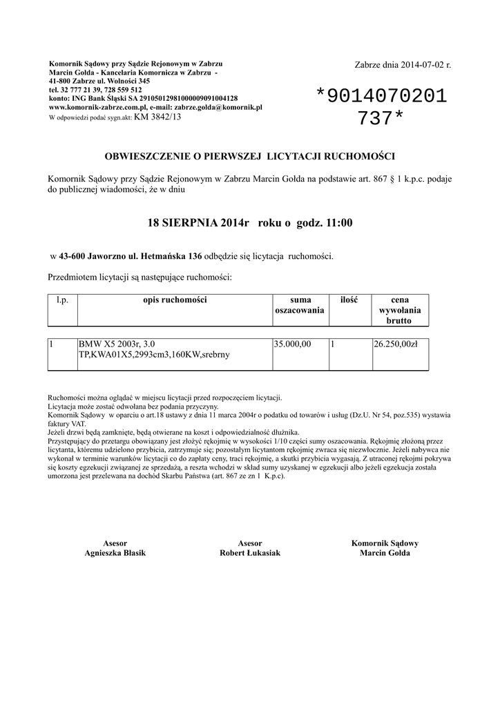 Komornik Sądowy przy Sądzie Rejonowym w Zabrzu Marcin Gołda - Kancelaria Komornicza w Zabrzu 41-800 Zabrze ul. Wolności 345 tel. 32 777 21 39, 728 559 512 konto: ING Bank Śląski SA 29105012981000009091004128 www.komornik-zabrze.com.pl, e-mail: [email protected] W odpowiedzi podać sygn.akt: KM Zabrze dnia 2014-07-02 r. *9014070201 737* 3842/13 OBWIESZCZENIE O PIERWSZEJ LICYTACJI RUCHOMOŚCI Komornik Sądowy przy Sądzie Rejonowym w Zabrzu Marcin Gołda na podstawie art. 867 § 1 k.p.c. podaje do publicznej wiadomości, że w dniu 18 SIERPNIA 2014r roku o godz. 11:00 w 43-600 Jaworzno ul. Hetmańska 136 odbędzie się licytacja ruchomości. Przedmiotem licytacji są następujące ruchomości: l.p. 1 opis ruchomości suma oszacowania BMW X5 2003r, 3.0 TP,KWA01X5,2993cm3,160KW,srebrny 35.000,00 ilość 1 cena wywołania brutto 26.250,00zł Ruchomości można oglądać w miejscu licytacji przed rozpoczęciem licytacji. Licytacja może zostać odwołana bez podania przyczyny. Komornik Sądowy w oparciu o art.18 ustawy z dnia 11 marca 2004r o podatku od towarów i usług (Dz.U. Nr 54, poz.535) wystawia faktury VAT. Jeżeli drzwi będą zamknięte, będą otwierane na koszt i odpowiedzialność dłużnika. Przystępujący do przetargu obowiązany jest złożyć rękojmię w wysokości 1/10 części sumy oszacowania. Rękojmię złożoną przez licytanta, któremu udzielono przybicia, zatrzymuje się; pozostałym licytantom rękojmię zwraca się niezwłocznie. Jeżeli nabywca nie wykonał w terminie warunków licytacji co do zapłaty ceny, traci rękojmię, a skutki przybicia wygasają. Z utraconej rękojmi pokrywa się koszty egzekucji związanej ze sprzedażą, a reszta wchodzi w skład sumy uzyskanej w egzekucji albo jeżeli egzekucja została umorzona jest przelewana na dochód Skarbu Państwa (art. 867 ze zn 1 K.p.c). Asesor Agnieszka Błasik Asesor Robert Łukasiak Komornik Sądowy Marcin Gołda