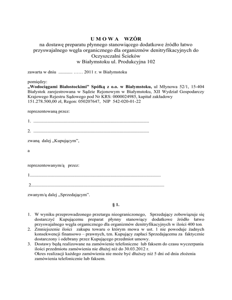 U M O W A WZÓR na dostawę preparatu płynnego stanowiącego dodatkowe źródło łatwo przyswajalnego węgla organicznego dla organizmów denitryfikacyjnych do Oczyszczalni Ścieków w Białymstoku ul. Produkcyjna 102 zawarta w dniu ............ …… 2011 r. w Białymstoku pomiędzy: „Wodociągami Białostockimi” Spółką z o.o. w Białymstoku, ul Młynowa 52/1, 15-404 Białystok zarejestrowana w Sądzie Rejonowym w Białymstoku, XII Wydział Gospodarczy Krajowego Rejestru Sądowego pod Nr KRS: 0000024985, kapitał zakładowy 151.278.500,00 zł, Regon: 050207647, NIP 542-020-01-22 reprezentowaną przez: 1. ................................................................................................... 2. ................................................................................................... zwaną dalej „Kupującym”, a reprezentowanym/ą przez: 1................................................................................................................ 2.................................................................................................................. zwanym/ą dalej „Sprzedającym”. § 1. 1. W wyniku przeprowadzonego przetargu nieograniczonego, Sprzedający zobowiązuje się dostarczyć Kupującemu preparat płynny stanowiący dodatkowe źródło łatwo przyswajalnego węgla organicznego dla organizmów denitryfikacyjnych w ilości 400 ton. 2. Zmniejszenie ilości zakupu towaru o którym mowa w ust. 1 nie powoduje żadnych konsekwencji finansowo – prawnych, tzn. Kupujący zapłaci Sprzedającemu za faktycznie dostarczony i odebrany przez Kupującego przedmiot umowy. 3. Dostawy będą realizowane na zamówienie telefoniczne lub faksem do czasu wyczerpania ilości przedmiotu zamówienia nie dłużej niż do 30.03.2012 r. Okres realizacji każdego zamówienia nie może być dłuższy niż 5 dni od dnia złożenia zamówienia telefonicznie lub faksem. 4. 5. Miejscem dostawy towaru jest Oczyszczalna Ścieków w Białymstoku ul. Produkcyjna 102. Koszty transportu i ubezpieczenia towaru ponosi Sprzedający. § 2. 1. Cena jednostkowa netto zgodnie ze złożoną ofertą. wynosi:................................. 2. Kupujący zobowiązuje się zapłacić Sprzedającemu za każdą partię towaru loco Oczyszczalnia Ścieków w Białymstoku kwotę obliczoną wg cen jednostkowych w złotówkach. 3. Podstawą wystawienia faktury będzie potwierdzony odbiór towaru przez osobę odpowiedzialną ze strony Kupującego. 4. Kupujący zapłaci wynagrodzenie, o którym mowa w ust. 2 przelewem, w ciągu 21 dni od dnia otrzymania faktury wystawionej przez Sprzedającego na wskazany przez Niego rachunek bankowy. 5. Za dzień zapłaty uznaje się dzień obciążenia rachunku bankowego Kupującego. § 3. 1. Sprzedający gwarantuje odpowiednią i stabilną jakość preparatu odpowiadającą jakości przedstawionej w ofercie przez cały okres umowy z zastrzeżeniem ust. 5 2. Sprzedający dostarczy kartę charakterystyki oraz świadectwo jakości dla każdej partii dostarczanego preparatu. 3. W przypadku reklamacji dostarczonego towaru, Kupujący poinformuje o wadzie towaru w ciągu 14 dni od daty stwierdzenia podstawy reklamacji podając numer serii towaru. 4. Sprzedający zobowiązuje się w terminie 14 dni od powiadomienia przez Kupującego wymienić wadliwy towar na własny koszt. 5. Za zużytą część wadliwego towaru z oznaczonej w reklamacji partii Kupującemu zostanie wystawiona przez Sprzedającego faktura korygująca na określoną w reklamacji ilość preparatu. 6. Sprzedający zobowiązuje się odebrać na własny koszt opakowania po zużytym preparacie. § 4. Osobą odpowiedzialną za prawidłową realizację przedmiotu umowy ze strony Sprzedającego jest ............................................................................................................................................. § 5. 1. Sprzedający zapłaci Kupującemu karę umowną w wysokości 0,2 % wynagrodzenia umownego brutto za nie dostarczony towar, zamówiony zgodnie § 1 ust. 3 za każdy dzień zwłoki w dostawie. 2. W przypadku rozwiązania umowy z przyczyn leżących po stronie Sprzedającego, zapłaci on Kupującemu karę umowną w wysokości 10% wartości wynagrodzenia umownego brutto przedmiotu umowy o którym mowa w § 1 ust. 1. 3. Kupujący zapłaci Sprzedającemu karę umowną w wysokości 0,2 % wynagrodzenia umownego brutto za przedmiot dostarczony zgodnie z § 1 ust. 3, za każdy dzień zwłoki w odbiorze dostarczonego zgodnie z umową towaru. 4. Kupujący zastrzega sobie prawo dochodzenia odszkodowania przewyższającego wysokość kar umownych. 5. Strony mogą odstąpić od naliczania kar umownych na zasadach określonych odrębnym porozumieniem. 6. W przypadku obowiązku uiszczenia przez Sprzedającego kary umownej jej wysokość może być potrącona przez Kupującego z wynagrodzenia należnego Sprzedającemu. § 6. 1. Kupujący posiada Zintegrowany System Zarządzania wdrożony wg norm: PN – EN ISO 9001 : 2009, PN – EN ISO 14001 : 2005 oraz PN – N 18001 : 2004. 2. Strony umowy zobowiązują się do stosowania wymagań wymienionych w ust. 1 norm w zakresie wzajemnej współpracy wynikającej z niniejszej umowy. 3. Kupujący zastrzega sobie prawo przeprowadzania auditów u Sprzedającego w zakresie jakości preparatu. § 7. Umowa obowiązuje od dnia podpisania do czasu wyczerpania przedmiotu umowy o którym mowa w § 1 nie dłużej jednak niż do dnia 30.03.2012 r. § 8. Niniejsza umowa może być rozwiązana przez każdą ze stron za uprzednim 1– miesięcznym wypowiedzeniem. § 9. Sądem właściwym do rozstrzygania ewentualnych sporów, będzie Sąd miejscowo właściwy dla siedziby Kupującego. § 10. W sprawach nieuregulowanych niniejszą umową mają zastosowanie przepisy kodeksu cywilnego. § 11. Wszelkie zmiany do umowy wymagają formy pisemnej pod rygorem nieważności. § 12. Umowę sporządzono w 2 jednobrzmiących egzemplarzach po jednym dla k