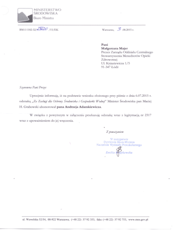 ML IS ERSTWO ŚR OOWl K Biuro Ministra BM-I-1182-32/;~ /15/EK Warszawa, 3 .08.2015 r. Pani Małgorzata Majer Prezes Zarządu Oddziału Centralnego towarzyszenia Menedżerów Opieki Zdrowotnej Ul. Kniaziewicza 1/5 91-347 Łódź S zanoJ1Jt1aPani Prezes Uprzejmie informuję, iż na podstawie wniosku złożonego przy piśmie z dnia 6.07.2015 r. odznaką "Za Zasługi dla Ochrony Środ01viska i Gospodarki Wodnej' Minister Środowiska H. Grabowski uhonorował pana Andrzeja Adamkiewicza. W związku z powyższym wraz z upoważnieniem pan Maciej w załączeniu przekazuję odznakę wraz z legitymacją nr 2317 do jej wręczenia. Z pOlvażaniem Dyr 'a zelnl Eni/ ul. Wawelska 52/54, 00-922 Warszawa; (+4822) 5792353, faks: (+4822) t 5792753, s a www.mos.gov.pl
