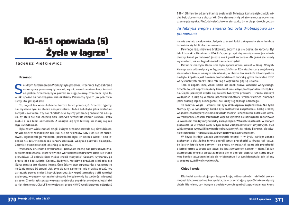 100–150 metrów od zony i tam je zostawiali. Te leżące i zmarznięte zwłoki widać było doskonale z obozu. Wkrótce zlatywały się od strony morza ogromne, czarne ptaszyska. Pięć, dziesięć ptaków starczyło, by w ciągu dwóch godzin Ю-651 opowiada (5) Życie w łagrze1 Ta d e u s z P i e t k i e w i c z Przemoc S olidnym fundamentem Workuty była przemoc. Przemocą było zabranie mi ojczyzny, przemocą był areszt, wyrok, nawet zamiana kary śmierci na piekło. Przemocą była podróż za krąg polarny. Przemocą było to, w jaki sposób za tym kręgiem mieszkaliśmy. Przemocą było to, jak pracowaliśmy, i to, jak spaliśmy. To, co jest tak wszechobecne, bardzo łatwo przeoczyć. Przecież żyjemy, nie myśląc o tym, że otacza nas powietrze. I to też był chyba jakiś szatański zamysł – nie wiem, czy nie chodziło o to, byśmy przemocą całkowicie nasiąkli, by stała się ona częścią nas, „których wyhuśtała chmur kołyska”, żeby zrobić z nas ludzi sowieckich. A nasiąka się tym łatwiej, im mniej się ma tego świadomość. Było zatem wiele metod, dzięki którym przemoc stawała się niewidzialna. NKWD-ziści w zasadzie nie bili. Bali się bić więźniów. Gdy ktoś się im sprzeciwiał, wykańczali go metodami pośrednimi. Było ich bardzo wiele – a to jedzenia nie dali, w zimnej celi karceru zostawili, wody nie pozwolili się napić… Człowiek stopniowo tajał jak śnieg w czerwcu. Wystarczy uruchomić wyobraźnię i pomyśleć trochę nad potwornym znaczeniem tego zdania, które w świetle workuciańskich przeżyć zdaje się trupio prawdziwe: „Z człowiekiem można zrobić wszystko”. Czasami wystarczy po prostu izba bez światła. Karcer… Budynek, metalowe drzwi, za nimi cela bez łóżka, zresztą bez niczego innego. Gołe ściany, brak ogrzewania, a na zewnątrz mróz do minus 50 stopni! Jak było się tam samemu i nie miał kto grzać, noc oznaczała pewną śmierć. I szybki pogrzeb. Jak kogoś tam szlag trafił, rano był zabierany, wrzucany na taczkę lub sanie i wieziony nią ku wolności wiecznej za zonę. Ziemia była przez większą część roku zupełnie zmrożona, ludzi nikt w niej nie chował. Ci z LFT konwojowani przez NKWD wozili trupy na odległość 370 Pressje 2011, teka 26/27 Ta fabryka węgla i śmierci też była drobiazgowo zaplanowana nic nie zostało z człowieka. Jedynie czasami ludzi zakopywało się w tundrze i stawiało się tabliczkę z numerem. Pewnego razu niewiele brakowało, żebym i ja się dostał do karceru. Był taki Lizowski – Ukrainiec z UPA, który przyczepił się, że mój numer jest niewidoczny, kazał go malować jeszcze raz i groził karcerem. Ale jakoś się wtedy wywinąłem, los mi tego doświadczenia oszczędził. Przemoc nie była ślepa i nie była spontaniczna, nawet w Rosji. Wszystkie represje odbywały się w łagpodrozdzielieniu. Również karcery znajdowały się właśnie tam, w naszym mieszkaniu, w obozie. Na szachcie ich oczywiście nie było, kopalnia jest bowiem proizwodstwem, fabryką, gdzie nie wolno robić wszystkich tych rzeczy, jakie robi się z więźniami, gdy są u siebie. Tam w kopalni inni, wolni ludzie nie mieli prawa wiedzieć wszystkiego. Szachta to jest naprawdę duży kombinat i musi być profesjonalnie zarządzana. Ciężki przemysł rządzi się swoimi twardymi prawami – trzeba obliczyć wydajność, z jaką są w stanie pracować robotnicy, trzeba wiedzieć, dlaczego jedni pracują lepiej, a inni gorzej, co i kiedy się zepsuje i dlaczego. Ta fabryka węgla i śmierci też była drobiazgowo zaplanowana. Nie tylko Niemcy byli w tym dobrzy. Trzeba było zaplanować zaopatrzenie, liczbę i rodzaj wagonów, dostawy części zamiennych do maszyn i uzupełnienia ludzkie na krwawy front pracy. Czasami trzeba było więc na tę ziemię nieludzką ludzi importować „z wolności”, między innymi kadry zarządzające. W takich kopalniach, w których pracowało po 3 tysiące ludzi, w tym ponad 200 pracowników umysłowych, było wielu wysoko wykwalifikowanych wolnonajomnych, do roboty biurowej, ale również techników − rapalszcików, którzy podrywali skały amonitem. W fizyce istnieje zasada zachowania energii – w życiu istnieje zasada zachowania zła. Jedna forma energii łatwo przechodzi w drugą, tak łatwo, bo jest w istocie tym samym – po prostu energią, tak samo zło przechodzi z jednej formy w drugą tak łatwo, bo jest zawsze tym samym – złem. Tak jak skamieniała energia węgla zamienia się w energię cieplną, tak samo przemoc bardzo łatwo zamieniała się w kłamstwo. I w tym kłamstwie, tak jak my w przemocy, żyli wolnonajomnyje. Chleb i woda Dla ludzi zamieszkujących bogate kraje, różnorodność i obfitość pokarmu jest tak powszechna i oczywista, że w przerażający sposób lekceważy się chleb. Nie wiem, czy jednym z podstawowych symboli zapowiadanego kresu Ю-651 opowiada 371 naszej cywilizacji nie jest właśnie to, co współczesny człowiek robi z tym jednym z najpiękniejszych darów Boga dla ludzi. Obecnie modląc się „Ojcze nasz”, traktujemy zdanie „chleba naszego powszedniego daj nam dzisiaj” jedynie symbolicznie. Tymczasem przez wieki to zdanie miało znaczenie jak najbardziej dosłowne. W tamtej piekielnej rzeczywistości chleb, prócz tego, że trzymał nas przy życiu, był również stosowany do niszczenia człowieka, do wyciskania ostatniego wysiłku, do wykańczania pracą. Chleb zaprzęgnięto bowiem do złowrogiego systemu kotłów. System ten był diabelsko precyzyjny, jego istotą było dawanie jedzenia w zależności od tego, ile procent normy udało się osiągnąć. Słabsi, ci, którzy nie byli w stanie wypracować zakładanych norm, dostawali mniej jedzenia, niż wynosiły potrzeby ich organizmu. Słabli coraz bardziej i jeszcze mniej wypracowywali, aż w końcu nie mieli siły już na nic. Kotłów było pięć. Pierwszy był najgorszy, składał się jedynie z 550 gramów chleba i talerz