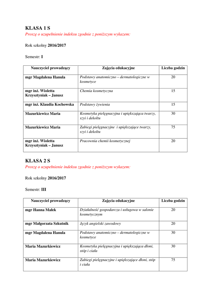 KLASA 1 S Proszę o uzupełnienie indeksu zgodnie z poniższym wykazem: Rok szkolny 2016/2017 Semestr: I Nauczyciel prowadzący Zajęcia edukacyjne Liczba godzin mgr Magdalena Hanula Podstawy anatomiczno – dermatologiczne w kosmetyce 20 mgr inż. Wioletta Krzysztyniak – Janusz Chemia kosmetyczna 15 mgr inż. Klaudia Kochowska Podstawy żywienia 15 Mazurkiewicz Maria Kosmetyka pielęgnacyjna i upiększająca twarzy, szyi i dekoltu 30 Mazurkiewicz Maria Zabiegi pielęgnacyjne i upiększające twarzy, szyi i dekoltu 75 mgr inż. Wioletta Krzysztyniak – Janusz Pracownia chemii kosmetycznej 20 KLASA 2 S Proszę o uzupełnienie indeksu zgodnie z poniższym wykazem: Rok szkolny 2016/2017 Semestr: III Nauczyciel prowadzący Zajęcia edukacyjne Liczba godzin mgr Hanna Małek Działalność gospodarcza i usługowa w salonie kosmetycznym 20 mgr Małgorzata Szkutnik Język angielski zawodowy 20 mgr Magdalena Hanula Podstawy anatomiczno – dermatologiczne w kosmetyce 30 Maria Mazurkiewicz Kosmetyka pielęgnacyjna i upiększająca dłoni, stóp i ciała 30 Maria Mazurkiewicz Zabiegi pielęgnacyjne i upiększające dłoni, stóp i ciała 75 KLASA 1 BHP Proszę o uzupełnienie indeksu zgodnie z poniższym wykazem: Rok szkolny 2016/2017 Semestr: I Nauczyciel prowadzący Zajęcia edukacyjne Liczba godzin mgr Hanna Małek Działalność gospodarcza 15 mgr Zbyradowski Tomasz Techniczne bezpieczeństwo pracy 20 mgr Baran Dorota Ergonomia w procesie pracy 25 mgr Baran Dorota Zagrożenia w środowisku pracy 30 mgr Głaz Beata Język obcy zawodowy 20 mgr Tomasz Zbyradowski Ocena ryzyka zawodowego 35 mgr Tomasz Zbyradowski Zarządzanie systemami bezpieczeństwa i higieny pracy 30 KLASA 2 BHP Proszę o uzupełnienie indeksu zgodnie z poniższym wykazem: Rok szkolny 2016/2017 Semestr III Nauczyciel prowadzący Zajęcia edukacyjne Liczba godzin mgr Marta Pająk – Traka Podstawy prawa pracy 20 mgr Tomasz Zbyradowski Techniczne bezpieczeństwo pracy 20 mgr Dorota Baran Zagrożenia w środowisku pracy 20 mgr Dorota Baran Ocena ryzyka zawodowego 35 mgr Dorota Baran Ustalenie przyczyn i okoliczności wypadków przy pracy i chorób zawodowych 35 mgr Tomasz Zbyradowski Zarządzanie systemami bezpieczeństwa i higieny pracy 45 KLASA 1 TR Proszę o uzupełnienie indeksu zgodnie z poniższym wykazem: Rok szkolny 2016/2017 Semestr: I Nauczyciel prowadzący Zajęcia edukacyjne Liczba godzin Mgr Aneta Jaworska Działalność gospodarcza 22 Mgr Marzena Garbacz Rachunkowość 73 Mgr Aneta Jaworska Pracownia rachunkowości 75 KLASA 2 TR Proszę o uzupełnienie indeksu zgodnie z poniższym wykazem: Rok szklony 2016/2017 Semestr: III Nauczyciel prowadzący Zajęcia edukacyjne Liczba godzin Mgr Beata Głaz Język angielski zawodowy 11 Mgr Bożena Skrzat Wynagrodzenia i podatki 65 Mgr Hanna Małek Pracownia pracy biurowej 20 Mgr Aneta Jaworska Pracownia wynagrodzeń i danin publicznych 74 KLASA 1 FL Proszę o uzupełnienie indeksu zgodnie z poniższym wykazem: Rok szkolny 2016/2017 Semestr: I Nauczyciel prowadzący Zajęcia edukacyjne Liczba godzin Mgr Lucyna Lisowska Materiał roślinny i surowce dekoracyjne 50 Mgr Lucyna Lisowska Podstawy florystyki 30 Mgr Hanna Małek Podstawy działalności gospodarczej 20 Mgr Lucyna Lisowska Pracownia florystyczna 80 KLASA 1LZ Proszę o uzupełnienie indeksu zgodnie z poniższym wykazem: Rok szkolny 2016/2017 Semestr: I Nauczyciel prowadzący Zajęcia edukacyjne Liczba godzin mgr Aneta Sikora Język polski 30 mgr Beata Głaz / mgr Marta Pająk – Traka Język angielski 20 mgr Aleksandra Ruta Historia 15 mgr Aneta Jaworska Podstawy przedsiębiorczości 20 mgr Barbara Wieszczek – Augustyńska Geografia 20 mgr Dorota Baran Chemia 15 mgr Tomasz Zbyradowski Matematyka 32 KLASA 2LZ1 Proszę o uzupełnienie indeksu zgodnie z poniższym wykazem: Rok szkolny 2016/2017 Semestr: III Nauczyciel Zajęcia edukacyjne Liczba godzin mgr Aneta Sikora Język polski 40 mgr Beata Głaz / Marta Pająk – Traka Język angielski 15 mgr Małgorzata Stadnik Matematyka 40 mgr Magdalena Hanula Biologia 37 mgr Aleksandra Ruta Historia i społeczeństwo 20 KLASA 2LZ2 Proszę o uzupełnienie indeksu zgodnie z poniższym wykazem: Rok szkolny 2016/2017 Semestr: III Nauczyciel Zajęcia edukacyjne Liczba godzin Mgr Agnieszka Szewc Język polski 58 Mgr Beata Głaz/mgr Małgorzata Szkutnik Język angielski 20 Mgr Małgorzata Stadnik Matematyka 26 Mgr Dorota Pikuła Geografia 30 Mgr Aleksandra Ruta Historia i społeczeństwo 20 KLASA 3LZ1 Proszę o uzupełnienie indeksu zgodnie z poniższym wykazem: Rok szkolny 2016/2017 Semestr: V Nauczyciel prowadzący Zajęcia edukacyjne Rok szkolny Mgr Beata Głaz/ mgr Marta Pająk – Traka Język angielski 20 Mgr Małgorzata Stadnik Matematyka 20 Mgr Agnieszka Szewc Język polski 66 Mgr Magdalena Hanula Biologia 47 KLASA 3LZ2 Proszę o uzupełnienie indeksu zgodnie z poniższym wykazem: Rok szkolny 2016/2017 Semestr: V Nauczyciel prowadzący Zajęcia edukacyjne Rok szkolny Mgr Beata Głaz Język angielski 20 Mgr Małgorzata Stadnik Matematyka 55 Mgr Agnieszka Szewc Język polski 30 Mgr Aleksandra Ruta Historia 47