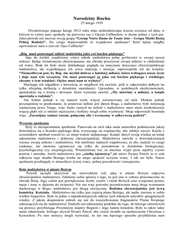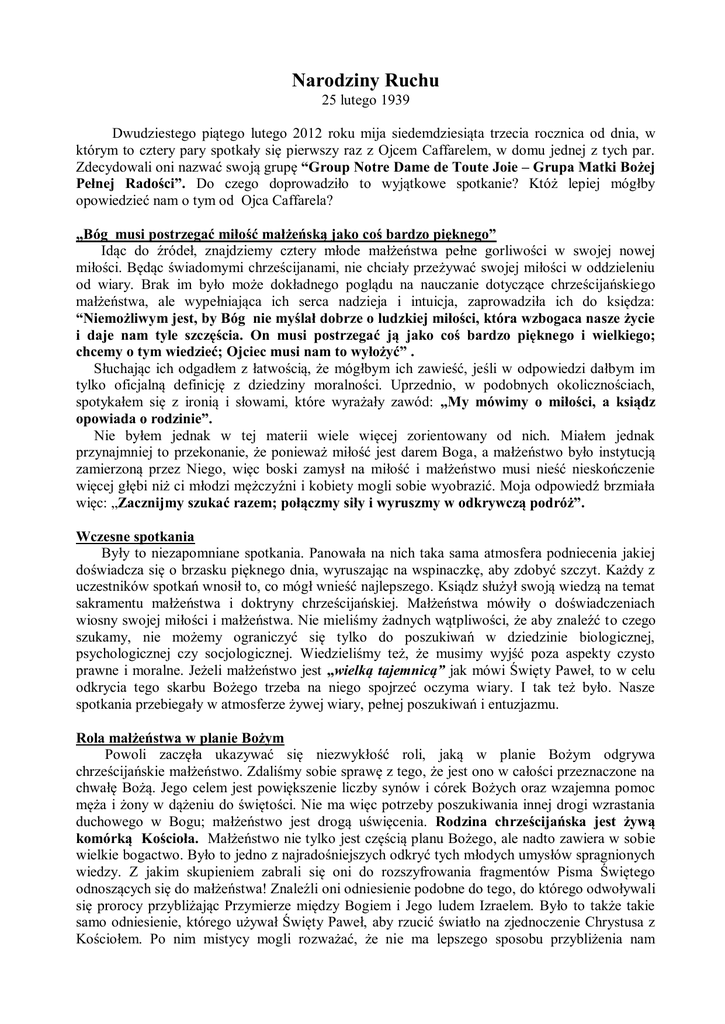 Narodziny Ruchu 25 lutego 1939 Dwudziestego piątego lutego 2012 roku mija siedemdziesiąta trzecia rocznica od dnia, w którym to cztery pary spotkały się pierwszy raz z Ojcem Caffarelem, w domu jednej z tych par. Zdecydowali oni nazwać swoją grupę “Group Notre Dame de Toute Joie – Grupa Matki Bożej Pełnej Radości”. Do czego doprowadziło to wyjątkowe spotkanie? Któż lepiej mógłby opowiedzieć nam o tym od Ojca Caffarela? „Bóg musi postrzegać miłość małżeńską jako coś bardzo pięknego” Idąc do źródeł, znajdziemy cztery młode małżeństwa pełne gorliwości w swojej nowej miłości. Będąc świadomymi chrześcijanami, nie chciały przeżywać swojej miłości w oddzieleniu od wiary. Brak im było może dokładnego poglądu na nauczanie dotyczące chrześcijańskiego małżeństwa, ale wypełniająca ich serca nadzieja i intuicja, zaprowadziła ich do księdza: “Niemożliwym jest, by Bóg nie myślał dobrze o ludzkiej miłości, która wzbogaca nasze życie i daje nam tyle szczęścia. On musi postrzegać ją jako coś bardzo pięknego i wielkiego; chcemy o tym wiedzieć; Ojciec musi nam to wyłożyć” . Słuchając ich odgadłem z łatwością, że mógłbym ich zawieść, jeśli w odpowiedzi dałbym im tylko oficjalną definicję z dziedziny moralności. Uprzednio, w podobnych okolicznościach, spotykałem się z ironią i słowami, które wyrażały zawód: „My mówimy o miłości, a ksiądz opowiada o rodzinie”. Nie byłem jednak w tej materii wiele więcej zorientowany od nich. Miałem jednak przynajmniej to przekonanie, że ponieważ miłość jest darem Boga, a małżeństwo było instytucją zamierzoną przez Niego, więc boski zamysł na miłość i małżeństwo musi nieść nieskończenie więcej głębi niż ci młodzi mężczyźni i kobiety mogli sobie wyobrazić. Moja odpowiedź brzmiała więc: „Zacznijmy szukać razem; połączmy siły i wyruszmy w odkrywczą podróż”. Wczesne spotkania Były to niezapomniane spotkania. Panowała na nich taka sama atmosfera podniecenia jakiej doświadcza się o brzasku pięknego dnia, wyruszając na wspinaczkę, aby zdobyć szczyt. Każdy z uczestników spotkań wnosił to, co mógł wnieść najlepszego. Ksiądz służył swoją wiedzą na temat sakramentu małżeństwa i doktryny chrześcijańskiej. Małżeństwa mówiły o doświadczeniach wiosny swojej miłości i małżeństwa. Nie mieliśmy żadnych wątpliwości, że aby znaleźć to czego szukamy, nie możemy ograniczyć się tylko do poszukiwań w dziedzinie biologicznej, psychologicznej czy socjologicznej. Wiedzieliśmy też, że musimy wyjść poza aspekty czysto prawne i moralne. Jeżeli małżeństwo jest „wielką tajemnicą” jak mówi Święty Paweł, to w celu odkrycia tego skarbu Bożego trzeba na niego spojrzeć oczyma wiary. I tak też było. Nasze spotkania przebiegały w atmosferze żywej wiary, pełnej poszukiwań i entuzjazmu. Rola małżeństwa w planie Bożym Powoli zaczęła ukazywać się niezwykłość roli, jaką w planie Bożym odgrywa chrześcijańskie małżeństwo. Zdaliśmy sobie sprawę z tego, że jest ono w całości przeznaczone na chwałę Bożą. Jego celem jest powiększenie liczby synów i córek Bożych oraz wzajemna pomoc męża i żony w dążeniu do świętości. Nie ma więc potrzeby poszukiwania innej drogi wzrastania duchowego w Bogu; małżeństwo jest drogą uświęcenia. Rodzina chrześcijańska jest żywą komórką Kościoła. Małżeństwo nie tylko jest częścią planu Bożego, ale nadto zawiera w sobie wielkie bogactwo. Było to jedno z najradośniejszych odkryć tych młodych umysłów spragnionych wiedzy. Z jakim skupieniem zabrali się oni do rozszyfrowania fragmentów Pisma Świętego odnoszących się do małżeństwa! Znaleźli oni odniesienie podobne do tego, do którego odwoływali się prorocy przybliżając Przymierze między Bogiem i Jego ludem Izraelem. Było to także takie samo odniesienie, którego używał Święty Paweł, aby rzucić światło na zjednoczenie Chrystusa z Kościołem. Po nim mistycy mogli rozważać, że nie ma lepszego sposobu przybliżenia nam intymności miłości między Chrystusem a duszą chrześcijańską niż porównanie jej do miłości małżeńskiej. Poczyniono także inne odkrycia. Chrześcijański sakrament małżeństwa nie tylko reprezentuje zjednoczenie w miłości Chrystusa i Kościoła, ale włącza w to zjednoczenie parę małżeńską. Chciałem przez to powiedzieć, że dzięki sakramentowi małżeństwa, miłość, która jednoczy Chrystusa z Kościołem, jest tą samą miłością, która działa w celu zjednoczenia męża i żony, jest źródłem ich radości i przekazywania przez nich życia. O. Henri Caffarel Fragment konferencji “Powołanie i plan drogi Equipes Notre-Dame” wygłoszonej w czasie Międzynarodowego Zgromadzenia END w Rzymie, w 1959 roku. Tłumaczenie i przekład z języka angielskiego: Stanisław SKRZYNECKI i Robert PACHOLSKI