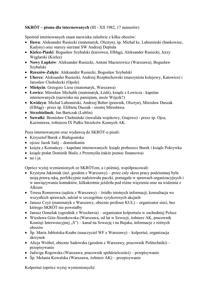 SKRÓT – pismo dla internowanych (III - XII 1982, 17 numerów) Spośród internowanych znam nazwiska zaledwie z kilku obozów: • Iława: Aleksander Rusiecki (matematyk, Olsztyn), śp. Michał ks. Lubomirski (bankowiec, Kadyny) oraz starszy sierŜant SW Andrzej Deptuła • Kielce-Piaski: Bogusław Szybalski (kierowca, Elbląg), Aleksander Rusiecki, Jerzy Węglarski (Kielce) • Nowy Łupków: Aleksander Rusiecki, Antoni Macierewicz (Warszawa), Bogusław Szybalski • Rzeszów-ZałęŜe: Aleksander Rusiecki, Bogusław Szybalski • Uherce: Aleksander Rusiecki, Andrzej Rozpłochowski (maszynista kolejowy, Katowice) i Jarosław Chołodecki (Opole) • Mielęcin: Grzegorz Liese (matematyk, Warszawa) • Łowicz: Mirosław Michalik (matematyk, Łódź), ksiądz z Łowicza - kapelan internowanych (nazwiska nie pamiętam, moŜe Wójcik?) • Kwidzyn: Michał Lubomirski, Andrzej Bober (prawnik, Olsztyn), Mirosław Duszak (Elbląg) - przez śp. ElŜbietę Duszak - siostrę Mirosława. • Strzebielinek: Jan Bartczak (Lublin) • Suwałki: Bronisław Chełmiński (inwalida wojskowy, Grajewo) - przez śp. Ojca, Kazimierza, Ŝołnierza IX Pułku Strzelców Konnych AK. Poza internowanymi oraz wydawcą do SKRÓT-u pisali: • Krzysztof Burek z Białegostoku • ojciec Jacek Salij – dominikanin • księŜa z Komańczy – kapelani internowanych: ksiądz proboszcz Burek i ksiądz Pokrywka • ksiądz prałat Dominik Bialic z Przemyśla (takŜe pomoc finansowa) • no i ja. Oprócz wyŜej wymienionych ze SKRÓTem, a i później, współpracowali: • Krystyna Jakimiak (inŜ. geodeta z Warszawy) – przez cały okres pracy podziemnej była moją prawą ręką, perfekcyjnie nadziewała paczki, pomagała w sprawach organizacyjnych i w nawiązywaniu kontaktów, kilkakrotnie jeździła pod róŜne więzienia oraz na widzenia z Alkiem • Teresa Romerowa (sędzia z Warszawy) – źródło istotnych informacji, konsultacja we wszystkich sprawach, udział w szczególnie ryzykownych akcjach • Janusz CzyŜ (matematyk z Warszawy, obecnie profesor KUL) – organizator sieci, bez którego SKRÓT nie powstałby • Janusz Osmelak (ogrodnik z Wrocławia) – organizator kolportaŜu w zachodniej Polsce • Wiesława GiŜe-Siomkowska (Warszawa, od lat w Szwecji, Ŝołnierz AK, pracownik Komisji Interwencyjnej „S”) – kanał na Szwecję i na Bujaka, informacje z róŜnych obozów • Śp. Maria Jabłońska-Knabe (nauczyciel WF z Warszawy) – kolportaŜ, organizacja skrzynek • Alicja Wróbel, obecnie Sadowska (geodeta z Warszawy, pracownik Politechniki) – przepisywanie • Jadwiga Rogowska (Warszawa, pracownik spółdzielczości) – przepisywanie • Śp. Melania Kowalska (Warszawa, Ŝołnierz AK) – przepisywanie KolportaŜ (oprócz wyŜej wymienionych): • Barbara Roszkowska, obecnie Lech (matematyk z Warszawy, pracownik Politechniki) – łącznik, wyjazdy w teren, druk • Piotr Zaremba (matematyk z Warszawy) • GraŜyna Płachta, obecnie Wiśniewska (Rzeszów, obecnie Warszawa, lekarz psychiatra, wówczas studentka) – łączność • Andrzej Wiśniewski (mąŜ GraŜyny, inŜynier mechanik z Warszawy, wówczas Białystok) oraz kilka innych osób, których nazwisk nie pamiętam bądź nie znałam, głównie studenci Politechniki Warszawskiej lub Wydziału Matematyki Uniwersytetu Warszawskiego. Skrzynki, które udzielały wszelkiej pomocy, takŜe dawały nocleg i Ŝywiły: • Halina i śp. Bohdan Kurowscy (Olsztyn, dziennikarze) • Jan Kowalski (Iława, były więzień polityczny, inwalida, artysta ludowy) • Eleonora Płachta (pielęgniarka z Rzeszowa, matka GraŜyny) Archiwum SKRÓTu, a potem AI „S” i KAT prowadziła śp. dr ElŜbieta Balcerzak z Instytutu Kultury Materialnej PAN. Mikrofilmy sporządzał po wyjściu z internowania operator i reŜyser z Wytwórni Filmów Dokumentalnych w Warszawie, Michał Bukojemski. Wcześniej archiwum SKRÓT-u prowadził i zdjęcia wykonywał Grzegorz Rogala (lat ok. 25), zamieszkały w owym czasie w Warszawie. Skierowany został do mnie z MRK S. W czerwcu 82 dowiedziałam się, Ŝe Grzegorz jest zaprzyjaźniony i współpracuje ze Sławomirem Miastowskim [patrz art. główny - red.] (jak stwierdziła to Teresa Romer m.in. kursowali po salonach konspiracyjnych Warszawy rozdając fotokopie „Naszej Kraty” itp.). Kiedy dowiedziałam się o ich znajomości, zerwałam z Grzegorzem wszelkie kontakty. Nie wiem, czy był on świadomym współpracownikiem SB, czy teŜ raczej wykorzystywał go Miastowski, cieszący się wielkim powaŜaniem w MRK S (pomimo kilkakrotnych moich uprzedzeń zgłaszanych m. in. Danucie Jadczak, łączniczce Z. Romaszewskiego). Kolporterem SKRÓT-u, bardzo oddanym, był student fizyki Grzegorz Ciecióra (Warszawa), który miał teŜ coś wspólnego z KOS-em. Aresztowany wczesną jesienią ‘82 w związku z wpadką kogoś z KOS-a, wygłosił mowę w telewizji. Byliśmy wściekli, ale w SKRÓCIE nie ponieśliśmy Ŝadnych konsekwencji. AGENCJA INFORMACYJNA „SOLIDARNOŚCI” - AI „S” (IV 1983 r. - 08.VII. 1984, 28 numerów po ok. 20-25 stron formatu A4, czasem z dodatkami, nakład do 300 egz.) Korespondenci terenowi w znacznym stopniu rekrutowali się spośród byłych internowanych. Zbierali informacje nie tylko ze swoich miast, częstokroć budując własną sieć w swoich regionach. Najczęściej kontaktowali się bezpośrednio z wydawcą lub z łącznikiem, odbierając swoje egzemplarze i dostarczając materiały do następnego numeru. • Olsztyn: Stefan ŚnieŜko (prokurator), Andrzej Bober (prawnik), a po jego emigracji do USA jego brat Marek Bober, Jerzy Stopa (nauczyciel matematyki w szkole więziennej w Barczewie) • Iława: Andrzej Deptuła, Ludmiła Koczkowska (obecnie Busłowicz, urzędniczka); kolportaŜ: Bogdan Koczkowski, Czesława Blank, Celina Kowalska • Malbork: Józef Goman (szewc) • Toruń: Krystyna Kuta (polonistka, poetka), Krystyna Sienkiewicz (pielęgniarka); kolportaŜ: Roma Beczkiewicz (farmaceu