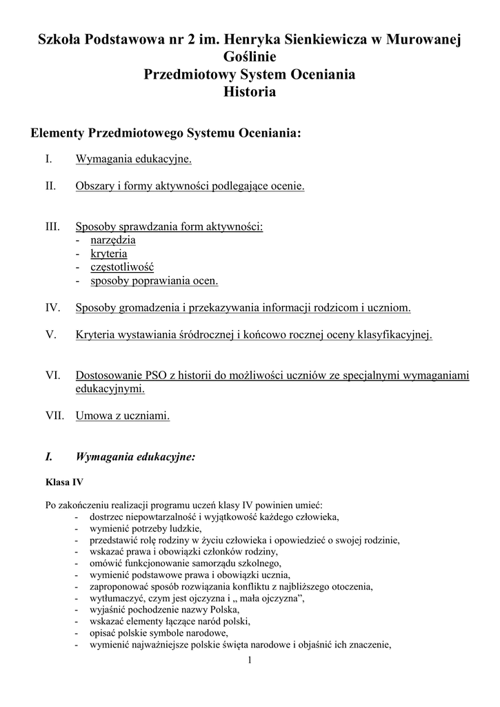 Szkoła Podstawowa nr 2 im. Henryka Sienkiewicza w Murowanej Goślinie Przedmiotowy System Oceniania Historia Elementy Przedmiotowego Systemu Oceniania: I. Wymagania edukacyjne. II. Obszary i formy aktywności podlegające ocenie. III. Sposoby sprawdzania form aktywności: - narzędzia - kryteria - częstotliwość - sposoby poprawiania ocen. IV. Sposoby gromadzenia i przekazywania informacji rodzicom i uczniom. V. Kryteria wystawiania śródrocznej i końcowo rocznej oceny klasyfikacyjnej. VI. Dostosowanie PSO z historii do możliwości uczniów ze specjalnymi wymaganiami edukacyjnymi. VII. Umowa z uczniami. I. Wymagania edukacyjne: Klasa IV Po zakończeniu realizacji programu uczeń klasy IV powinien umieć: - dostrzec niepowtarzalność i wyjątkowość każdego człowieka, - wymienić potrzeby ludzkie, - przedstawić rolę rodziny w życiu człowieka i opowiedzieć o swojej rodzinie, - wskazać prawa i obowiązki członków rodziny, - omówić funkcjonowanie samorządu szkolnego, - wymienić podstawowe prawa i obowiązki ucznia, - zaproponować sposób rozwiązania konfliktu z najbliższego otoczenia, - wytłumaczyć, czym jest ojczyzna i „ mała ojczyzna”, - wyjaśnić pochodzenie nazwy Polska, - wskazać elementy łączące naród polski, - opisać polskie symbole narodowe, - wymienić najważniejsze polskie święta narodowe i objaśnić ich znaczenie, 1 - wskazać na mapie i opisać główne regiony Polski, odnaleźć na mapie swoją miejscowość, na planie wskazać siedzibę władz lokalnych i omówić zakres działalności podać nazwy mniejszości narodowych i etnicznych w Polsce, wskazać na mapie skupiska Polonii na świecie, wyjaśnić, czym zajmuje się historia i historycy, wskazać przyczynę i skutek wydarzenia, podać przykłady różnych źródeł, scharakteryzować archeologię jako naukę pomocniczą historii, stworzyć drzewo genealogiczne swojej rodziny, uporządkować wydarzenia w kolejności chronologicznej, określić wiek wydarzenia i obliczyć upływ czasu między wydarzeniami, przedstawić zasady podziału czasu na ery, tysiąclecia i wieki, zaznaczyć daty na osi czasu i odczytać informacje z osi, ułożyć chronologicznie epoki historyczne, interpretować mapę historyczną, korzystając z symboli w legendzie, odpowiedzieć na krótkie pytania dotyczące tekstu źródłowego, planu, ilustracji, stworzyć krótką wypowiedź o postaci historycznej i wydarzeniu historycznym, określić czas pojawienia się człowieka na ziemi, opisać wygląd człowieka pierwotnego, przedstawić zajęcia ludzi pierwotnych i ich dokonania, opisać życie w Atenach peryklejskich, stosując pojęcia: teatr, filozofia, bogowie olimpijscy, mity, opisać przebieg igrzysk starożytnych, scharakteryzować osiągnięci Rzymu w dziedzinie prawa, budownictwa (drogi, wodociągi), opisać narodziny chrześcijaństwa i jego rozwój w starożytności. Klasa V Po zakończeniu realizacji programu uczeń klasy V powinien umieć: - wskazać na mapie obszar zajmowany przez plemiona polskie oraz terytorium państwa Mieszka I, wymienić korzyści płynące z przyjęcia przez Polskę chrześcijaństwa, scharakteryzować postać św. Wojciecha i wymienić postanowienia zjazdu gnieźnieńskiego, wymienić pierwszego króla Polski i wskazać jego osiągnięcia, określić rolę Kościoła w średniowieczu, omówić cechy budowli romańskich i gotyckich, przedstawić życie codzienne mieszkańców miast i wsi/zajęcia, obyczaje, warunki życia w średniowieczu, przedstawić prawa i obowiązki władcy, opowiedzieć o funkcjonowaniu dworu królewskiego, określić miejsca powstawania grodów i miast, wymienić funkcje grodu i zajęcia ich mieszkańców, wymienić zajęcia zakonników, opisać wygląd średniowiecznego miasta, opisać wygląd zamku rycerskiego i omówić jego funkcje, określić miejsca budowy zamków, wskazać etapy w karierze rycerza, omówić różnice między miastem i wsią, określić przyczyny sprowadzenia krzyżaków do Polski, 2 - przedstawić zasługi Władysława Łokietka i Kazimierza Wielkiego, - wyjaśnić przyczyny unii polsko – litewskiej, - wymienić głównych odkrywców i ich dokonania oraz określić skutki odkryć, - opisać życie dworskie na Wawelu w okresie panowania Zygmuntów, - omówić zajęcia szlachty polskiej, - omawiać zasady sprawowania władzy w Rzeczypospolitej XVI -_XVIII w., - posługiwać się taśmą czasu, - dokonywać obliczeń chronologicznych, wymienić twórców renesansu we Włoszech u w Polsce/Michał Anioł, Rafael, Leonardo Da Vinci, Mikołaj Kopernik, Mikołaj Rej, Jan Kochanowski/, - wyjaśnić pojęcia: renesans i humanizm, - przedstawiać przemiany gospodarcze i w oświacie w drugiej połowie XVIII w., - omawiać próby ratowania Polski w XVIII w., - wskazywać na mapie ziemie utracone w wyniku rozbiorów Polski, - określać przyczyny upadku rzeczpospolitej w XVIII w., Klasa VI Po zakończeniu realizacji programu uczeń klasy VI powinien: - rozumieć pojęcia odrodzenie, reformacja itd., znać przyczyny i skutki odkryć geograficznych, wymienić podróżników i odkrywców, rozpoznawać zabytki architektury renesansu i baroku, znać przyczyny rozłamu w Kościele katolickim, znać najważniejsze wydarzenia za panowania ostatnich Jagiellonów (hołd pruski, unia realna), wymienić twórców renesansu we Włoszech u w Polsce/Michał Anioł, Rafael, Leonardo Da Vinci, Mikołaj Kopernik, Mikołaj Rej, Jan Kochanowski/, wymienia grupy społeczne w XVI w., omawiać zasady sprawowania władzy w Rzeczypospolitej XVI -_XVIII w., wskazywać przyczyny i skutki wojen z sąsiadami w XVII w., rozumieć zasady trójpodziału władzy/ Monteskiusz / w XVII w. , przedstawiać przemiany gospodarcze i w oświacie w drugiej połowie XVIII w., omawiać próby ratowania Polski w XVIII w., wskazywać na mapie ziemie utracone w wyniku rozbiorów Polski, określać przyczyny upadku rzeczpospolitej w XVIII w., znać przyczyny tworzenia Legionów Polskic