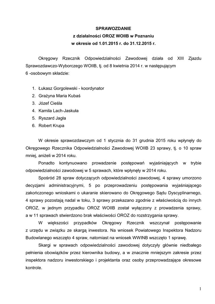 SPRAWOZDANIE z działalności OROZ WOIIB w Poznaniu w okresie od 1.01.2015 r. do 31.12.2015 r. Okręgowy Rzecznik Odpowiedzialności Zawodowej działa od XIII Zjazdu Sprawozdawczo-Wyborczego WOIIB, tj. od 8 kwietnia 2014 r. w następującym 6 -osobowym składzie: 1. Łukasz Gorgolewski - koordynator 2. Grażyna Maria Kubaś 3. Józef Cieśla 4. Kamila Lach-Jaskuła 5. Ryszard Jagła 6. Robert Krupa W okresie sprawozdawczym od 1 stycznia do 31 grudnia 2015 roku wpłynęły do Okręgowego Rzecznika Odpowiedzialności Zawodowej WOIIB 23 sprawy, tj. o 10 spraw mniej, aniżeli w 2014 roku. Ponadto kontynuowano prowadzenie postępowań wyjaśniających w trybie odpowiedzialności zawodowej w 5 sprawach, które wpłynęły w 2014 roku. Spośród 28 spraw dotyczących odpowiedzialności zawodowej, 4 sprawy umorzono decyzjami administracyjnymi, 5 po przeprowadzeniu postępowania wyjaśniającego zakończonego wnioskami o ukaranie skierowano do Okręgowego Sądu Dyscyplinarnego, 4 sprawy pozostają nadal w toku, 3 sprawy przekazano zgodnie z właściwością do innych OROZ, w jednym przypadku OROZ WOIIB został wyłączony z prowadzenia sprawy, a w 11 sprawach stwierdzono brak właściwości OROZ do rozstrzygania sprawy. W większości przypadków Okręgowy Rzecznik wszczynał postępowanie z urzędu w związku ze skargą inwestora. Na wniosek Powiatowego Inspektora Nadzoru Budowlanego wszczęto 4 spraw, natomiast na wniosek WWINB wszczęto 1 sprawę. Skargi w sprawach odpowiedzialności zawodowej dotyczyły głównie niedbałego pełnienia obowiązków przez kierownika budowy, a w znacznie mniejszym zakresie przez inspektora nadzoru inwestorskiego i projektanta oraz osoby przeprowadzające okresowe kontrole. 1 Krajowy Rzecznik Odpowiedzialności Zawodowej PIIB, do którego w ramach sprawowanego nadzoru nad działalnością okręgowych rzeczników, przekazywane są wszystkie ostateczne decyzje, nie zgłosił dotychczas żadnych uwag co do działalności OROZ WOIIB w tym zakresie i poprawności wydanych przez Rzeczników decyzji administracyjnych. Także kontrola przeprowadzona w dniu 16.11.2015 r. przez Krajowego Rzecznika nie wykazała żadnych nieprawidłowości w działalności Okręgowego Rzecznika WOIIB. W dniu 3 lipca br. radca prawny PIIB przeprowadził w siedzibie WOIIB przy ul. Dworkowej 14 w Poznaniu, szkolenie dla Okręgowych Rzeczników i sędziów OSD. Podczas tych szkoleń omawiano w nawiązaniu do konkretnych spraw, problematykę związaną ze stosowaniem procedur w sprawach odpowiedzialności zawodowej i dyscyplinarnej, a także wyjaśniono różne wątpliwości powstałe w trakcie prowadzenia bieżących postępowań. Okręgowy Rzecznik Odpowiedzialności Zawodowej wspólnie z Sekcją Projektowania Zespołu ds. Procesów Budowlanych WOIIB zorganizował w siedzibie WOIIB przy ul. Dworkowej 14 w Poznaniu szkolenie dla członków izby na temat „Odpowiedzialność inżynierów pełniących samodzielne funkcje w budownictwie i ich ochrona”. Część pierwsza odbyła się 1 października 2015 r. i dotyczyła odpowiedzialności inżynierów w świetle obowiązującego prawa. Poprowadziła je mec. Jolanta Szewczyk radca prawny PIIB. Część druga poświęcona ubezpieczeniom inżynierów budownictwa od odpowiedzialności cywilnej, poprowadzona przez przedstawicielkę Ergo Hestia odbyła się w dniu 8 października br. W szkoleniach uczestniczyli również Okręgowi Rzecznicy i sędziowie OSD. Okręgowy Rzecznik – koordynator wziął udział w szkoleniach zorganizowanych przez Polską Izbę Inżynierów Budownictwa, które odbyły się w dniach 15-16 maja br. w Serocku oraz 25-26 listopada br. w Warszawie. Szkolenia te prowadzone przez radców prawnych KROZ i KSD dotyczyło głównie problemów związanych z prawidłowym zastosowaniem odpowiednich procedur administracyjno-prawnych, właściwej interpretacji przepisów prawa, najnowszego orzecznictwa sądów administracyjnych oraz trybu postępowania i sposobu rozstrzygania konkretnych spraw. Okręgowy Rzecznik – koordynator wziął udział w dniu 27 listopada br w Warszawie w spotkaniu z przedstawicielami Głównego Urzędu i Wojewódzkich Inspektoratów Nadzoru Budowlanego z Rzecznikami Odpowiedzialności Zawodowej i sędziami SD. W roku sprawozdawczym w dniach 3 lipca oraz 16 listopada odbyły się również 2 zebrania Okręgowych Rzeczników Odpowiedzialności Zawodowej WOIIB, podczas 2 których omówiono sprawy organizacyjne, a także różne problemy merytoryczne i formalno prawne związane z postępowaniami prowadzonymi w konkretnych sprawach. Okręgowy Rzecznik Odpowiedzialności Zawodowej odbywa, tak jak w latach poprzednich, cotygodniowe dyżury we wtorki w godzinach od 14 00 do 1500 w siedzibie Izby przy ul. Dworkowej 14, w trakcie których prowadzone są rozmowy ze wszystkimi zainteresowanymi w sprawach dotyczących odpowiedzialności zawodowej i dyscyplinarnej osób pełniących samodzielne funkcje techniczne w budownictwie. Obsługę administracyjną biura Okręgowego Rzecznika Odpowiedzialności Zawodowej WOIIB zapewnia Pan mgr Adam Podkowiński. Okręgowy Rzecznik Odpowiedzialności Zawodowej Wielkopolskiej Okręgowej Izby Inżynierów Budownictwa Koordynator mgr inż. Łukasz Gorgolewski 3