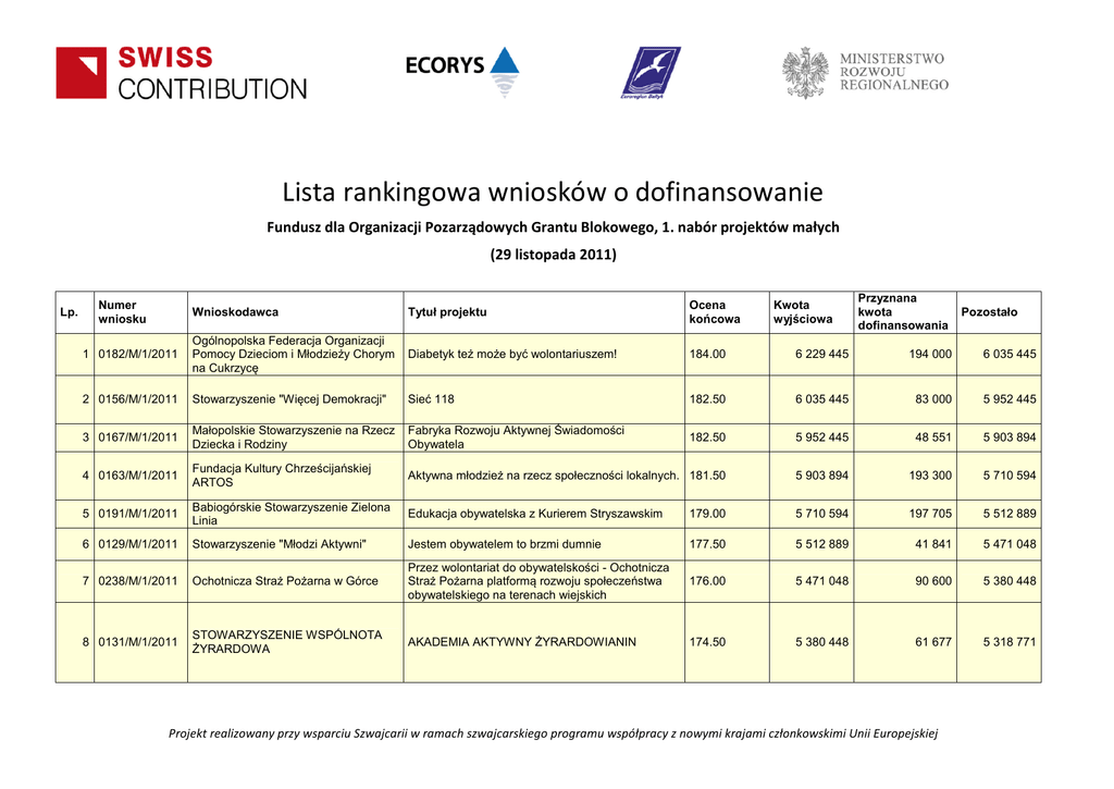 Lista rankingowa wniosków o dofinansowanie Fundusz dla Organizacji Pozarządowych Grantu Blokowego, 1. nabór projektów małych (29 listopada 2011) Lp. Numer wniosku Kwota wyjściowa Przyznana kwota dofinansowania Wnioskodawca Tytuł projektu Ocena końcowa 1 0182/M/1/2011 Ogólnopolska Federacja Organizacji Pomocy Dzieciom i Młodzieży Chorym na Cukrzycę Diabetyk też może być wolontariuszem! 184.00 6 229 445 194 000 6 035 445 2 0156/M/1/2011 Stowarzyszenie "Więcej Demokracji" Sieć 118 182.50 6 035 445 83 000 5 952 445 3 0167/M/1/2011 Małopolskie Stowarzyszenie na Rzecz Dziecka i Rodziny Fabryka Rozwoju Aktywnej Świadomości Obywatela 182.50 5 952 445 48 551 5 903 894 4 0163/M/1/2011 Fundacja Kultury Chrześcijańskiej ARTOS Aktywna młodzież na rzecz społeczności lokalnych. 181.50 5 903 894 193 300 5 710 594 5 0191/M/1/2011 Babiogórskie Stowarzyszenie Zielona Linia Edukacja obywatelska z Kurierem Stryszawskim 179.00 5 710 594 197 705 5 512 889 6 0129/M/1/2011 Stowarzyszenie "Młodzi Aktywni" Jestem obywatelem to brzmi dumnie 177.50 5 512 889 41 841 5 471 048 7 0238/M/1/2011 Ochotnicza Straż Pożarna w Górce Przez wolontariat do obywatelskości - Ochotnicza Straż Pożarna platformą rozwoju społeczeństwa obywatelskiego na terenach wiejskich 176.00 5 471 048 90 600 5 380 448 8 0131/M/1/2011 STOWARZYSZENIE WSPÓLNOTA ŻYRARDOWA AKADEMIA AKTYWNY ŻYRARDOWIANIN 174.50 5 380 448 61 677 5 318 771 Projekt realizowany przy wsparciu Szwajcarii w ramach szwajcarskiego programu współpracy z nowymi krajami członkowskimi Unii Europejskiej Pozostało Lp. Numer wniosku Wnioskodawca 9 0101/M/1/2011 Fundacja Aktywności Zawodowej Tytuł projektu Pracodawco, znam swoje prawa - rozwój świadomości obywatelskiej wśród osób niepełnosprawnych MAM SWOJE ZDANIE - EDUKACJA DLA DEMOKRACJI W SZKOŁACH ROLNICZYCH Ocena końcowa Kwota wyjściowa Przyznana kwota dofinansowania Pozostało 174.00 5 318 771 177 912 5 140 859 174.00 5 140 859 197 200 4 943 659 10 0048/M/1/2011 Fundacja Rolniczej Różnorodności Biologicznej AgriNatura 11 0230/M/1/2011 Zabrzańskie Stowarzyszenie Kobiet i ich Rodzin Akademia Obywatelska dla Seniora 173.00 4 943 659 174 627 4 769 032 12 0218/M/1/2011 Stowarzyszenie Wielokulturowy Zgierz Monitorujemy i animujemy - niezależna gazeta obywatelska w Zgierzu. 172.00 4 769 032 175 211 4 593 821 13 0012/M/1/2011 STOWARZYSZENIE INICJATYW LOKALNYCH BIAŁOBRZESKA Ochota na obywatelskość 172.00 4 593 821 127 296 4 466 525 14 0153/M/1/2011 Stowarzyszenie Równe Szanse Niemieckie doświadczenie szansą rozwoju III sektora na Podkarpaciu. 171.50 4 466 525 194 140 4 272 385 15 0102/M/1/2011 DOBRO KULTURY- Fundacja dla Ochrony Europejskiego Dziedzictwa Kulturowego Uniwersytet Obywatelski dla dzieci 171.00 4 272 385 194 220 4 078 165 Projekt realizowany przy wsparciu Szwajcarii w ramach szwajcarskiego programu współpracy z nowymi krajami członkowskimi Unii Europejskiej Numer wniosku Kwota wyjściowa Przyznana kwota dofinansowania Wnioskodawca Tytuł projektu Ocena końcowa 16 0211/M/1/2011 Fundacja Ubik Obywatel MAMA 171.00 4 078 165 197 380 3 880 785 17 0209/M/1/2011 OCHOTNICZA STRAŻ POŻARNA CIĘŻKOWICE Od gadania do działania - Obywatelska Gmina 170.50 3 880 785 70 794 3 809 991 18 0070/M/1/2011 Stowarzyszenie Nauczycieli Edukacji Początkowej Obywatele Małych Szkół 170.00 3 809 991 197 736 3 612 255 19 0244/M/1/2011 Ognisko Towarzystwa Krzewienia Kultury Fizycznej „Pogórze” w Ciężkowicach AKCJA MŁODYCH - Rozwój wolontariatu na rzecz społeczności lokalnych drogą do budowy społeczeństwa obywatelskiego 169.00 3 612 255 77 000 3 535 255 20 0100/M/1/2011 Stowarzyszenie Edukacji Nieformalnej "Meritum" Miechowskie Centrum Aktywności Lokalnej 168.00 3 535 255 111 791 3 423 464 21 0096/M/1/2011 Stowarzyszenie Pomocy Dzieciom Specjalnej Troski Jestem mądrym konsumentem od dziecka 167.00 3 423 464 193 000 3 230 464 Lp. Projekt realizowany przy wsparciu Szwajcarii w ramach szwajcarskiego programu współpracy z nowymi krajami członkowskimi Unii Europejskiej Pozostało Numer wniosku Kwota wyjściowa Przyznana kwota dofinansowania Wnioskodawca Tytuł projektu Ocena końcowa 22 0246/M/1/2011 Stowarzyszenie KRA Kreatywne Rozwojowe Aktywne Organizacje Pozarządowe 166.50 3 230 464 154 035 3 076 429 23 0098/M/1/2011 Stowarzyszenie Mała Ojczyzna WIESZ WIĘCEJ - DECYDUJESZ 164.50 3 076 429 79 335 2 997 094 24 0072/M/1/2011 Stowarzyszenie Klub Kobiet Kreatywnych Cieszyńska szkoła obywatelstwa: po obu stronach Olzy 164.50 2 997 094 158 727 2 838 367 25 0073/M/1/2011 Stowarzyszenie KOFE(M)INA Aktywni - Równi - Skuteczni 164.00 2 838 367 79 641 2 758 726 26 0243/M/1/2011 Stowarzyszenie KRA Wolontariusz w placówce 164.00 2 758 726 127 998 2 630 728 27 0020/M/1/2011 Stowarzyszenie Federacja Zielonych Grupa Krakowska Tiry na Tory – aktywizacja, monitoring i partycypacja społeczna. 161.00 2 630 728 186 849 2 443 879 28 0248/M/1/2011 Fundacja Dobrego Odbioru Civilia.pl 160.00 2 443 879 190 500 2 253 379 29 0175/M/1/2011 Fundacja Aktywności Zawodowej Administracja publiczna a polski rynek pracy 160.00 2 253 379 130 518 2 122 861 30 0107/M/1/2011 Stowarzyszenie Progres Akademia Partycypacji Społecznej - Przystanek Animacja 160.00 2 122 861 195 900 1 926 961 31 0065/M/1/2011 Centrum Monitorowania Odpowiedzialności Biznesu Świadomy konsument - aktywny obywatel 159.50 1 926 961 36 800 1 890 161 32 0228/M/1/2011 Stowarzyszenie Kół Gospodyń Wiejskich Gminy Niwiska Wiedza kluczem do współdziałania w organizacjach pozarządowych 159.50 1 890 161 36 620 1 853 541 Lp. Projekt realizowany przy wsparciu Szwajcarii w ramach szwajcarskiego programu współpracy z nowymi krajami członkowskimi Unii Europejskiej Pozostało Numer wniosku Kwota wyjściowa Przyznana kwota dofinansowania Wnioskodawca Tytuł projektu Ocena końcowa 33 0006/M/1/2011 Pospolite Ruszenie Szlachty Ziemi Krakowskiej DEMOkracja. Interaktywne Lekcje Demokracji dla młodzieży województwa małopolskieg