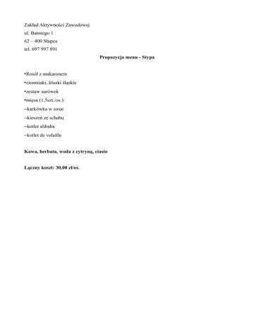 Zakład Aktywności Zawodowej ul. Batorego 1 62 – 400 Słupca tel. 697 997 891 Propozycja menu - Stypa •Rosół z makaronem •ziemniaki, kluski śląskie •zestaw surówek •mięsa (1,5szt./os.): –karkówka w sosie –kieszeń ze schabu –kotlet alibaba –kotlet de volaille Kawa, herbata, woda z cytryną, ciasto Łączny koszt: 30,00 zł/os.
