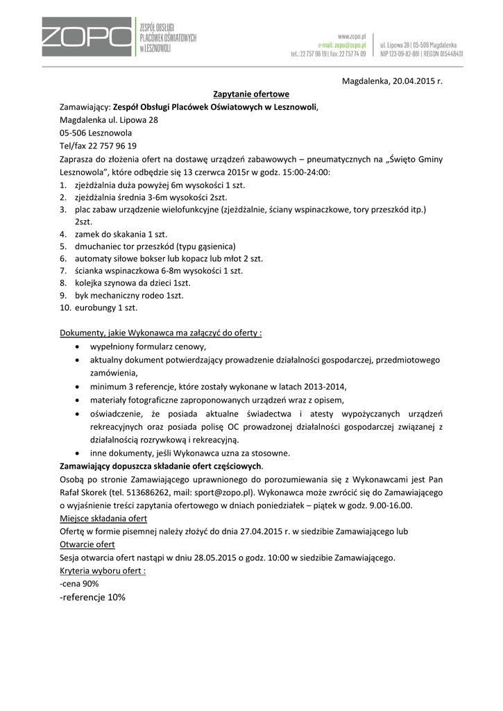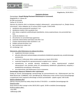 Magdalenka, 20.04.2015 r. Zapytanie ofertowe Zamawiający: Zespół Obsługi Placówek Oświatowych w Lesznowoli, Magdalenka ul. Lipowa 28 05-506 Lesznowola Tel/fax 22 757 96 19 Zaprasza do złożenia ofert na dostawę urządzeń zabawowych – pneumatycznych na „Święto Gminy Lesznowola”, które odbędzie się 13 czerwca 2015r w godz. 15:00-24:00: 1. zjeżdżalnia duża powyżej 6m wysokości 1 szt. 2. zjeżdżalnia średnia 3-6m wysokości 2szt. 3. plac zabaw urządzenie wielofunkcyjne (zjeżdżalnie, ściany wspinaczkowe, tory przeszkód itp.) 2szt. 4. zamek do skakania 1 szt. 5. dmuchaniec tor przeszkód (typu gąsienica) 6. automaty siłowe bokser lub kopacz lub młot 2 szt. 7. ścianka wspinaczkowa 6-8m wysokości 1 szt. 8. kolejka szynowa da dzieci 1szt. 9. byk mechaniczny rodeo 1szt. 10. eurobungy 1 szt. Dokumenty, jakie Wykonawca ma załączyć do oferty : • wypełniony formularz cenowy, • aktualny dokument potwierdzający prowadzenie działalności gospodarczej, przedmiotowego zamówienia, • minimum 3 referencje, które zostały wykonane w latach 2013-2014, • materiały fotograficzne zaproponowanych urządzeń wraz z opisem, • oświadczenie, że posiada aktualne świadectwa i atesty wypożyczanych urządzeń rekreacyjnych oraz posiada polisę OC prowadzonej działalności gospodarczej związanej z działalnością rozrywkową i rekreacyjną. • inne dokumenty, jeśli Wykonawca uzna za stosowne. Zamawiający dopuszcza składanie ofert częściowych. Osobą po stronie Zamawiającego uprawnionego do porozumiewania się z Wykonawcami jest Pan Rafał Skorek (tel. 513686262, mail: [email protected]). Wykonawca może zwrócić się do Zamawiającego o wyjaśnienie treści zapytania ofertowego w dniach poniedziałek – piątek w godz. 9.00-16.00. Miejsce składania ofert Ofertę w formie pisemnej należy złożyć do dnia 27.04.2015 r. w siedzibie Zamawiającego lub Otwarcie ofert Sesja otwarcia ofert nastąpi w dniu 28.05.2015 o godz. 10:00 w siedzibie Zamawiającego. Kryteria wyboru ofert : -cena 90% -referencje 10%