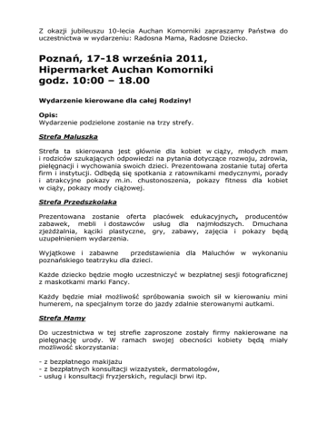Z okazji jubileuszu 10-lecia Auchan Komorniki zapraszamy Państwa do uczestnictwa w wydarzeniu: Radosna Mama, Radosne Dziecko. Poznań, 17-18 września 2011, Hipermarket Auchan Komorniki godz. 10:00 – 18.00 Wydarzenie kierowane dla całej Rodziny! Opis: Wydarzenie podzielone zostanie na trzy strefy. Strefa Maluszka Strefa ta skierowana jest głównie dla kobiet w ciąży, młodych mam i rodziców szukających odpowiedzi na pytania dotyczące rozwoju, zdrowia, pielęgnacji i wychowania swoich dzieci. Prezentowana zostanie tutaj oferta firm i instytucji. Odbędą się spotkania z ratownikami medycznymi, porady i atrakcyjne pokazy m.in. chustonoszenia, pokazy fitness dla kobiet w ciąży, pokazy mody ciążowej. Strefa Przedszkolaka Prezentowana zostanie oferta placówek edukacyjnych, producentów zabawek, mebli i dostawców usług dla najmłodszych. Dmuchana zjeżdżalnia, kąciki plastyczne, gry, zabawy, zajęcia i pokazy będą uzupełnieniem wydarzenia. Wyjątkowe i zabawne przedstawienia dla Maluchów w wykonaniu poznańskiego teatrzyku dla dzieci. Każde dziecko będzie mogło uczestniczyć w bezpłatnej sesji fotograficznej z maskotkami marki Fancy. Każdy będzie miał możliwość spróbowania swoich sił w kierowaniu mini humerem, na specjalnym torze do jazdy zdalnie sterowanymi autkami. Strefa Mamy Do uczestnictwa w tej strefie zaproszone zostały firmy nakierowane na pielęgnację urody. W ramach swojej obecności kobiety będą miały możliwość skorzystania: - z bezpłatnego makijażu - z bezpłatnych konsultacji wizażystek, dermatologów, - usług i konsultacji fryzjerskich, regulacji brwi itp. Przeprowadzane będą także bezpłatne, profilaktyczne badania mammograficzne w mammobusie. W badaniach tych mogą uczestniczyć bezpłatnie kobiety w wieku 50-69 lat. Uwaga! Jesteś mamą? Chcesz coś zmienić w swoim wyglądzie? Przyślij do nas swoje zdjęcie i wygraj metamorfozę z Auchan Komorniki! Zasady są proste: Przyślij na adres [email protected] swoje aktualne zdjęcie wraz z imieniem i nazwiskiem. W komentarzu uzasadnij, dlaczego chcesz się zmienić. Uwaga, w konkursie biorą udział tylko mamy. Wiek nie gra roli! Na Wasze maile i komentarze czekamy od 1 do 15 września 2011 r. do godziny 11:00. Spośród nich jury wybierze pięć najciekawszych zgłoszeń. Werdykt ogłosimy 15 września i od razu poinformujemy o tym zwycięzców. Kolejnym etapem jest metamorfoza w Auchan Komorniki realizowana w dniach 17 i 18 września 2011 r. w Hipermarkecie Auchan Komorniki. Nagroda: W nagrodę nasze laureatki przejdą profesjonalną metamorfozę. Obejmie ona współpracę ze stylistą, dobór fryzury, makijaż, dobór stroju, sesję zdjęciową. Parterem Głównym Radosna Mama, Radosne Dziecko jest: SwiadomaMama.pl Parterami wydarzenia są: www.baby-shower.pl, www.dobra-mama.pl, Nasz Głos Poznański, Telewizja WTK, epoznan.pl