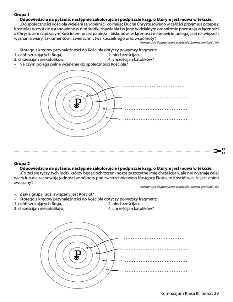 Grupa 1 Odpowiedzcie na pytania, następnie zakolorujcie i podpiszcie krąg, o którym jest mowa w tekście. „Do społeczności Kościoła wcieleni są w pełni ci, co mając Ducha Chrystusowego w całości przyjmują przepisy Kościoła i wszystkie ustanowione w nim środki zbawienia i w jego widzialnym organizmie pozostają w łączności z Chrystusem rządzącym Kościołem przez papieża i biskupów, w łączności mianowicie polegającej na więzach wyznania wiary, sakramentów i zwierzchnictwa kościelnego oraz wspólnoty”. (Konstytucja dogmatyczna o Kościele „Lumen gentium”, 14) – Którego z kręgów przynależności do Kościoła dotyczy powyższy fragment: 1. osób szukających Boga, 2. niechrześcijan, 3. chrześcijan niekatolików, 4. chrześcijan katolików? – Na czym polega pełne wcielenie do społeczności Kościoła? ……………………………… ……………………………… ……………………………… ……………………………… Grupa 2 Odpowiedzcie na pytania, następnie zakolorujcie i podpiszcie krąg, o którym jest mowa w tekście. „Co zaś się tyczy tych ludzi, którzy będąc ochrzczeni noszą zaszczytne imię chrześcijan, ale nie wyznają całej wiary lub nie zachowują jedności wspólnoty pod zwierzchnictwem Następcy Piotra, to Kościół wie, że jest z nimi związany”. (Konstytucja dogmatyczna o Kościele „Lumen gentium”, 15) – Z jaką grupą ludzi związany jest Kościół? – Którego z kręgów przynależności do Kościoła dotyczy powyższy fragment: 1. osób szukających Boga, 2. niechrześcijan, 3. chrześcijan niekatolików, 4. chrześcijan katolików? ……………………………… ……………………………… ……………………………… ……………………………… Gimnazjum Klasa III, temat 29 Grupa 3 Odpowiedzcie na pytania, następnie zakolorujcie i podpiszcie krąg, o którym jest mowa w tekście. „Ci wreszcie, którzy jeszcze nie przyjęli Ewangelii, w rozmaity sposób przyporządkowani są do Ludu Bożego. Przede wszystkim więc naród, który pierwszy otrzymał przymierze i obietnice i z którego narodził się Chrystus (…). Plan zbawienia obejmuje także i tych, którzy uznają Stworzyciela, wśród nich zaś w pierwszym rzędzie muzułmanów, oni bowiem wyznając, iż zachowują wiarę Abrahama, czczą wraz z nami Boga jedynego i miłosiernego, który sądzić będzie ludzi w dzień ostateczny”. (Konstytucja dogmatyczna o Kościele „Lumen gentium”, 16) – Kto jest przyporządkowany do ludu Bożego? – Którego z kręgów przynależności do Kościoła dotyczy powyższy fragment: 1. osób szukających Boga, 2. niechrześcijan, 3. chrześcijan niekatolików, 4. chrześcijan katolików? ……………………………… ……………………………… ……………………………… ……………………………… Grupa 4 Odpowiedzcie na pytania, następnie zakolorujcie i podpiszcie krąg, o którym jest mowa w tekście. „Także od innych, którzy szukają nieznanego Boga po omacku i wśród cielesnych wyobrażeń, Bóg sam również nie jest daleko, skoro wszystkim daje życie, tchnienie i wszystko (por. Dz 17,25-28), a Zbawiciel chciał, aby wszyscy ludzie byli zbawieni (por. 1 Tm 2,4). Ci bowiem, którzy bez własnej winy nie znając Ewangelii Chrystusowej i Kościoła Chrystusowego, szczerym sercem jednak szukają Boga i wolę Jego przez nakaz sumienia poznaną starają się pod wpływem łaski pełnić czynem, mogą osiągnąć wieczne zbawienie”. (Konstytucja dogmatyczna o Kościele „Lumen gentium”, 16) – W jaki sposób ludzie szukają Boga? – Którego z kręgów przynależności do Kościoła dotyczy powyższy fragment: 1. osób szukających Boga, 2. niechrześcijan, 3. chrześcijan niekatolików, 4. chrześcijan katolików? ……………………………… ……………………………… ……………………………… ……………………………… Gimnazjum Klasa III, temat 29 Zakreśl lub zamaluj dowolnym kolorem pięć wypowiedzi, które uważasz za najważniejsze. W puste pola wpisz swoje propozycje. Jestem chrześcijaninem, więc… nie chodzi o to, żeby zmieniać wyznanie…, ale żeby… pogłębiać swoją wiarę przez życie sakramentalne odnosić się z szacunkiem do wyznawców innych religii w rozwoju wiary wykorzystać poznane zwyczaje i tra- zachowywać chrześcijańskie tradycje w rodzinie dycje poznawać chrześcijańskie tradycje innych wyznań prowadzić do wiary tych, którzy poszukują Boga szanować wierzących innych wyznań dawać przykład wiary swoim życiem modlić się o jedność Kościoła modlić się wspólnie z osobami innych wyznań współdziałać z osobami innych wyznań w pomocy potrzebującym poznawać Boga, czytając Pismo Święte Na podstawie informacji zaczerpniętych z prasy, Internetu itd. przygotujcie plakat lub utwór muzyczny bądź scenkę na otrzymany temat. Jestem dumny z bycia katolikiem (bliskość Jezusa przez siedem sakramentów, słowo Boże). Na podstawie informacji zaczerpniętych z prasy, Internetu itd. przygotujcie plakat lub utwór muzyczny bądź scenkę na otrzymany temat. Poznaję wyznania chrześcijańskie w Polsce (charakterystyka, zasięg, liczebność). Na podstawie informacji zaczerpniętych z prasy, Internetu itd. przygotujcie plakat lub utwór muzyczny bądź scenkę na otrzymany temat. Poznaję główne ośrodki chrześcijańskie w Polsce (katolicy – Jasna Góra, prawosławni – Grabarka, protestanci – Cieszyn). Na podstawie informacji zaczerpniętych z prasy, Internetu itd. przygotujcie plakat lub utwór muzyczny bądź scenkę na otrzymany temat. Pismo Święte w życiu chrześcijan (słowo Boga skierowane do człowieka, konieczność codziennej lektury, poznawanie nauki Jezusa, świadectwo życia Jezusa…). Gimnazjum Klasa III, temat 29