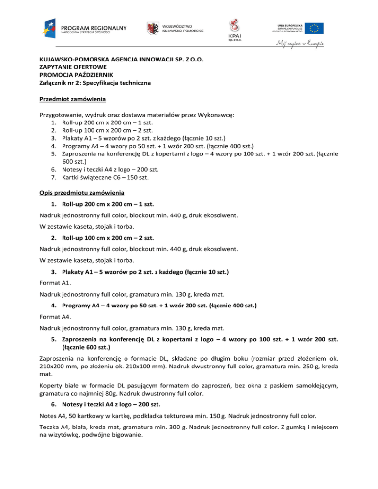 KUJAWSKO-POMORSKA AGENCJA INNOWACJI SP. Z O.O. ZAPYTANIE OFERTOWE PROMOCJA PAŹDZIERNIK Załącznik nr 2: Specyfikacja techniczna Przedmiot zamówienia Przygotowanie, wydruk oraz dostawa materiałów przez Wykonawcę: 1. Roll-up 200 cm x 200 cm – 1 szt. 2. Roll-up 100 cm x 200 cm – 2 szt. 3. Plakaty A1 – 5 wzorów po 2 szt. z każdego (łącznie 10 szt.) 4. Programy A4 – 4 wzory po 50 szt. + 1 wzór 200 szt. (łącznie 400 szt.) 5. Zaproszenia na konferencję DL z kopertami z logo – 4 wzory po 100 szt. + 1 wzór 200 szt. (łącznie 600 szt.) 6. Notesy i teczki A4 z logo – 200 szt. 7. Kartki świąteczne C6 – 150 szt. Opis przedmiotu zamówienia 1. Roll-up 200 cm x 200 cm – 1 szt. Nadruk jednostronny full color, blockout min. 440 g, druk ekosolwent. W zestawie kaseta, stojak i torba. 2. Roll-up 100 cm x 200 cm – 2 szt. Nadruk jednostronny full color, blockout min. 440 g, druk ekosolwent. W zestawie kaseta, stojak i torba. 3. Plakaty A1 – 5 wzorów po 2 szt. z każdego (łącznie 10 szt.) Format A1. Nadruk jednostronny full color, gramatura min. 130 g, kreda mat. 4. Programy A4 – 4 wzory po 50 szt. + 1 wzór 200 szt. (łącznie 400 szt.) Format A4. Nadruk jednostronny full color, gramatura min. 130 g, kreda mat. 5. Zaproszenia na konferencję DL z kopertami z logo – 4 wzory po 100 szt. + 1 wzór 200 szt. (łącznie 600 szt.) Zaproszenia na konferencję o formacie DL, składane po długim boku (rozmiar przed złożeniem ok. 210x200 mm, po złożeniu ok. 210x100 mm). Nadruk dwustronny full color, gramatura min. 250 g, kreda mat. Koperty białe w formacie DL pasującym formatem do zaproszeń, bez okna z paskiem samoklejącym, gramatura co najmniej 80g. Nadruk dwustronny full color. 6. Notesy i teczki A4 z logo – 200 szt. Notes A4, 50 kartkowy w kartkę, podkładka tekturowa min. 150 g. Nadruk jednostronny full color. Teczka A4, biała, kreda mat, gramatura min. 300 g. Nadruk jednostronny full color. Z gumką i miejscem na wizytówkę, podwójne bigowanie. 7. Kartki świąteczne C6 – 150 szt. Kartki świąteczne o formacie A6 składane po długim boku (rozmiar przed złożeniem ok. 210x148 mm, po złożeniu ok. 105x148mm). Nadruk dwustronny full color, gramatura min. 250g, kreda mat. W ramach zamówienia należy uwzględnić: dostosowanie projektu graficznego uzgodnionego z Zamawiającym, transport i dostawę, skład i montaż poszczególnych materiałów. Przed wydrukiem materiałów Wykonawca jest zobowiązany przesłać Zamawiającemu drogą elektroniczną pliki przygotowane do druku, z wykorzystaniem przesłanych przez Zamawiającego materiałów, do ostatecznej akceptacji. Ocena zamówienia 1. Oferta powinna zawierać cenę (z uwzględnieniem wszystkich wymienionych kosztów) za całość przedmiotu zamówienia. 2. Zamawiający nie dopuszcza możliwości składania ofert częściowych. 3. Zamawiający zastrzega sobie prawo do wybrania dowolnej ilości (w ramach podanych ilości dla każdego towaru), przedmiotu zamówienia. Zamawiający zastrzega sobie prawo do pozostawienia niniejszego zapytania bez rozstrzygnięcia. 4. Zamawiający zastrzega sobie możliwość unieważnienia postępowania bez podania przyczyny. W przypadku unieważnienia postępowania, Zamawiający nie ponosi kosztów postępowania. 5. Oferta musi zawierać: Wypełniony i podpisany formularz ofertowy (załącznik nr 1); Podpisaną (zatwierdzoną) specyfikację techniczną (załącznik nr 2); Parafowany (zatwierdzony) wzór umowy (załącznik nr 3); Wymagane jest dołączenie listów referencyjnych i/lub zdjęć, wizualizacji, próbek, portfolio itd. wcześniejszych realizacji zbliżonych do przedmiotu zamówienia (lub linku do strony internetowej 6. W toku badania i oceny ofert Zamawiający może oczekiwać od Oferenta wyjaśnień dotyczących treści złożonych ofert, oraz ich uzupełnienia. Zamawiający zastrzega sobie prawo do przeprowadzenia rozmów z wybranymi oferentami w kwestiach złożonej przez nich oferty. 8. Z wykonawcą zostanie zawarta umowa według załączonego wzoru. Zamawiający zastrzega sobie prawo do zmian w umowie. Kryteria wyboru najkorzystniejszej oferty: Dla ofert spełniających wymagania zastosowany zostanie algorytm (dla poszczególnych części przedmiotu zamówienia): a/ 60% - cena brutto – skala 0-60 pkt, oferta najkorzystniejsza 60 pkt, wyliczenie proporcjonalne, b/ 40% - 40 pkt dla oferty o najlepszej jakości, specyfikacji technicznej, terminie realizacji, estetyki itp., na podstawie opisu oferty. ……………………………………………………… Data podpis pieczęć nazwa